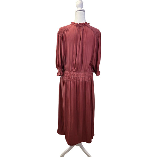 Anthro Current Air Ruched Shoulder Ruffle Trim Boho Midi Dress Size Large