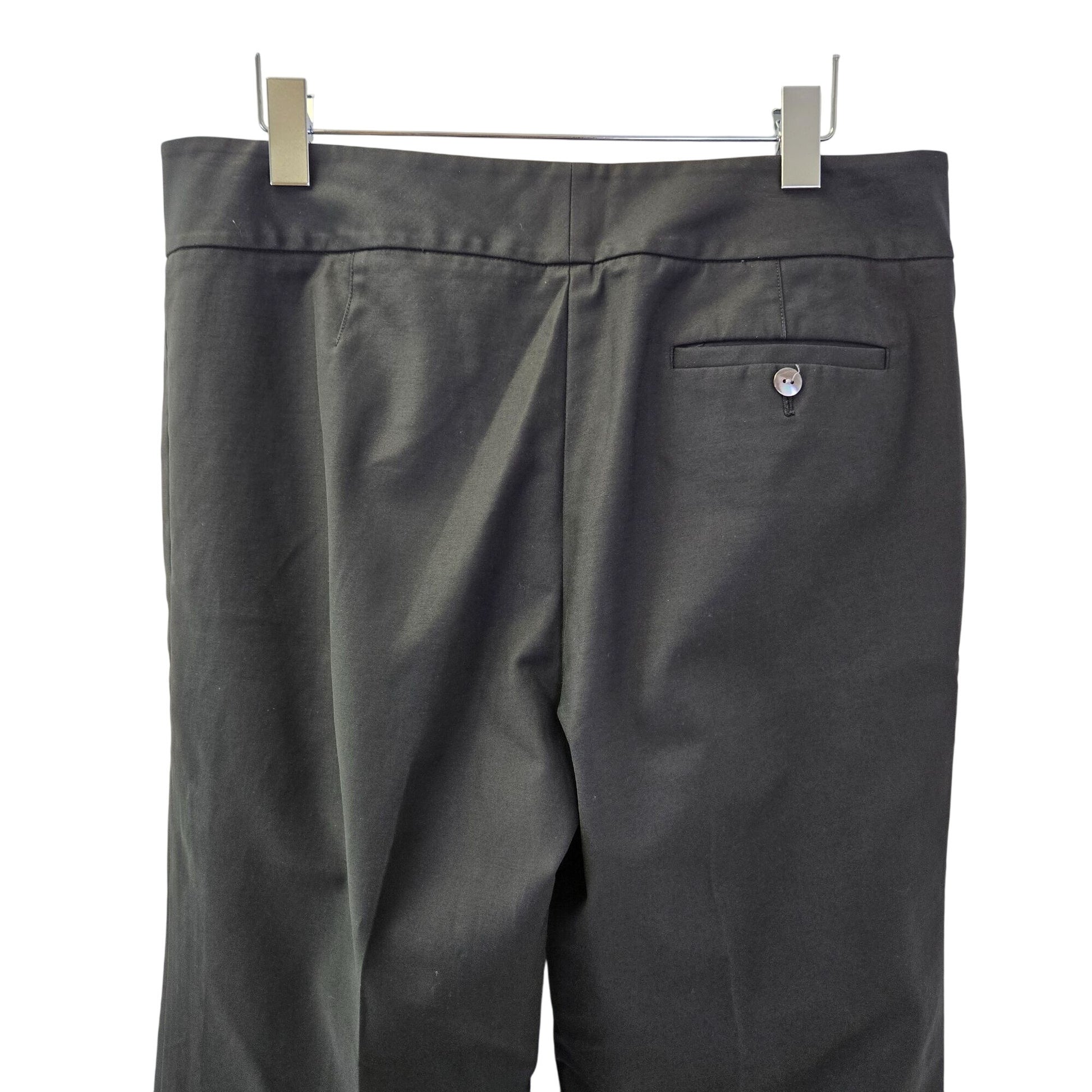 Heavier weight wide leg trouser pants that are great to wear for work or even a more casual event. One button closure pocket on the front and one on the back. These have some very faint fading near the zipper but other than that, these are still in really good condition.