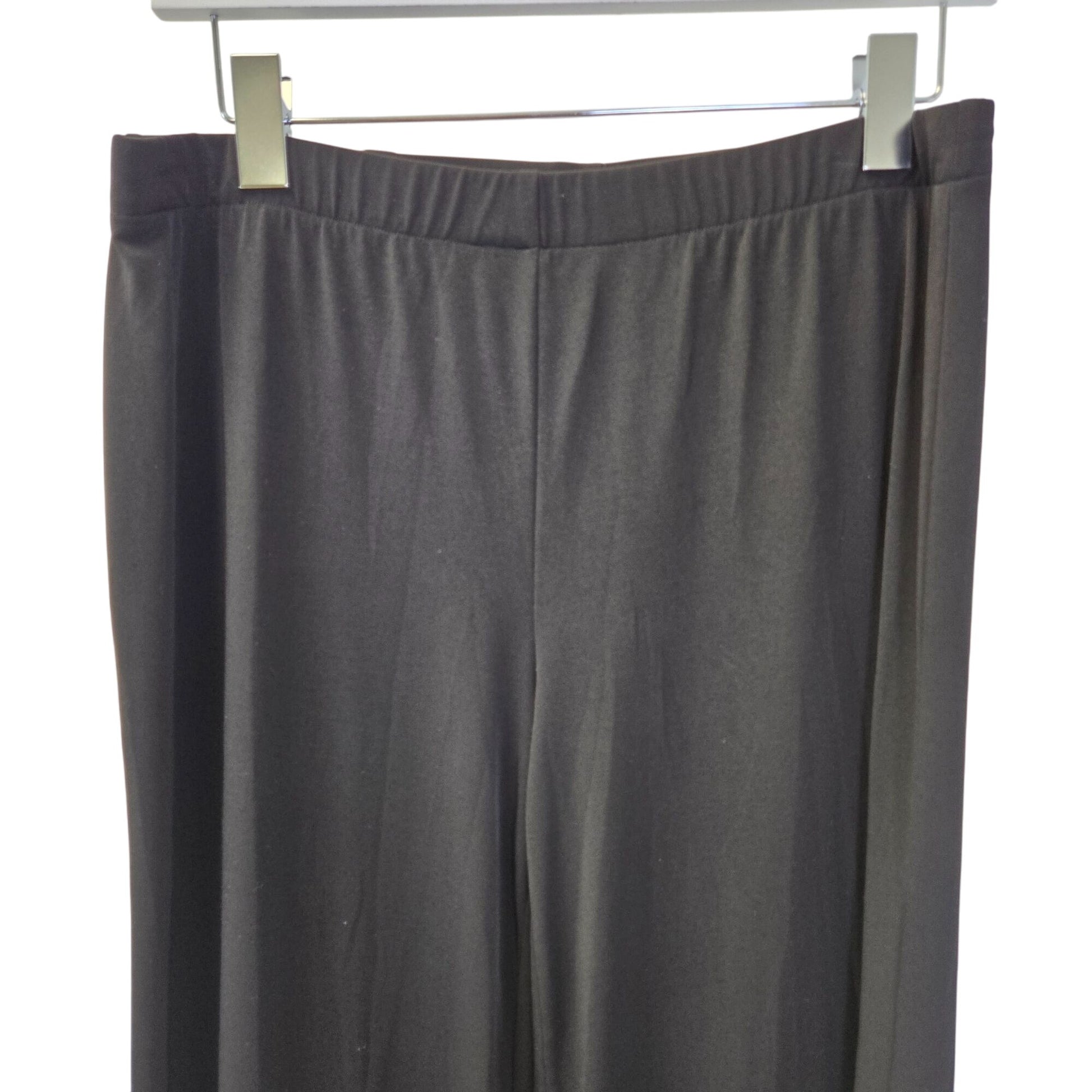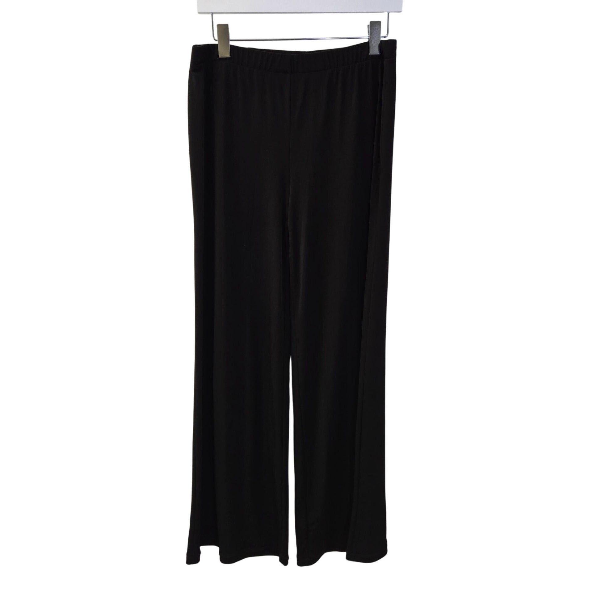 Medium weight but still flowy wide leg pull-on pants that have an elastic waistband. Great to pair with heels, boots or even sneakers. Pair with a sweater, blouse or crop top.