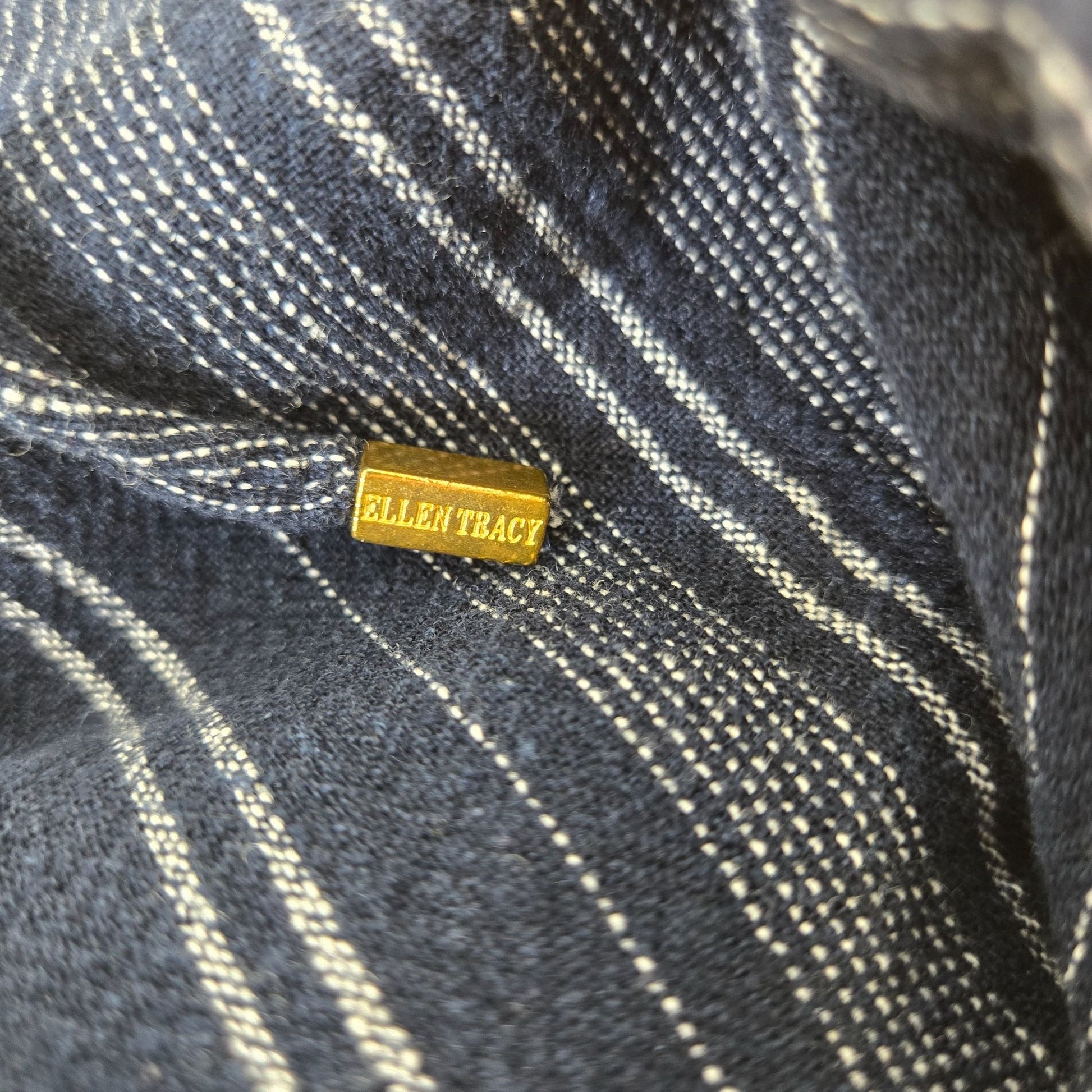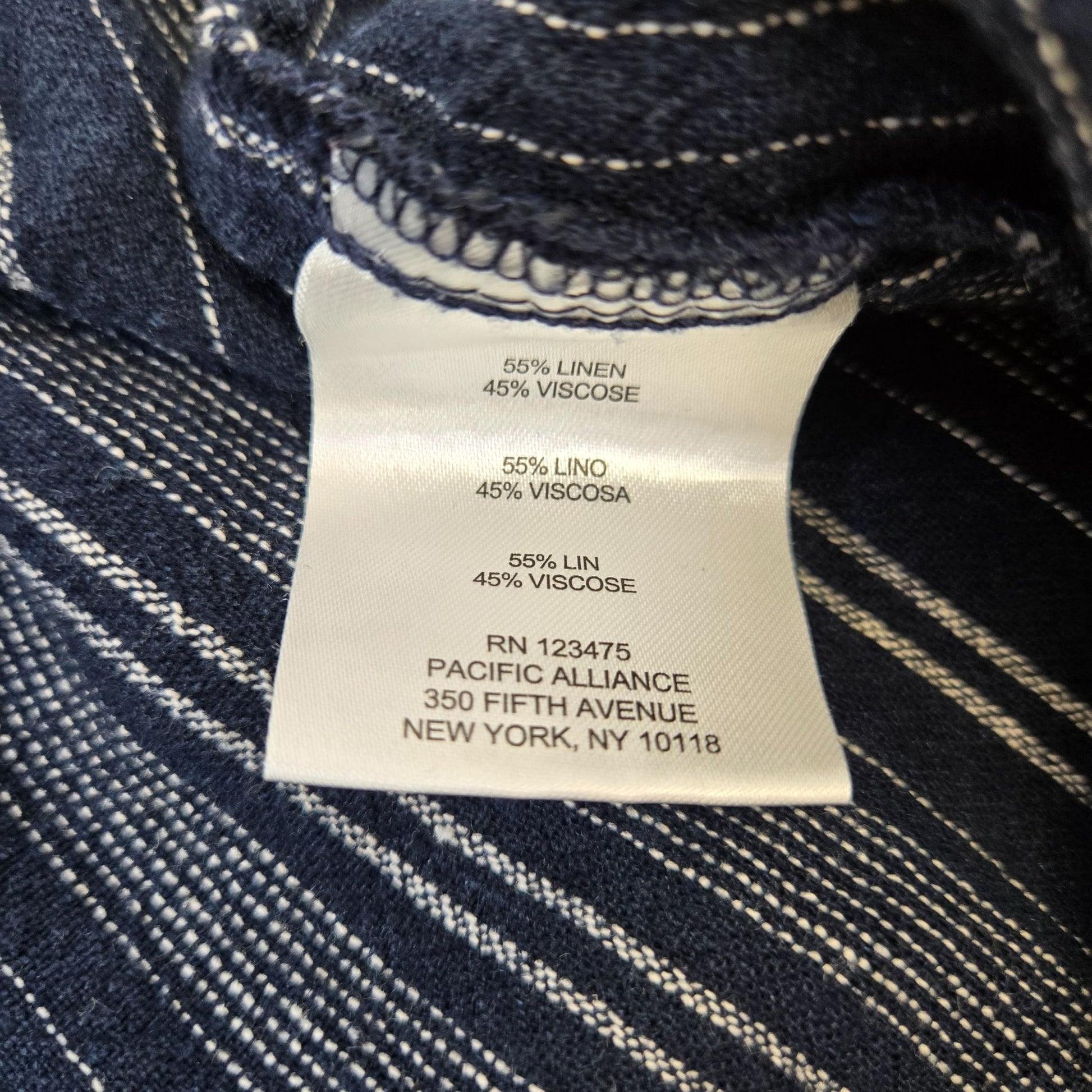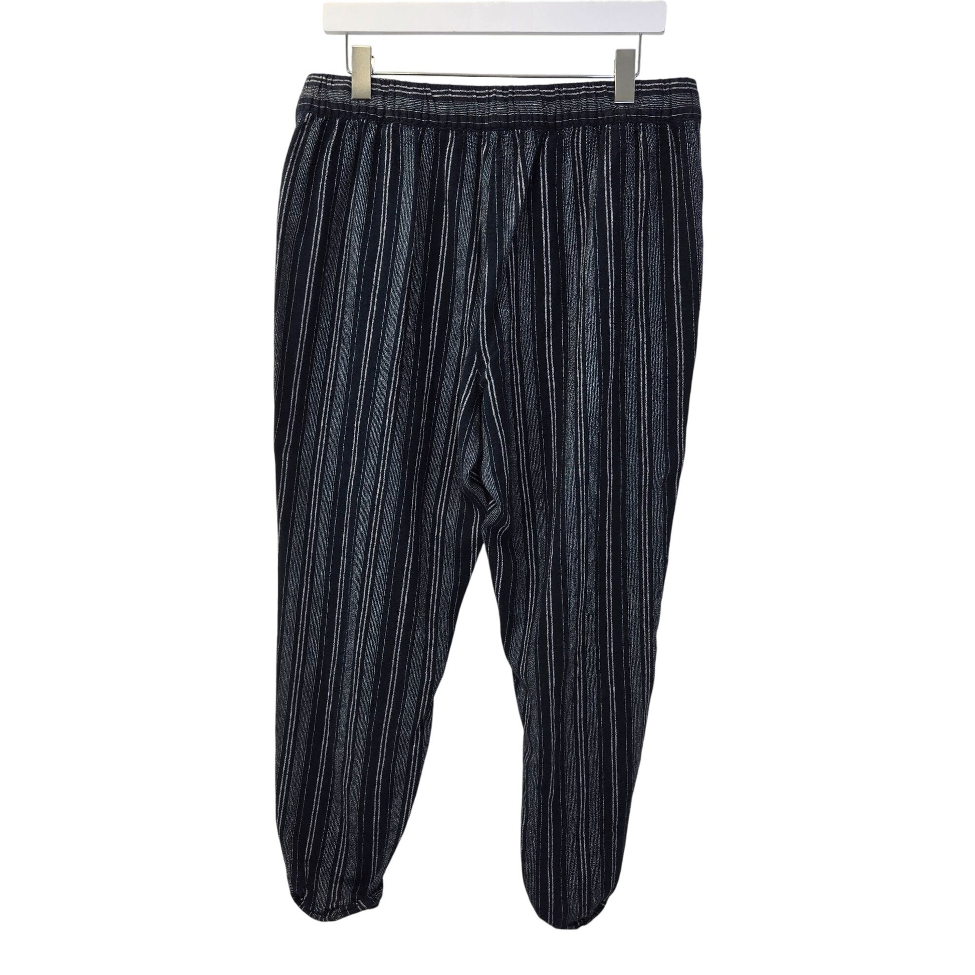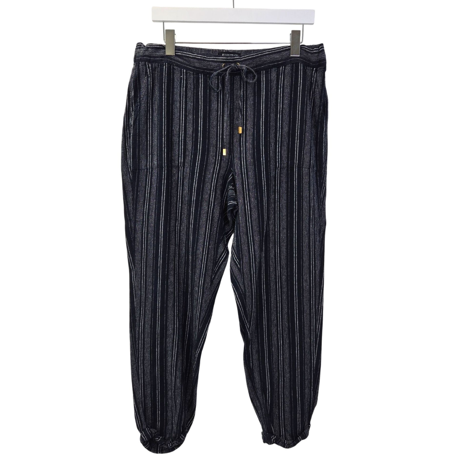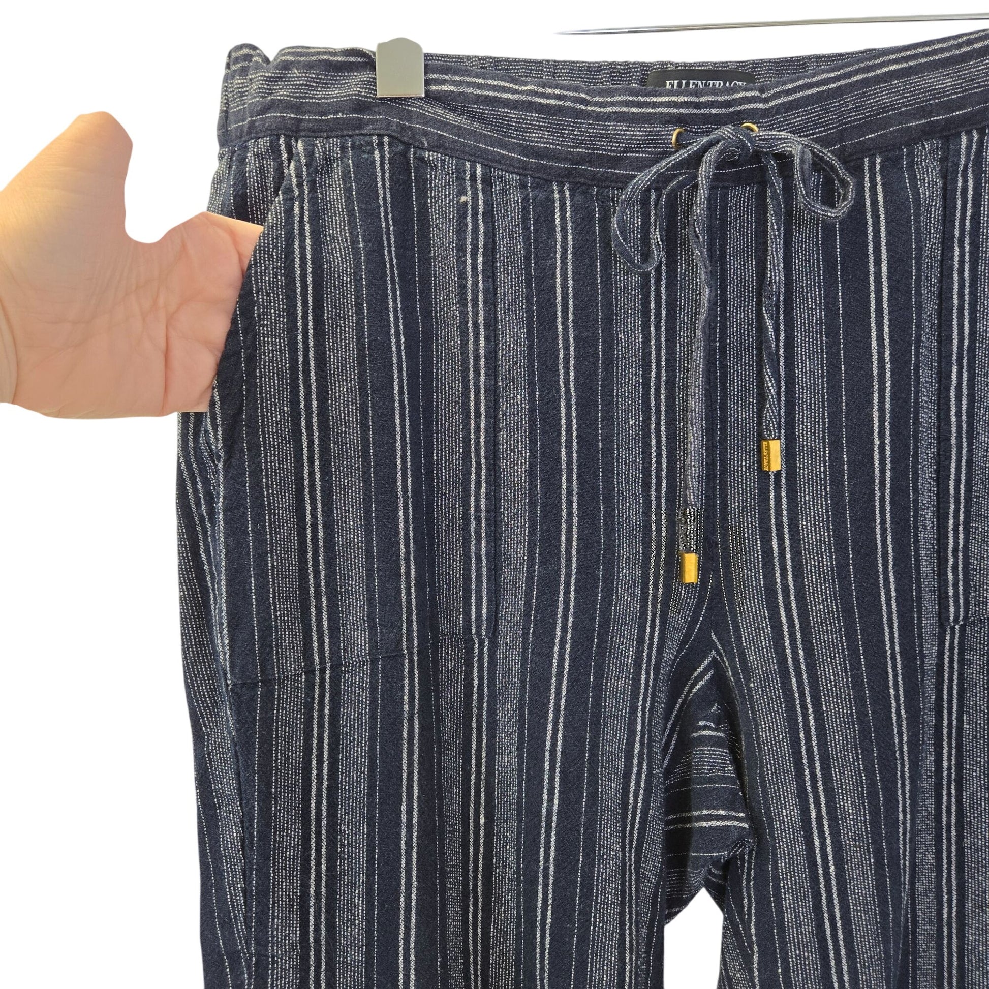 Really nice linen and viscose blend striped jogger style pull-on pants that have an elastic waist with drawstring for a perfect fit. Side front pockets and logo stamped gold tone hardware on the drawstring.
