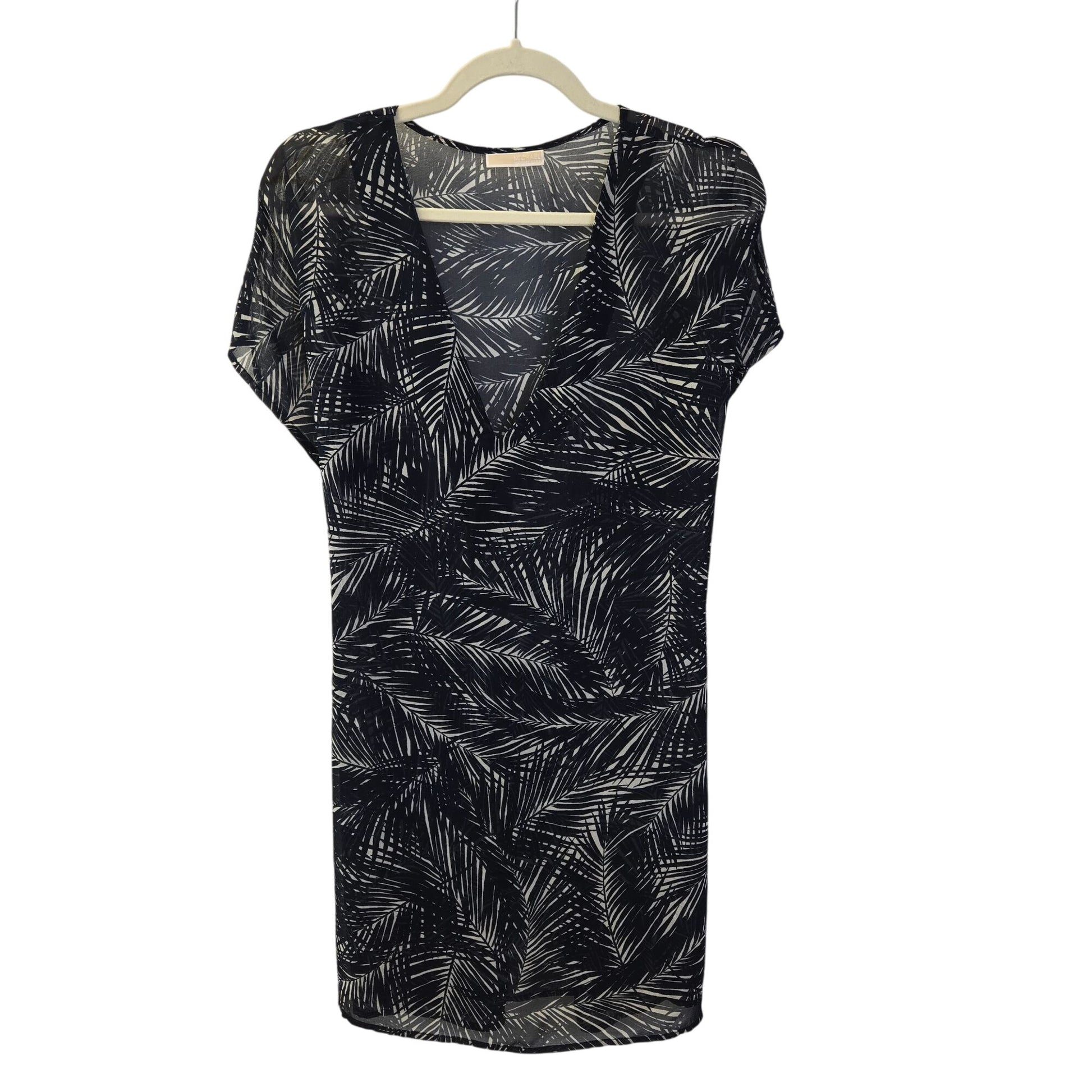 Really cute tropical print cover-up dress that has cap sleeves and a tie at the waist. The tie could likely work on the front or the back. V-neckline.