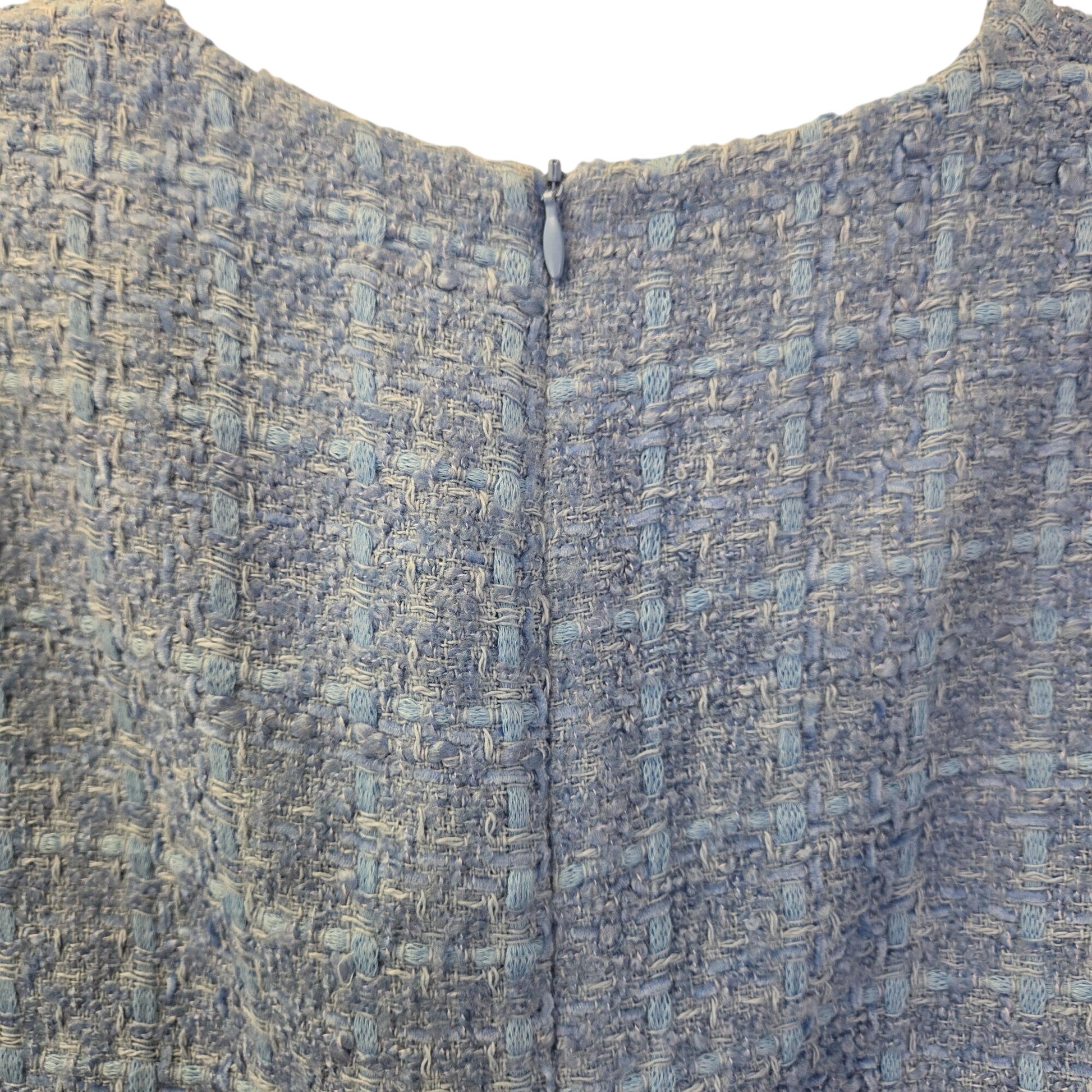 Adorable baby blue tweed sleeveless romper with a plunging v-neckline and back zipper closure. Faux pockets on the front. This can be worn alone or layer with a long sleeve top and then pair with some tights and high boots.