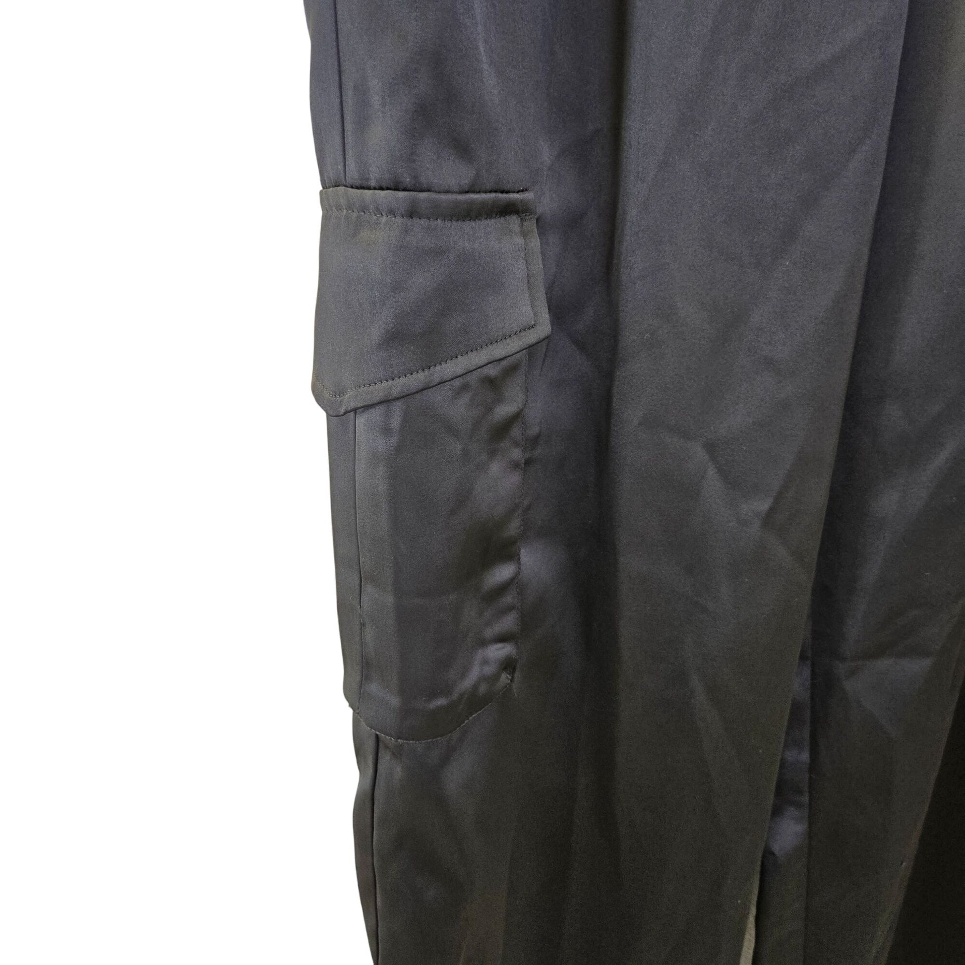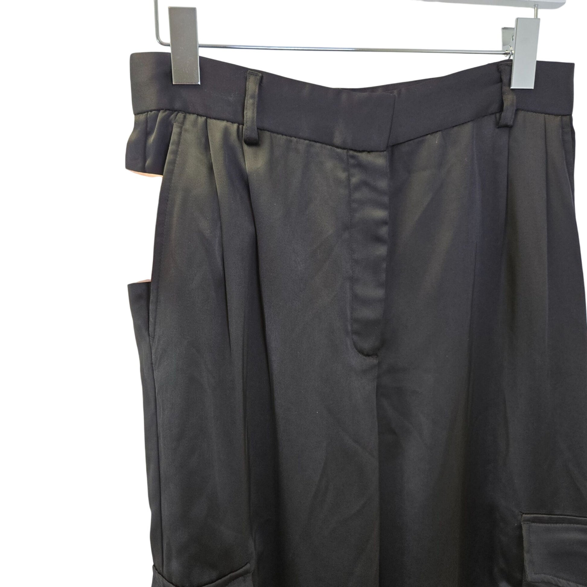 Really cute satin relaxed straight leg cargo pants that have front side pockets, back flap pockets and hip pockets. Great to pair with a crop top and some heels or boots.