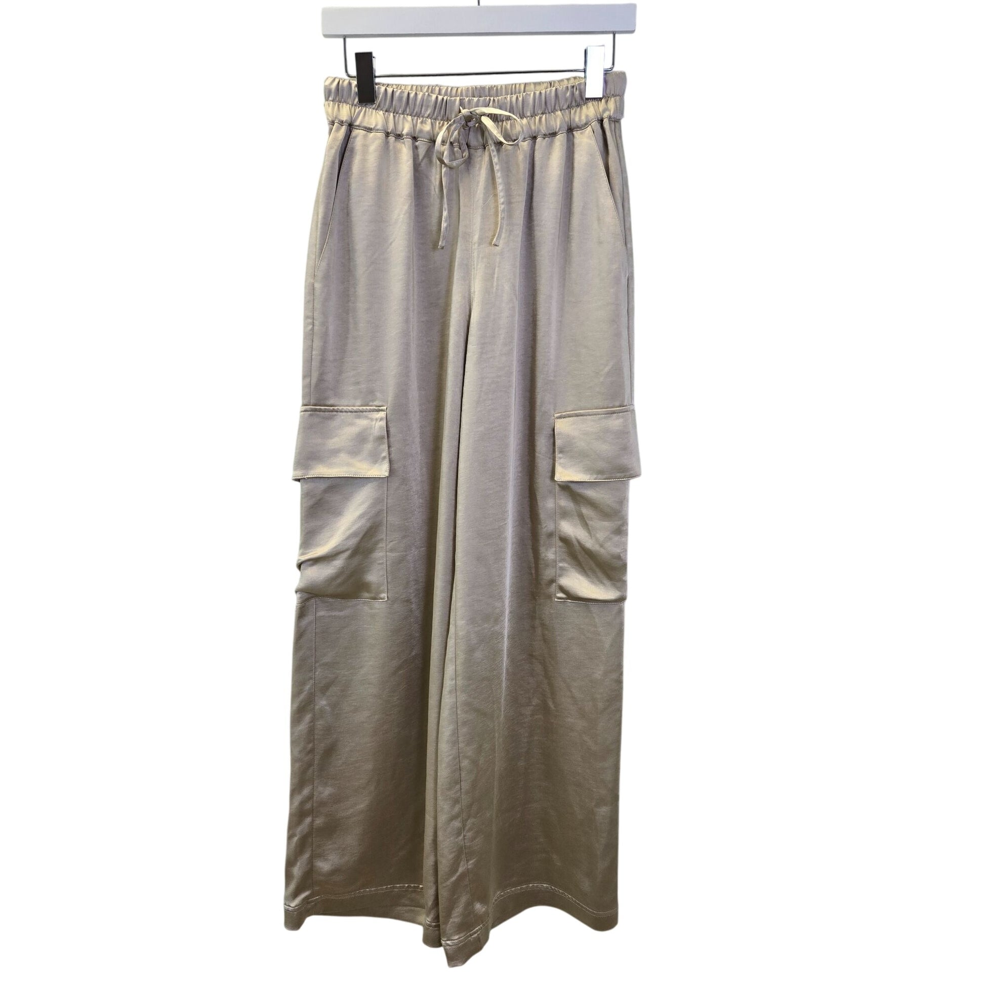 Gorgeous satin wide leg cargo pants that have an elastic waistband with tie, two front side pockets, back flap closure pockets and cargo hip pockets. The color is called Silver Lining and is like a champagne color. Pair with heels or sneakers.