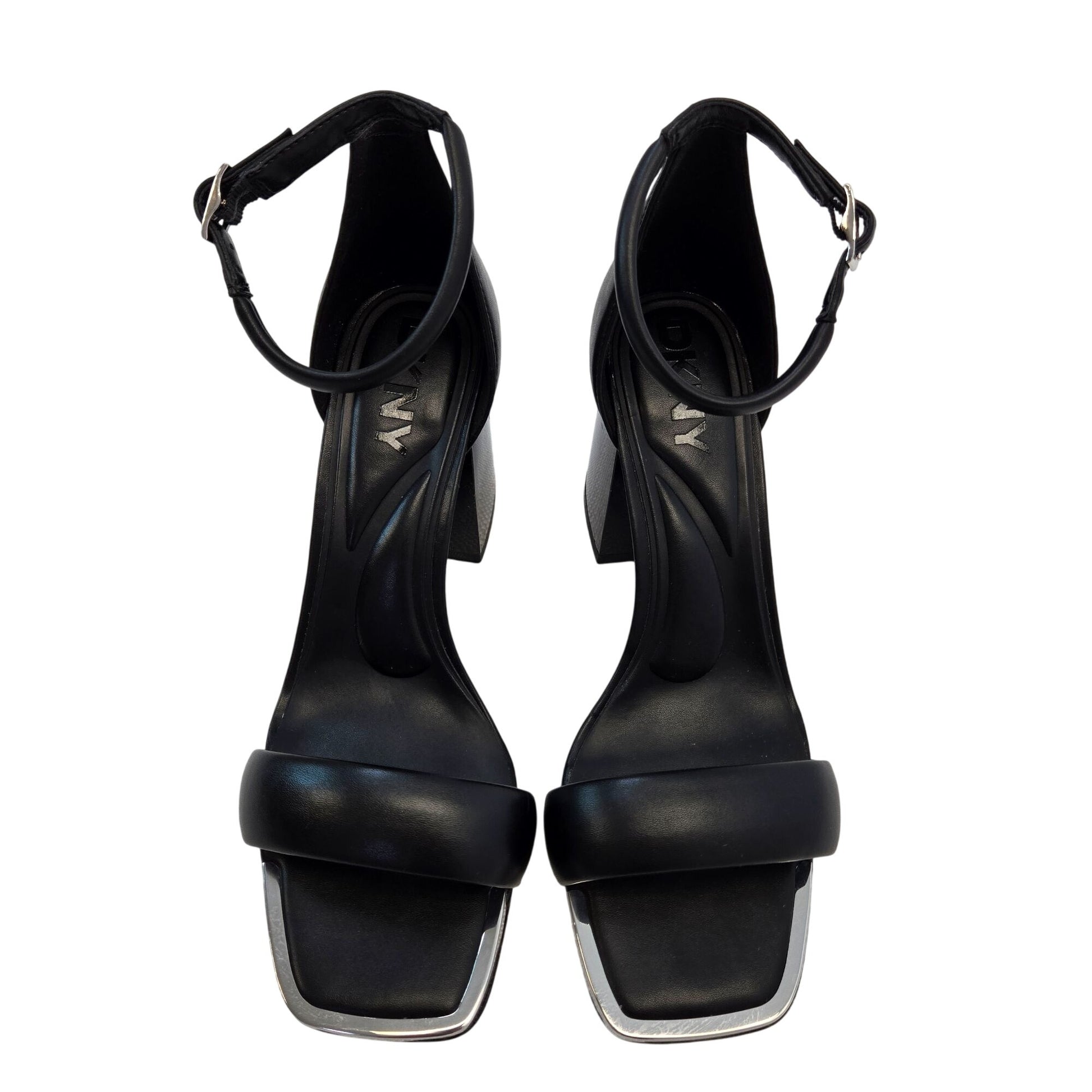 The DKNY Scarla shoe is an ankle-strap sandal featuring a modern, metallic-tipped square toe, a puffy vamp strap, and a flared block heel. It has an adjustable ankle strap with a buckle closure and a synthetic upper, lining, and sole with a cushioned footbed for comfort.