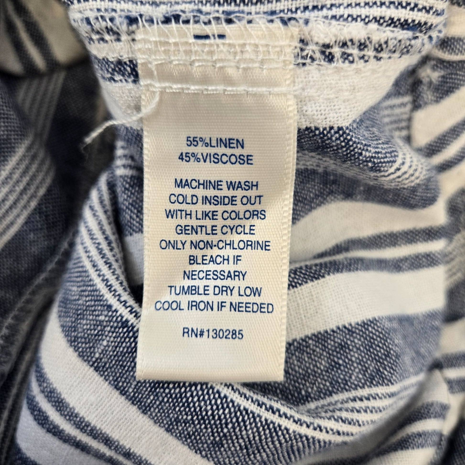 Really nice lightweight linen blend striped wide leg capri pants that have all the nautical vibes. Elastic waistband with drawstring, front and side pockets.