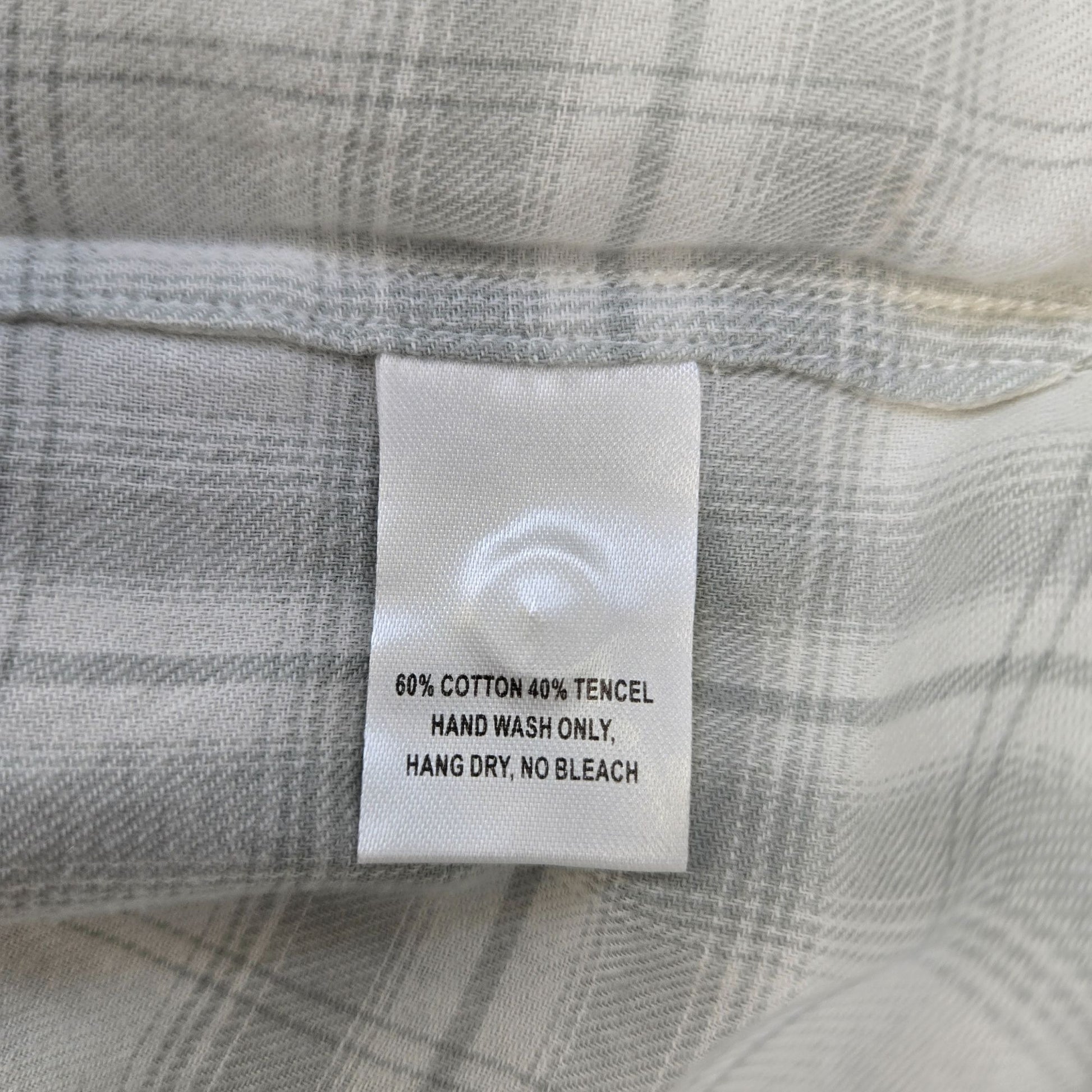 Really soft cotton and tencel blend plaid button down cap sleeve shirt that has two chest pockets. The colors are white and a very light greenish-gray.