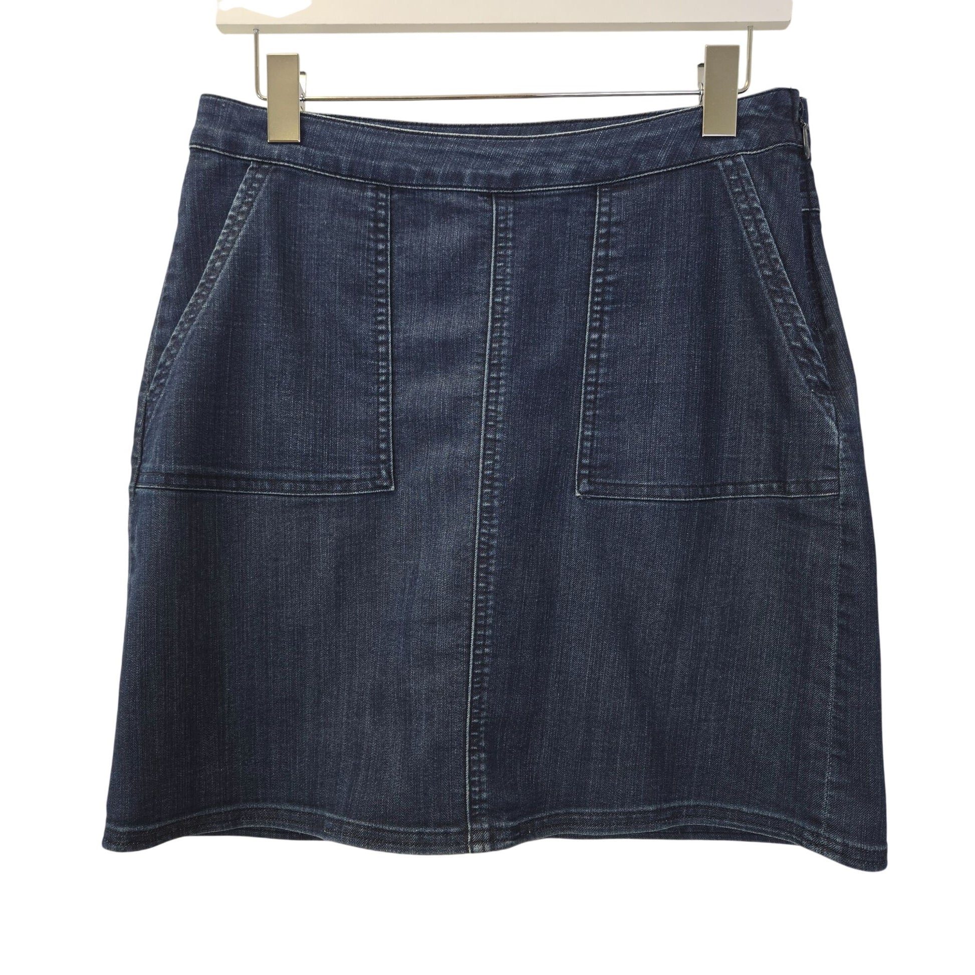Lightweight denim mini skirt that has front pockets and a side zip closure.