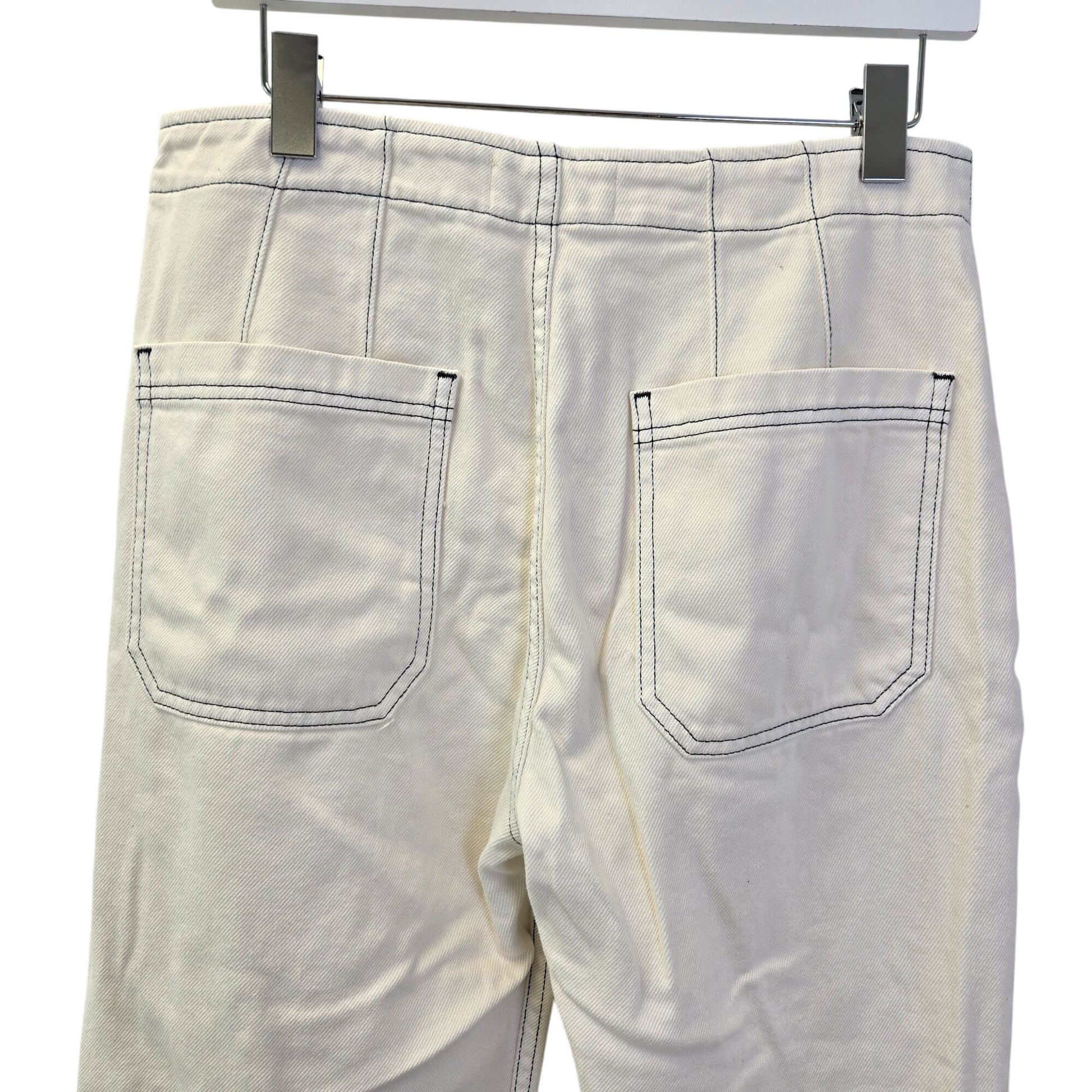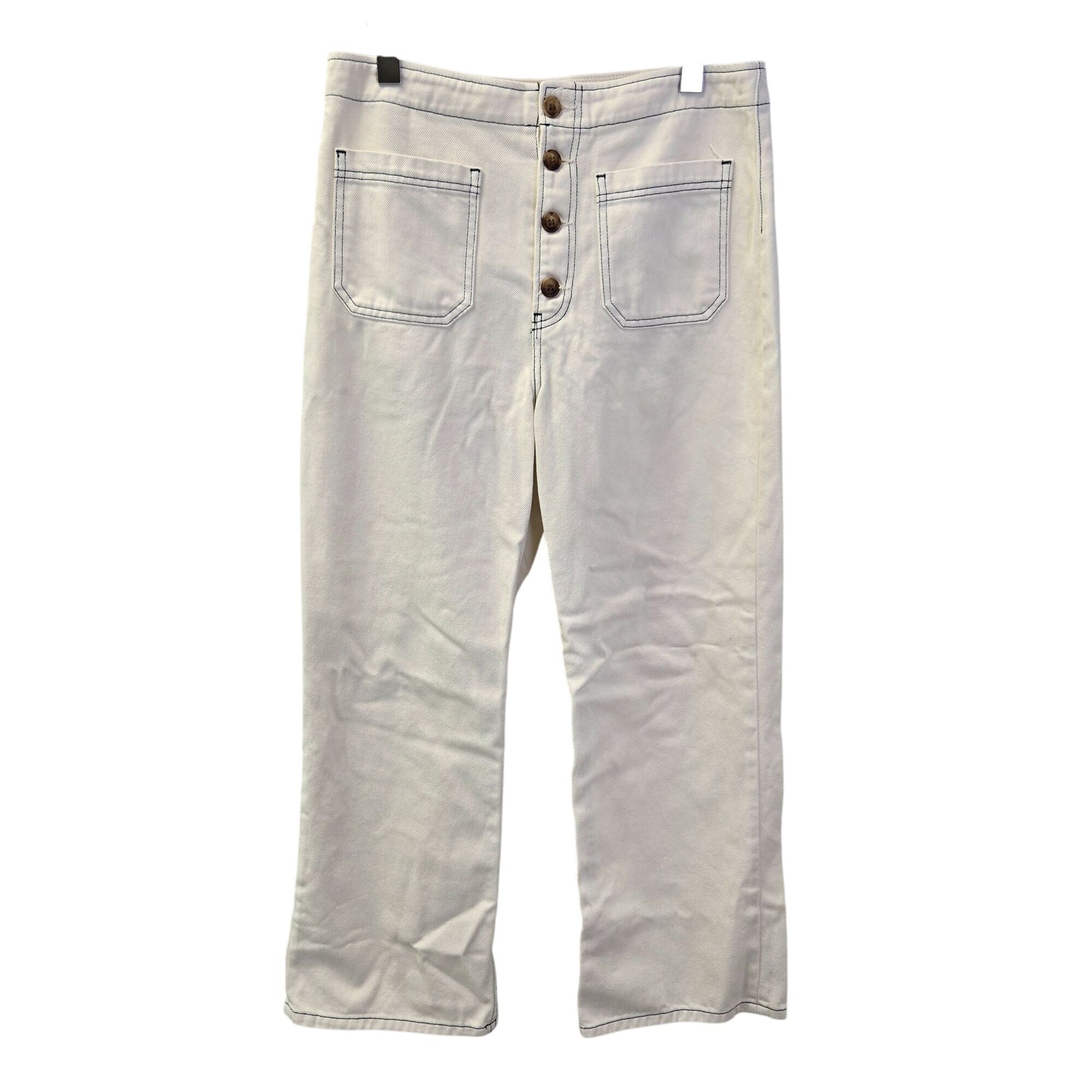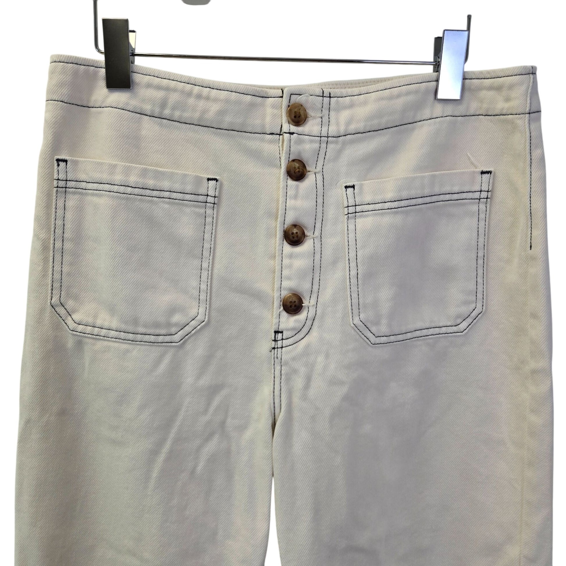 This is a high rise, rigid jean with an exposed button fly and a wide leg. The Eloise is fitted throughout the hip and butt with an easy fitting. The color is called Ivory but it leans more toward a white color than a cream and the stitching is a navy blue.