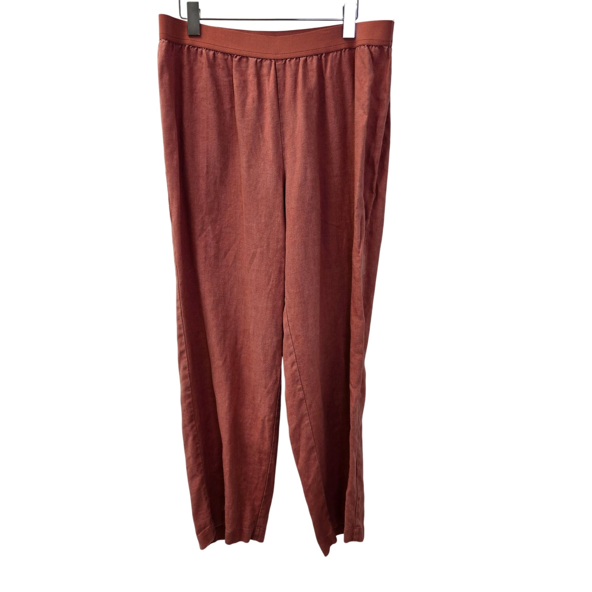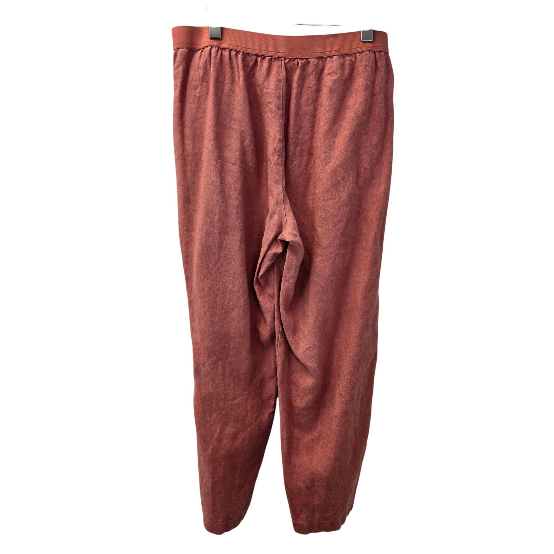 Really nice lightweight pull on linen pants that have an elastic waistband and no other closures. The color is like a terra cotta. This has some very light wash wear.