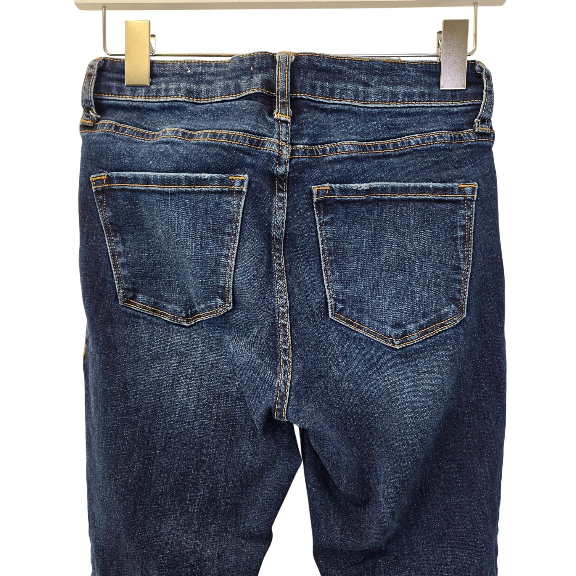 Darker wash high rise skinny distressed jeans with a raw hem. Button fly closure.
