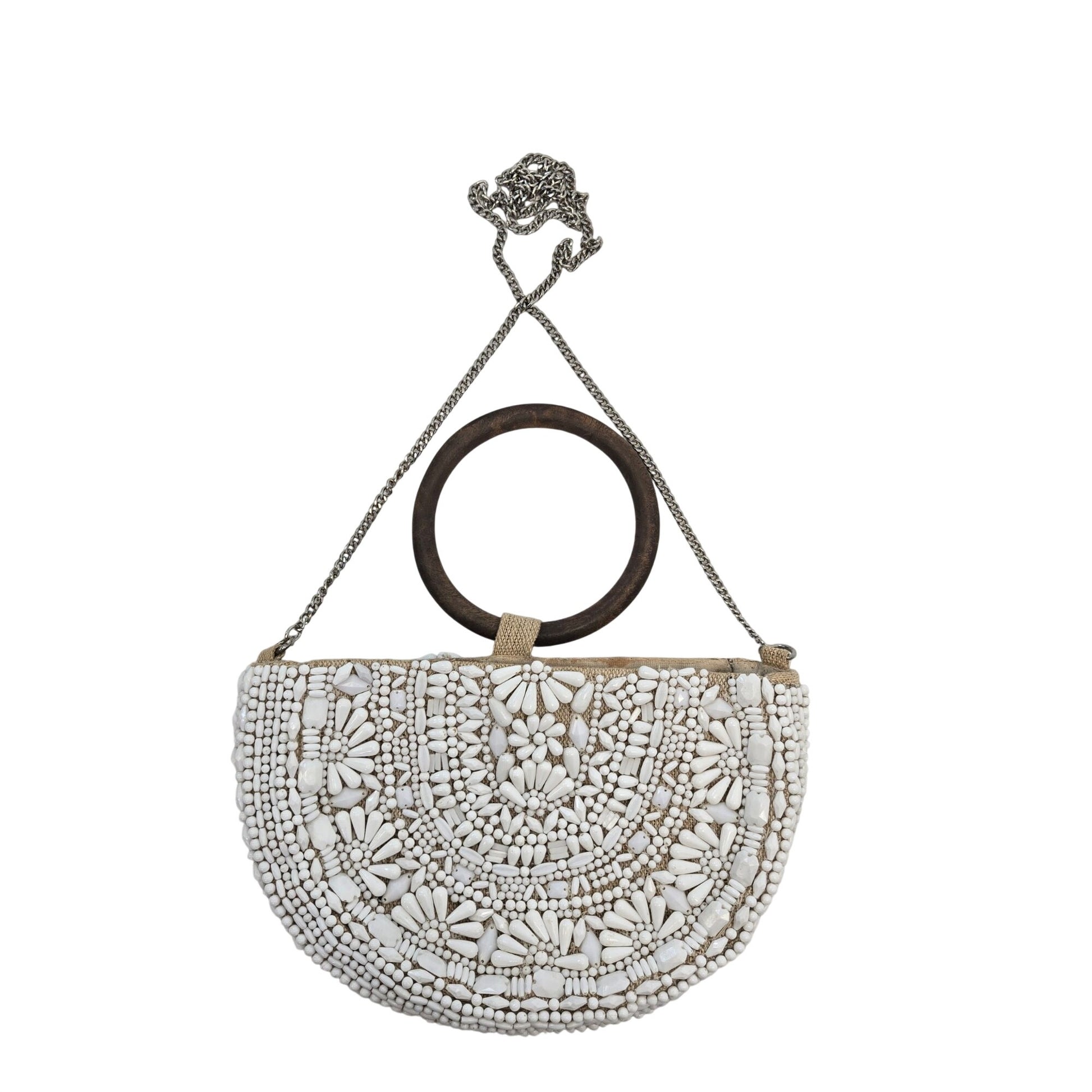 Adorable beaded half moon bag that has a wooden circle handle and silver chain crossbody or shoulder strap. The strap is not removable but can be tucked into the bag if you want to just carry by the handle. Snap closure at the top and no pockets on the inside.