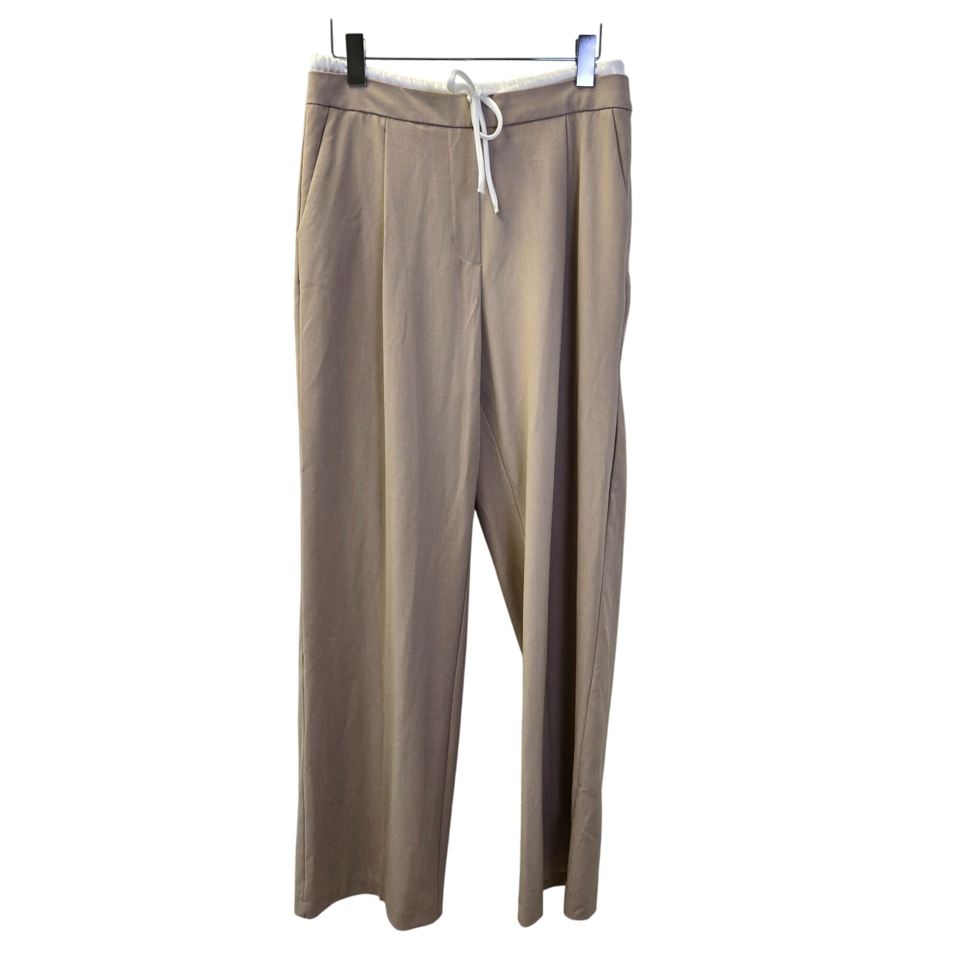 Wide leg pants with double elastic waistband and front drawstring detail. Front pockets and faux back pocket. Front pleat detail and side zipper closure. Pair with loafers, heels or sneakers for a more casual vibe.