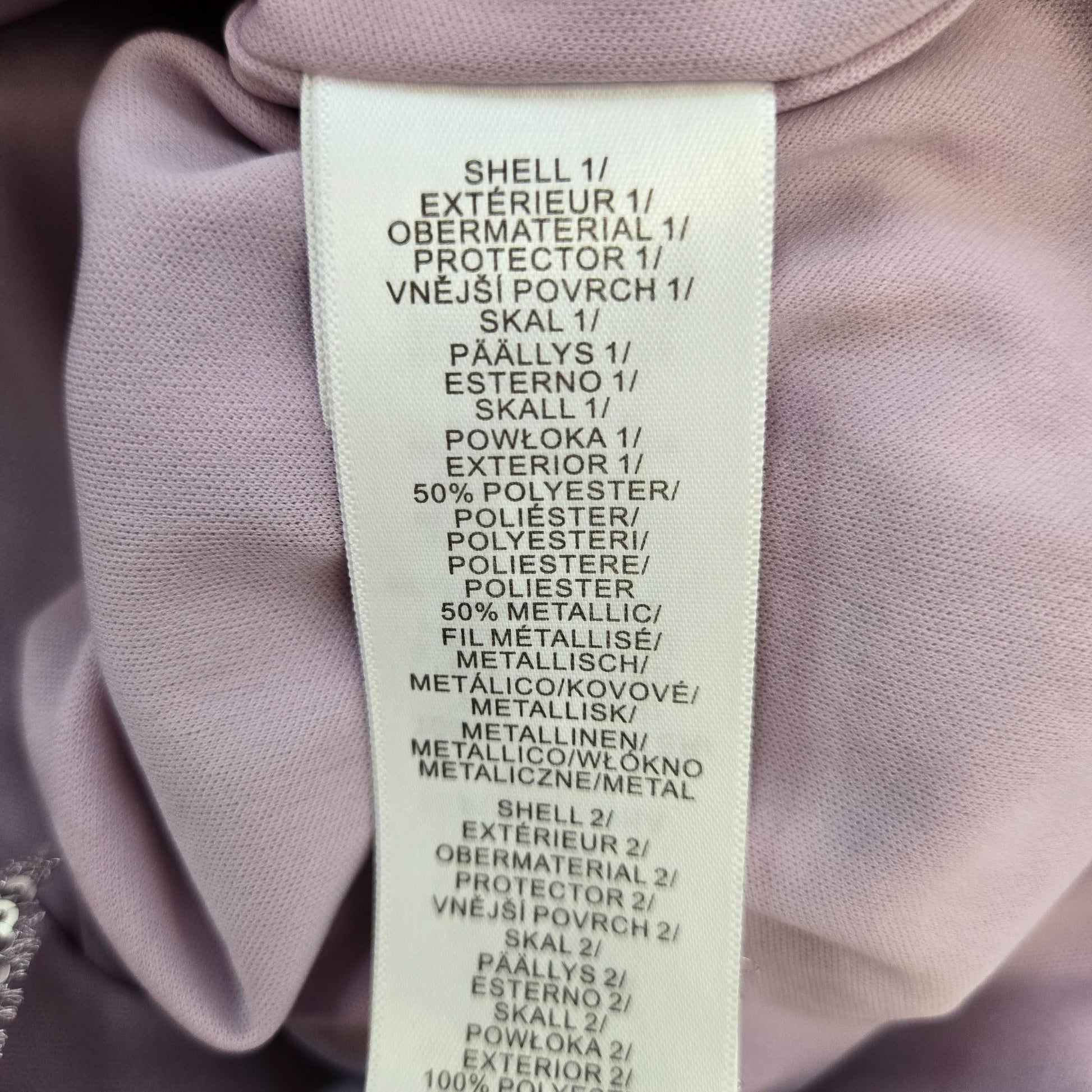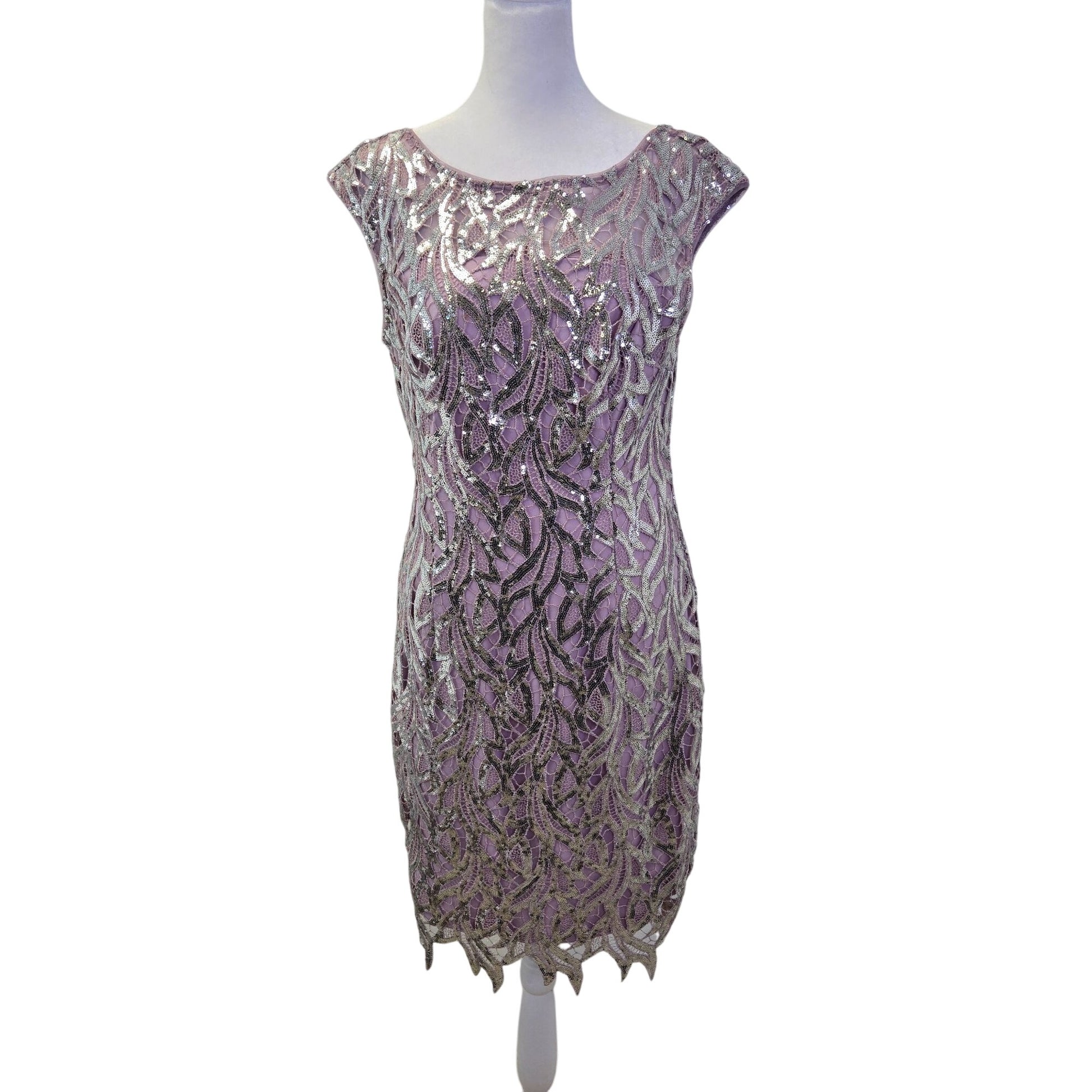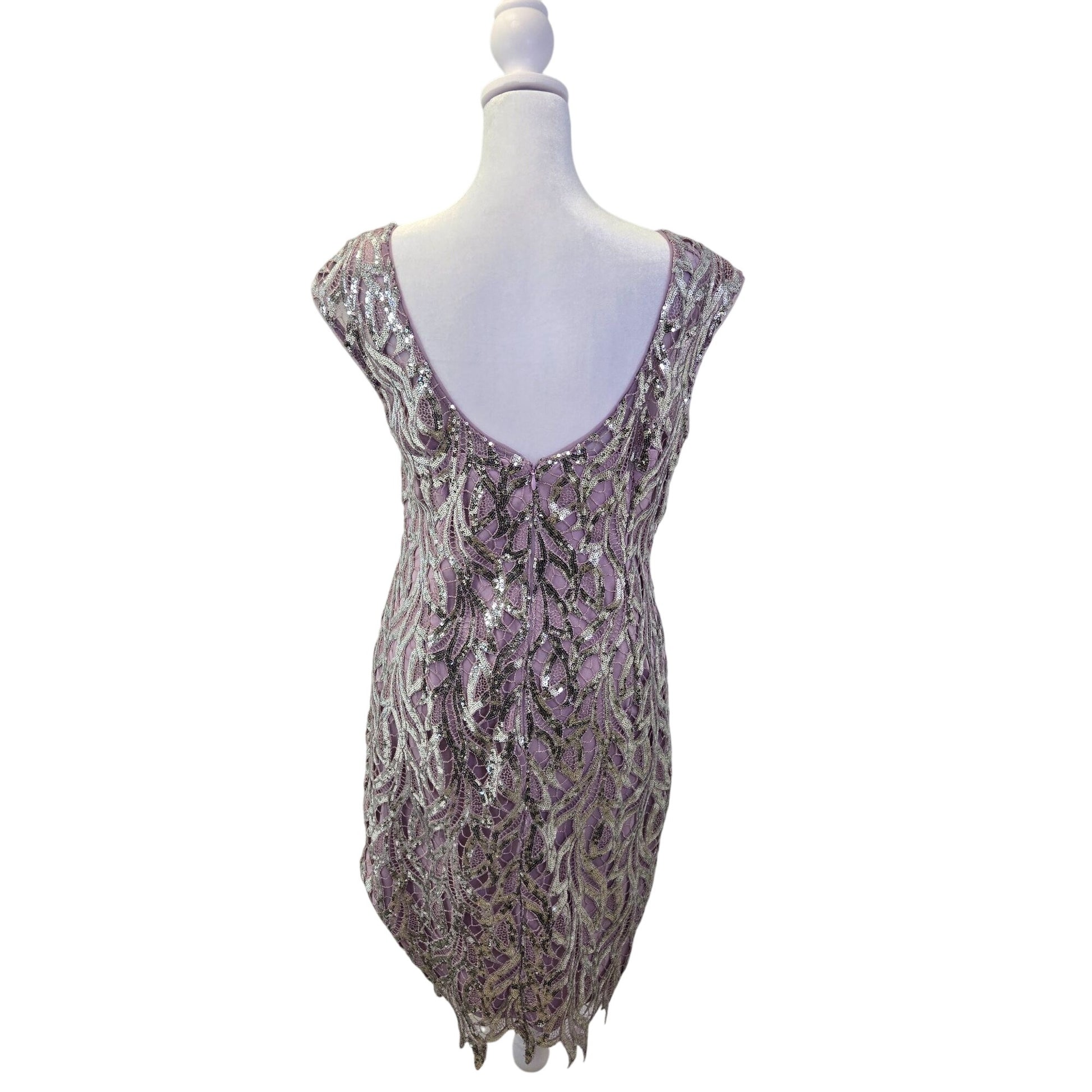Really pretty lilac color cocktail dress that has a silver sequin overlay to make this a great dress for any special occasion. Scoop back design with zipper closure.