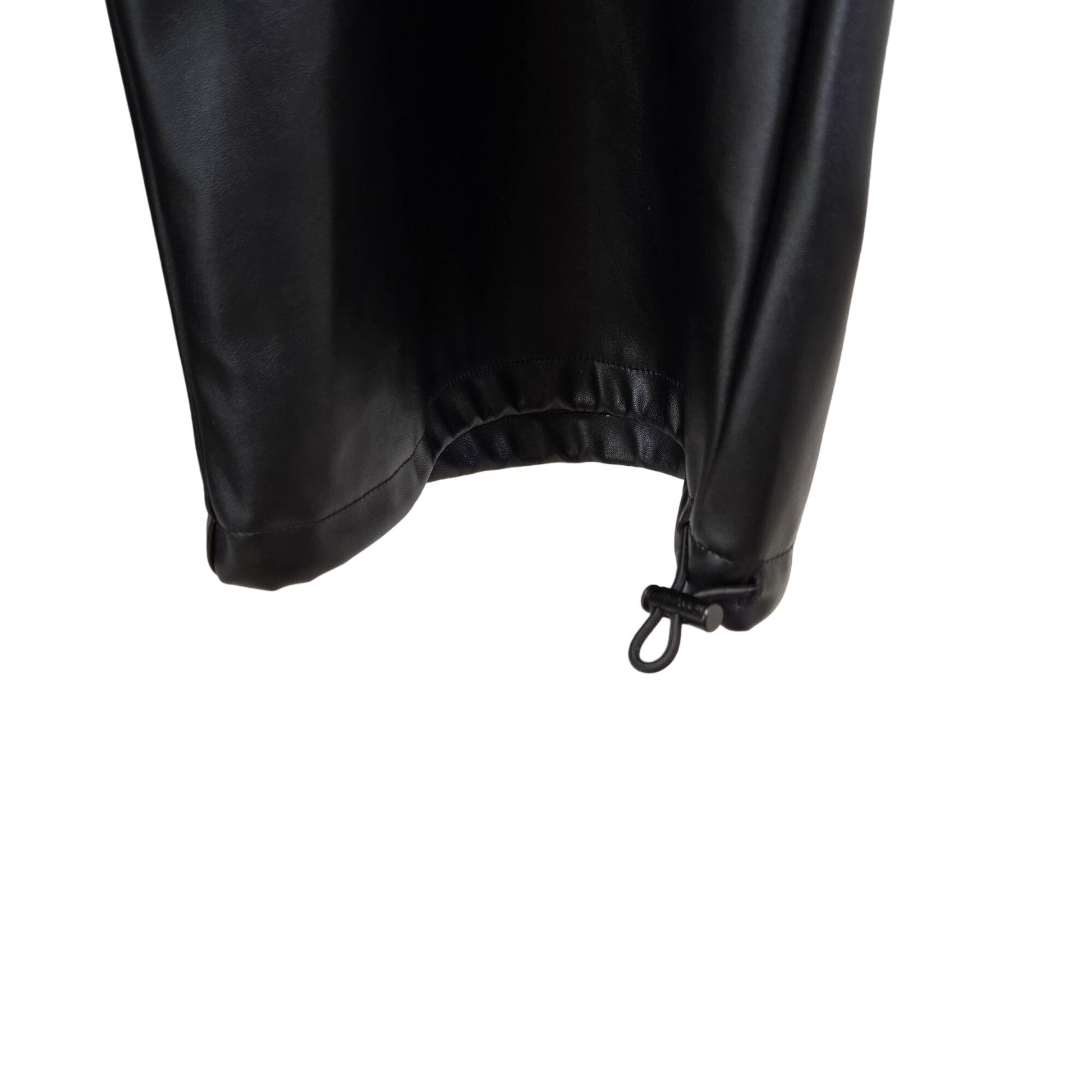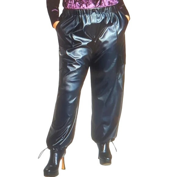 Really fun vegan leather wide leg cargo pants that have front pockets, side pockets and a cinch at the hemline so you can wear them like joggers. Great for a night out on the town or a date night.