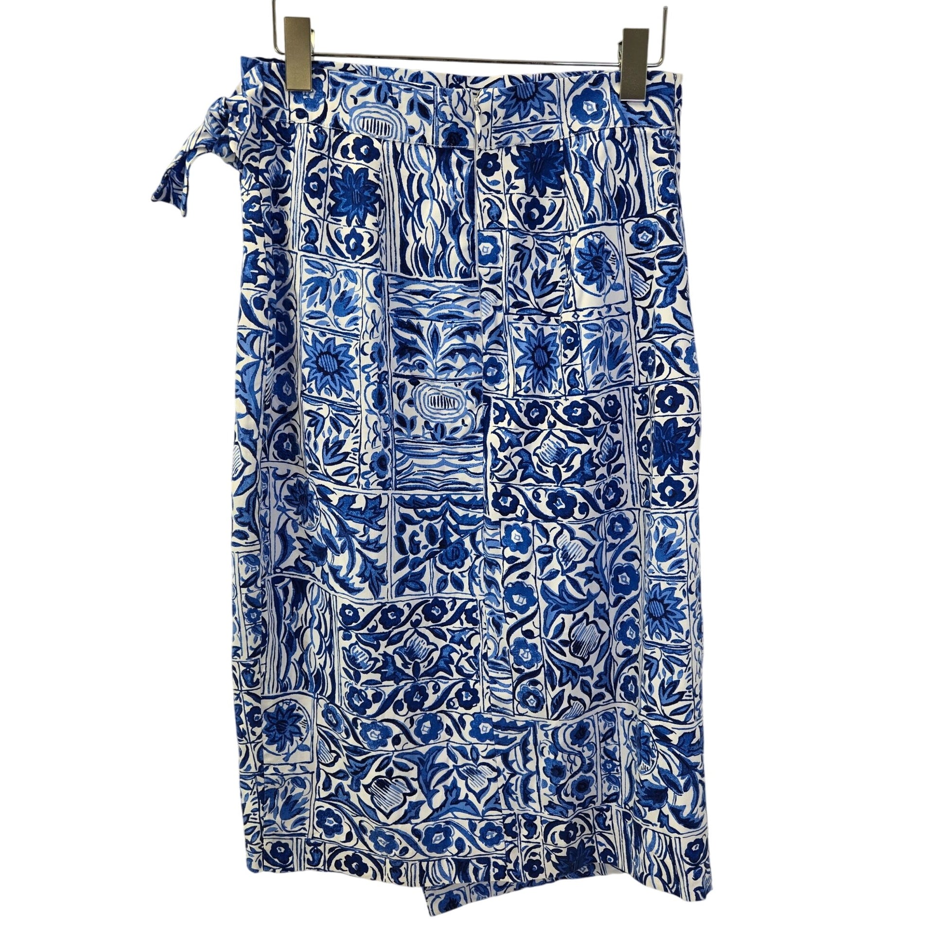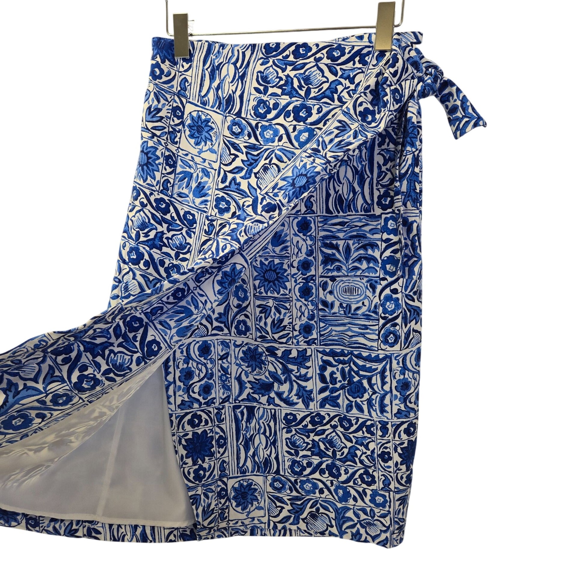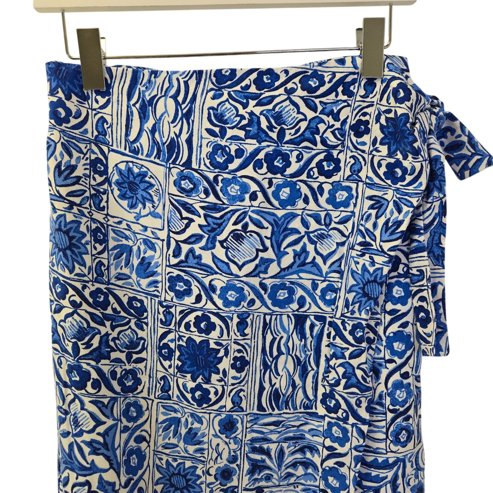 Pretty floral skirt that has a wrap front with a tie on the side and back zipper closure. This is a midi length and 100% viscose so has some good movement to it. Pair with a blouse or crop top and heels or sandals.