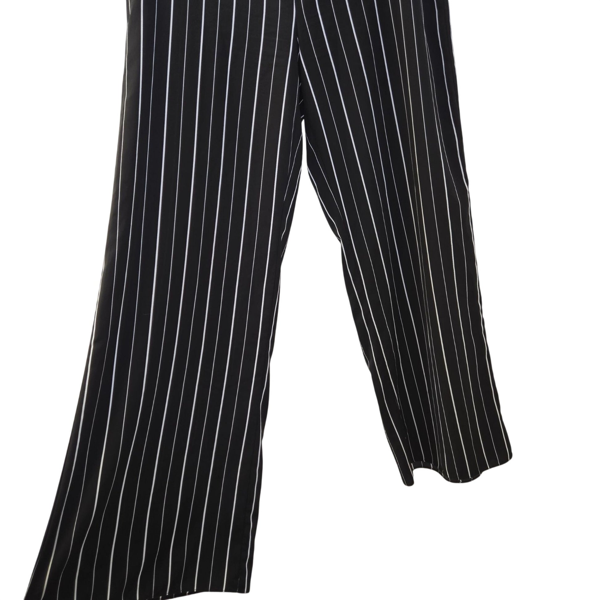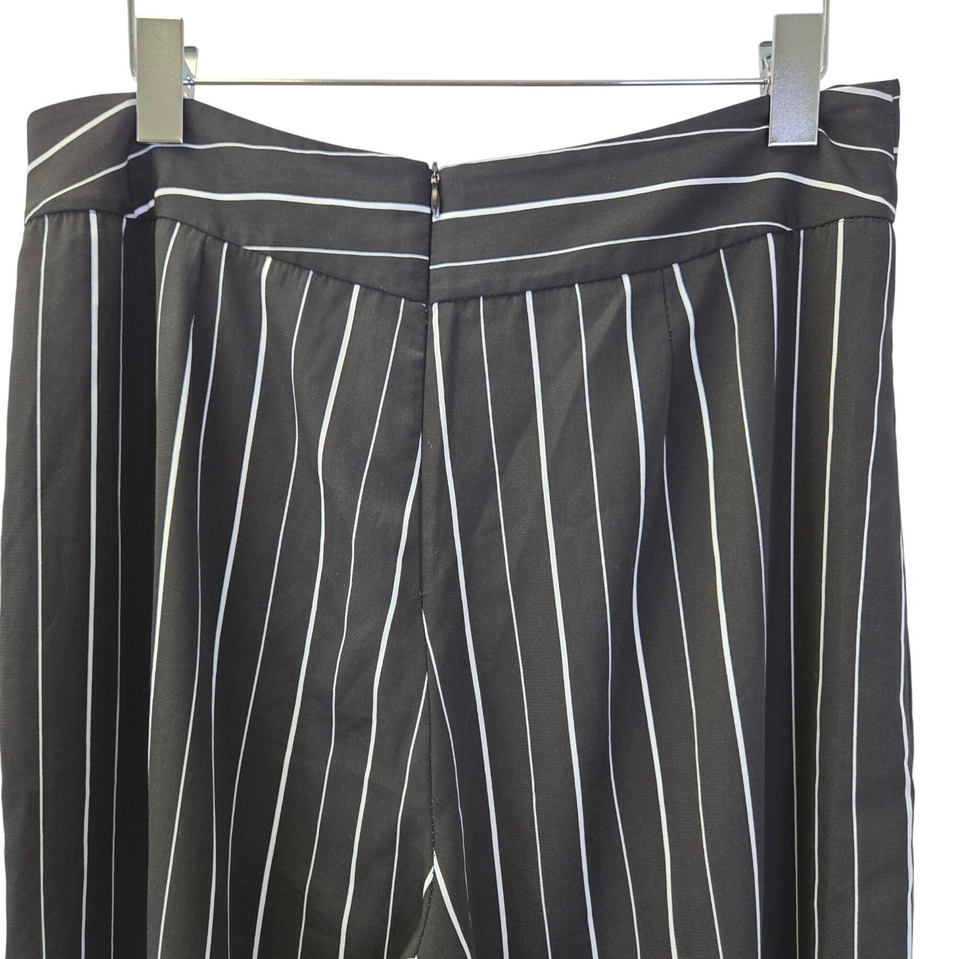 Lightweight and flowy wide leg striped trouser pants with a back zipper closure and attached waist tie. Great for work or for a casual day.