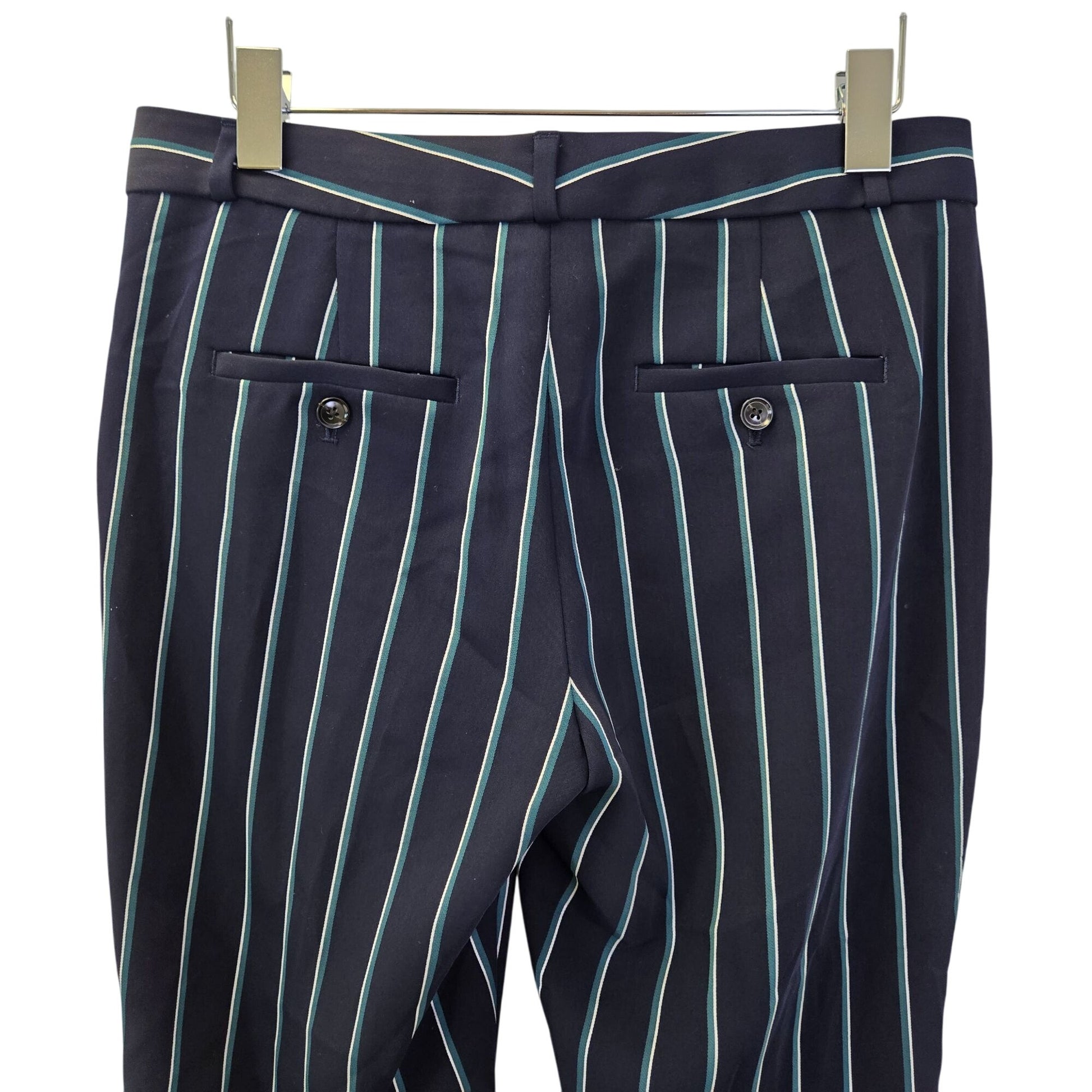 Great alternative to a standard chino pant, these striped trouser pants have a navy blue base with green and white stripes. Front side pockets and back slit pockets. Pair with a blouse, crop top or a sweater.