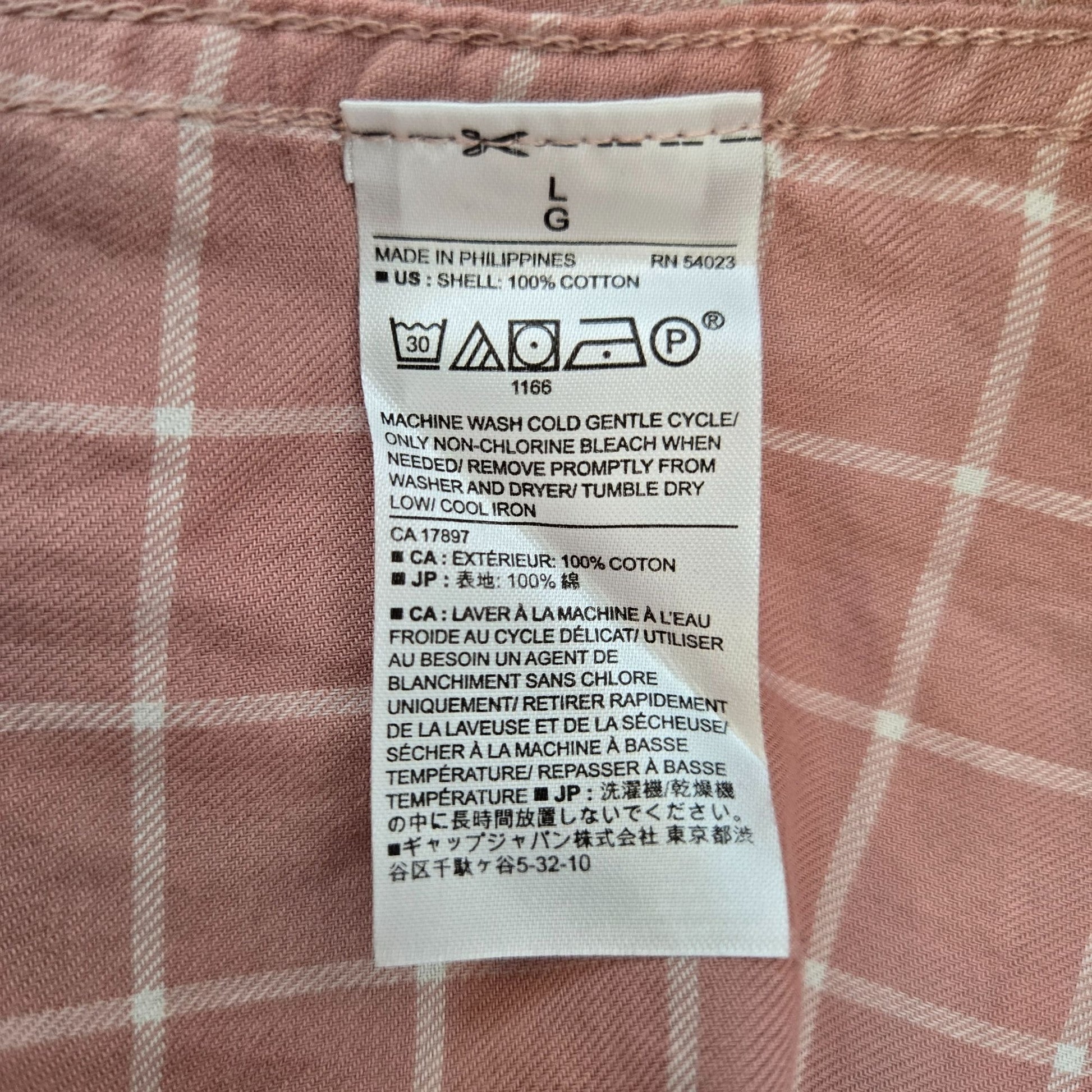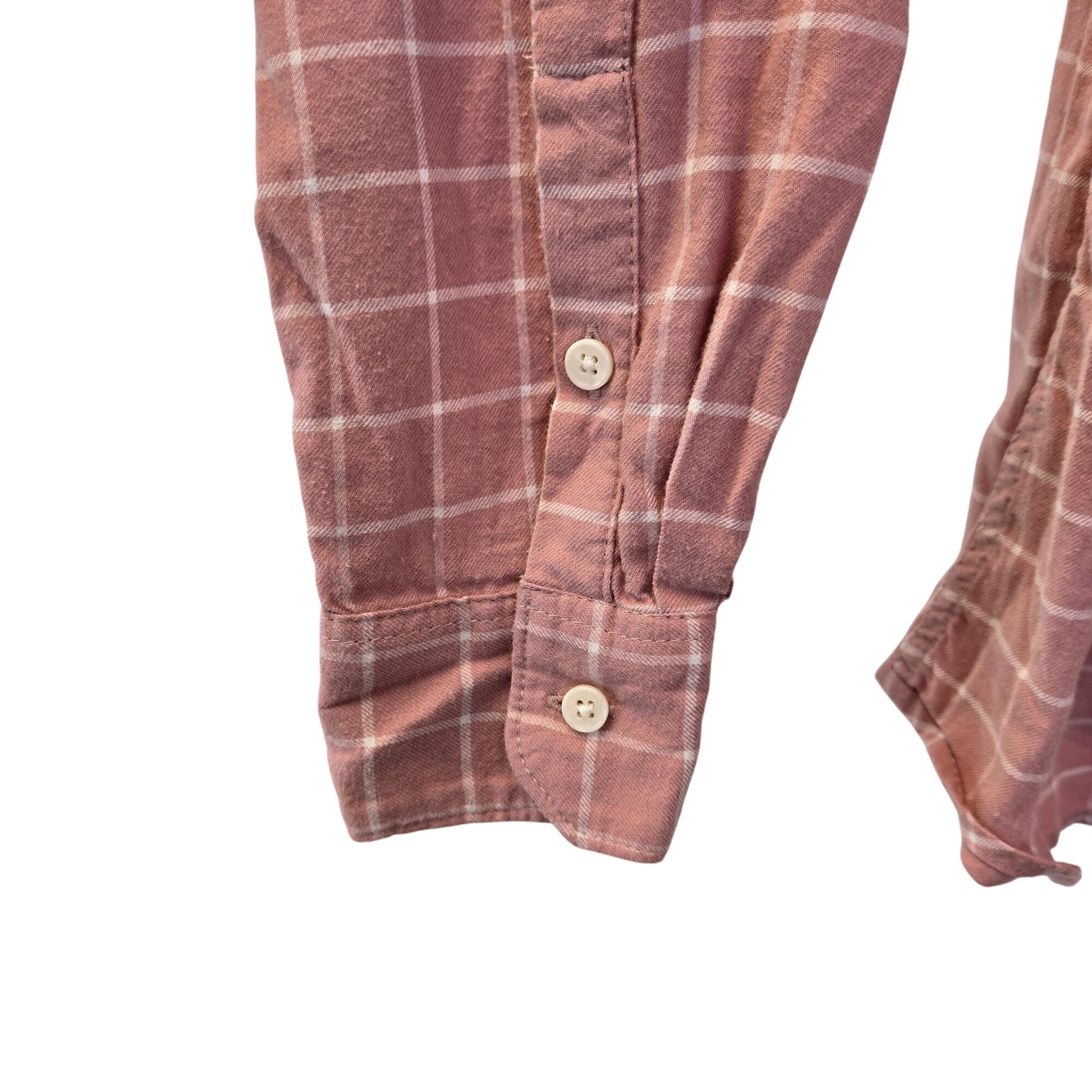 Really cute pale pink button down shirt that has a plaid pattern and buttons at the wrists. There is just some slight wash wear on this but still in good condition with a lot of life in it.