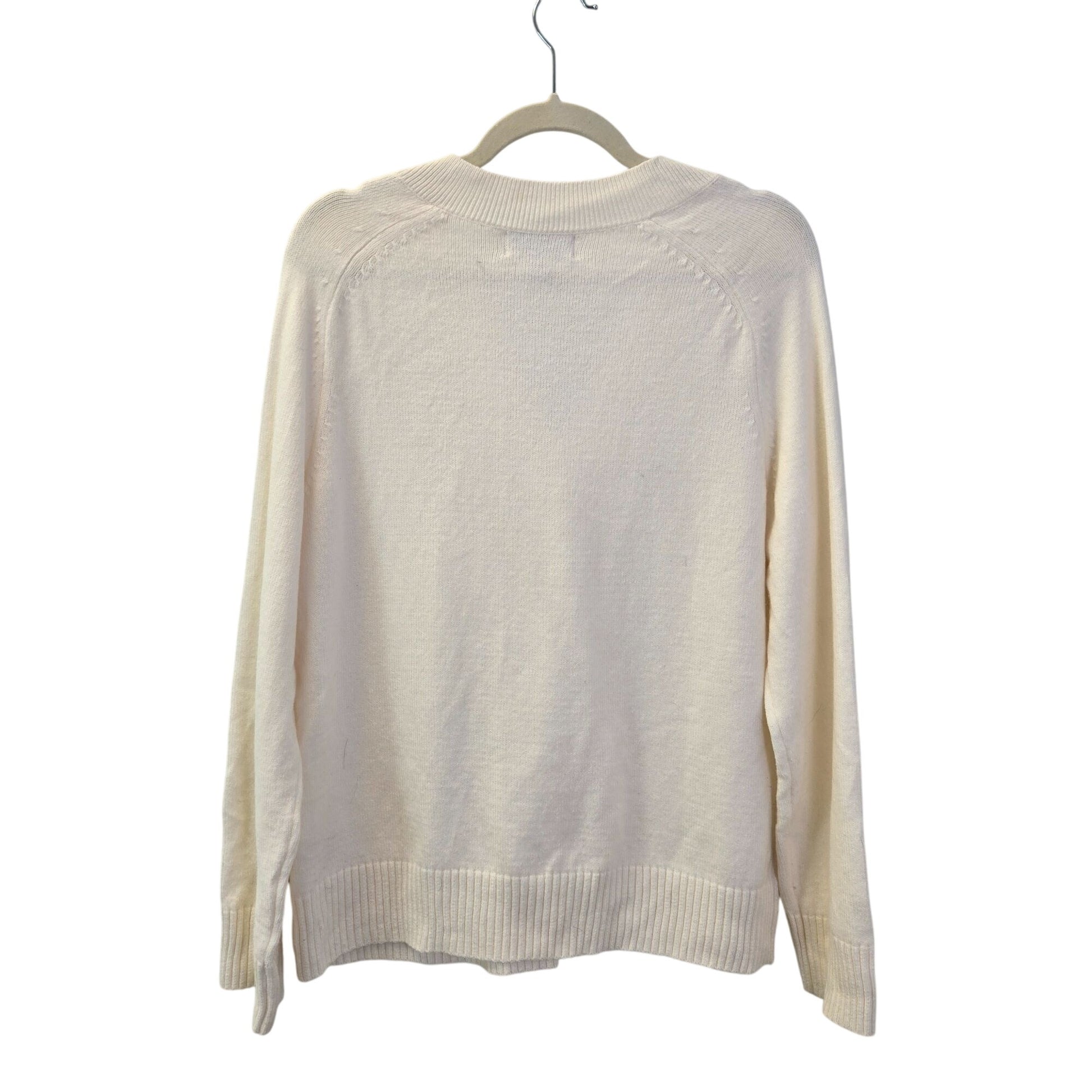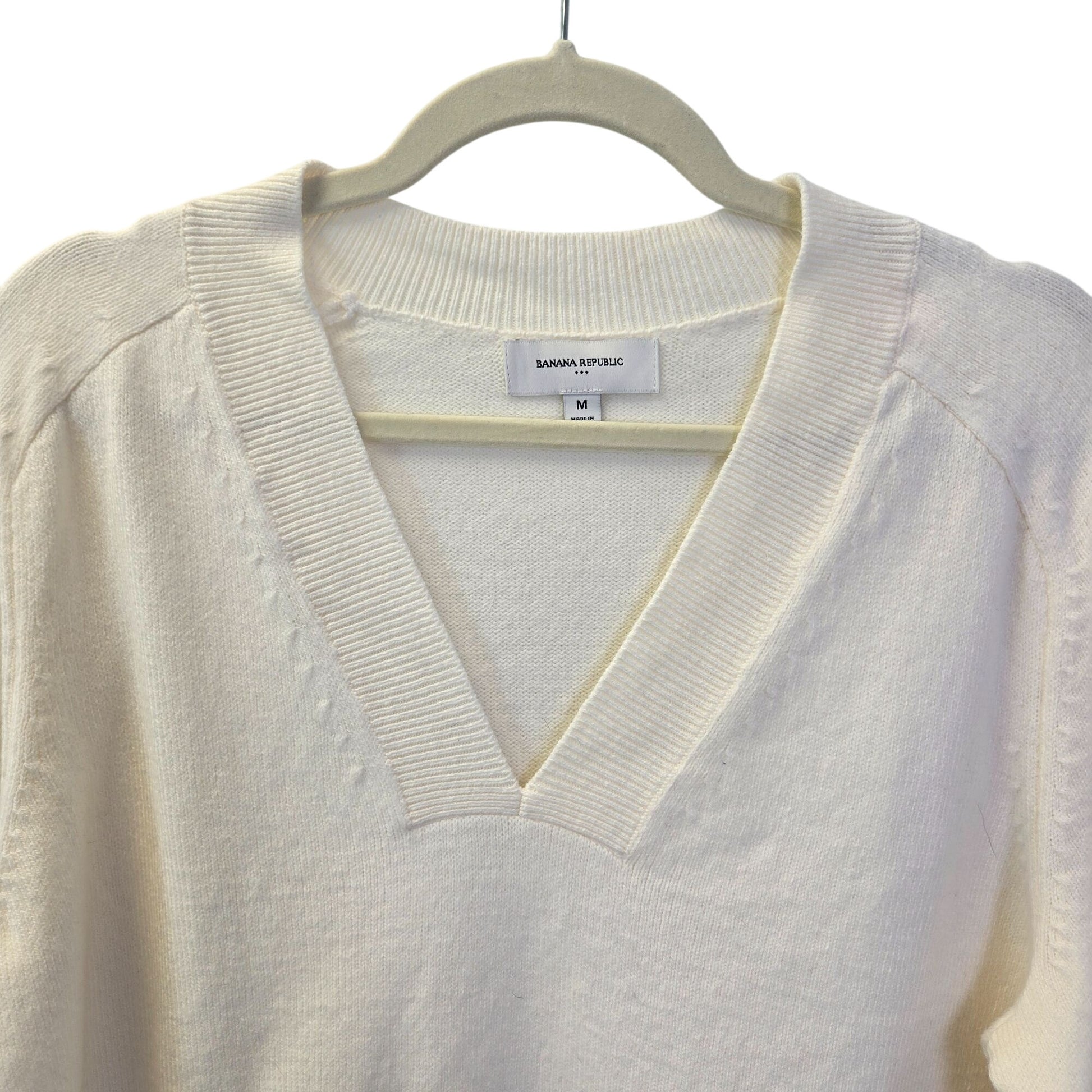 Really nice v-neck wool blend sweater that is versatile to wear with a button down shirt for work or with a t-shirt and jeans for a more casual day. The color is like a winter white.