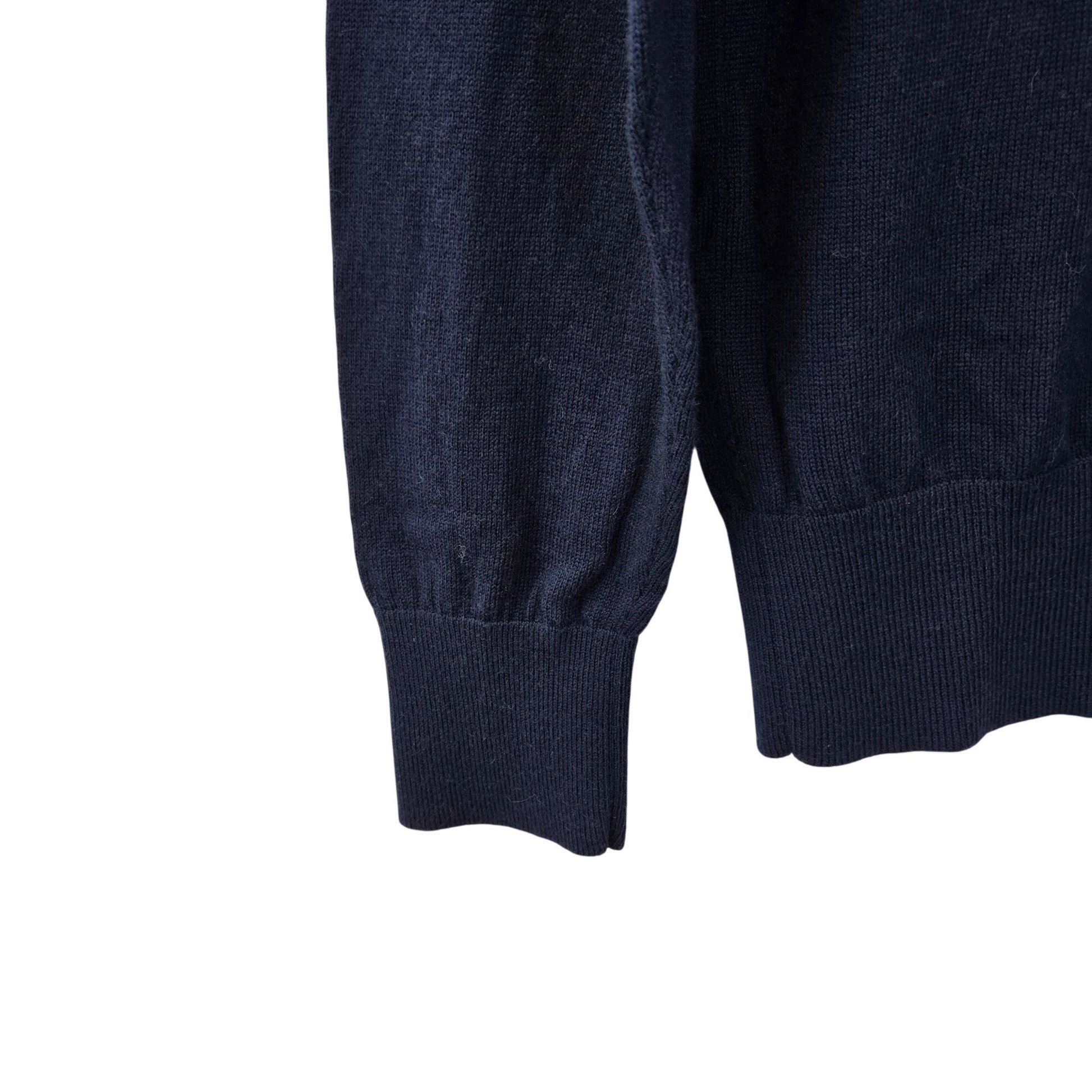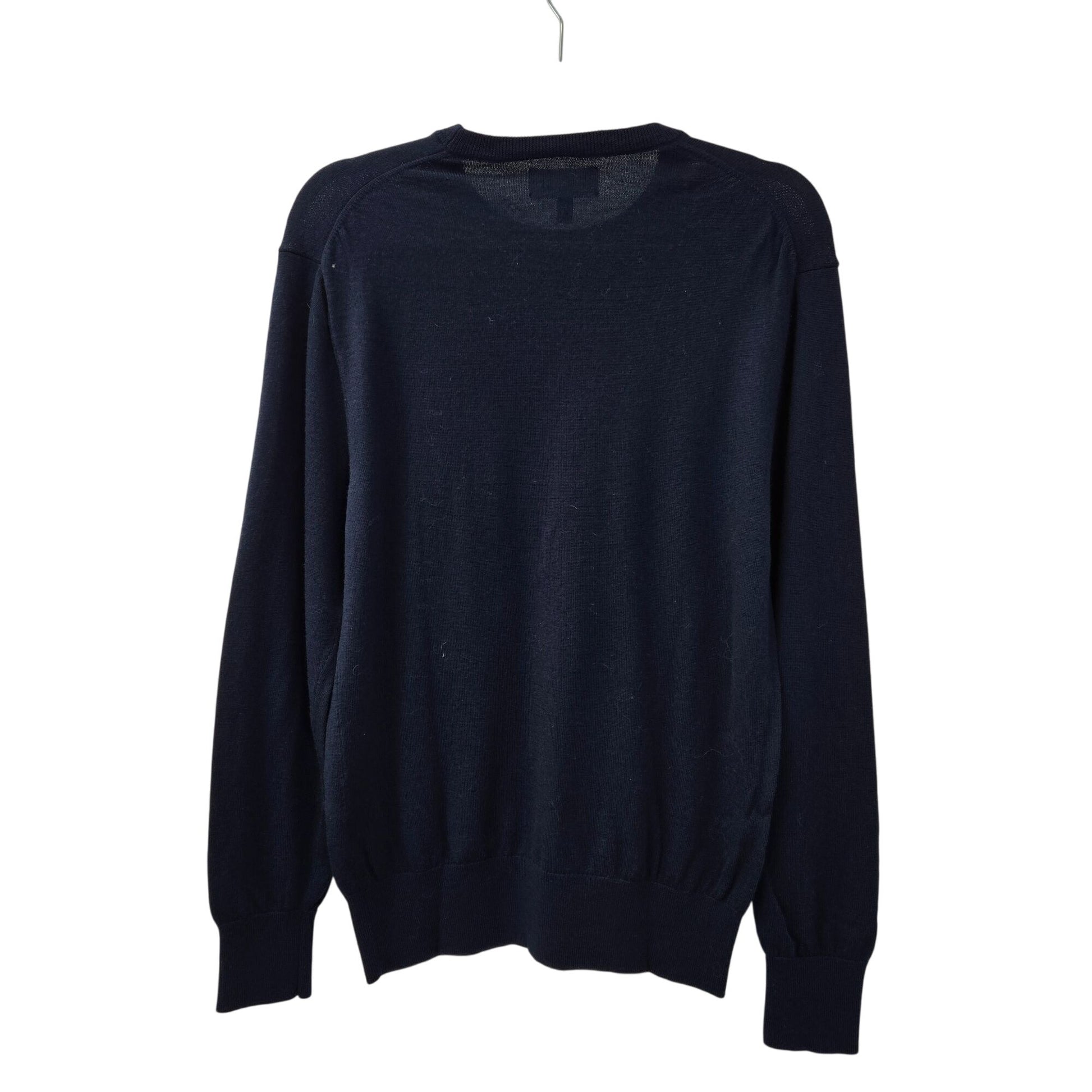 Really nice navy blue crewneck sweater that is 100% merino wool. Defined cuffs and hemline.