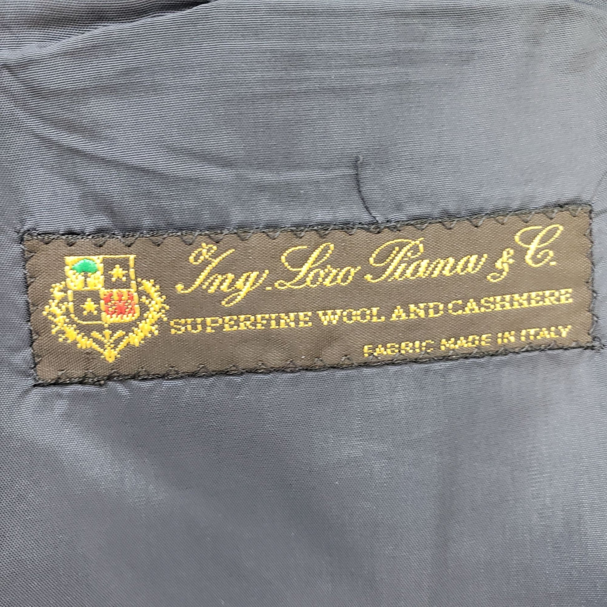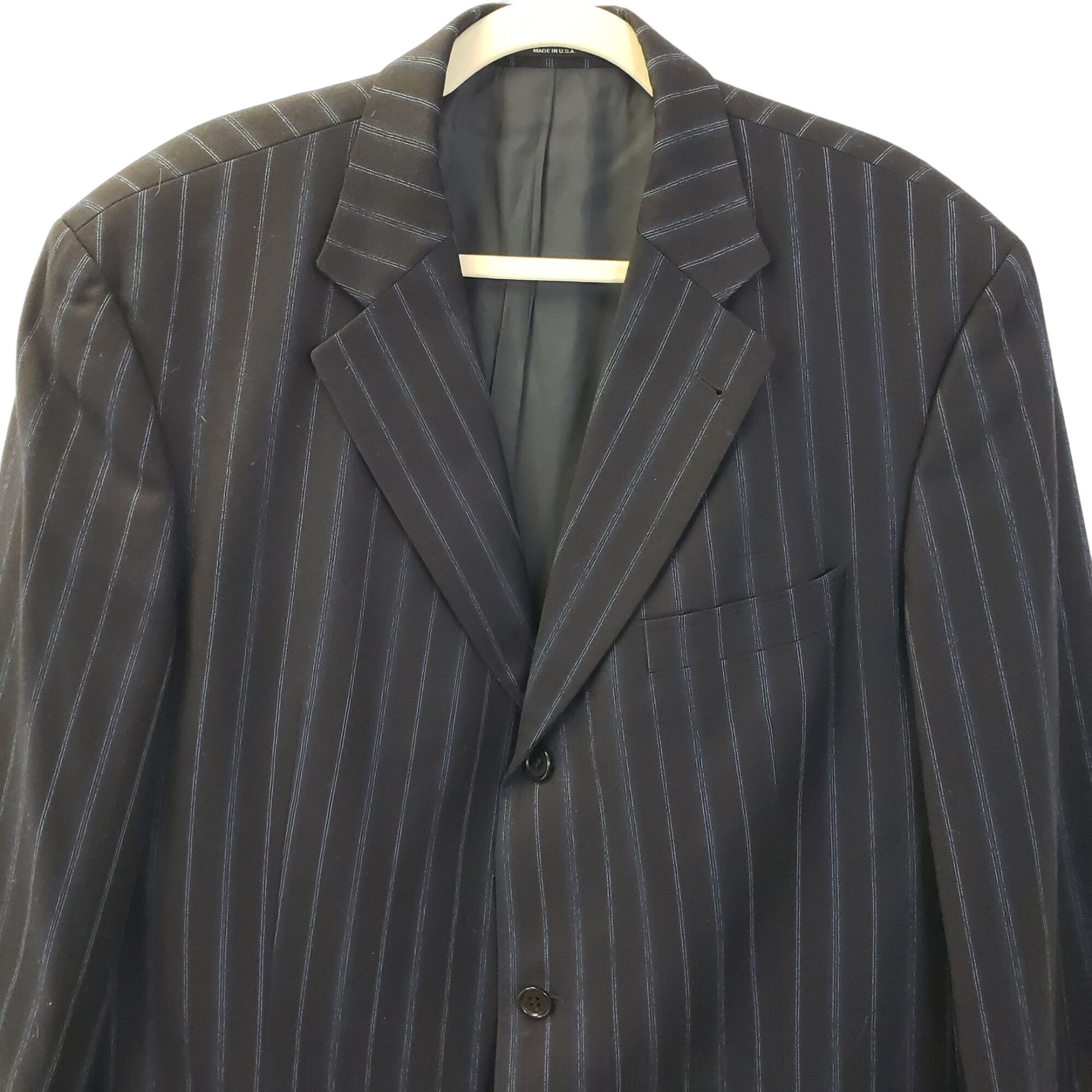 Really nice sport coat that is a blend of wool and cashmere. Black base with blue stripes and three button closure. The lining has two slip pockets. Wear for work, a more formal event or a date night.