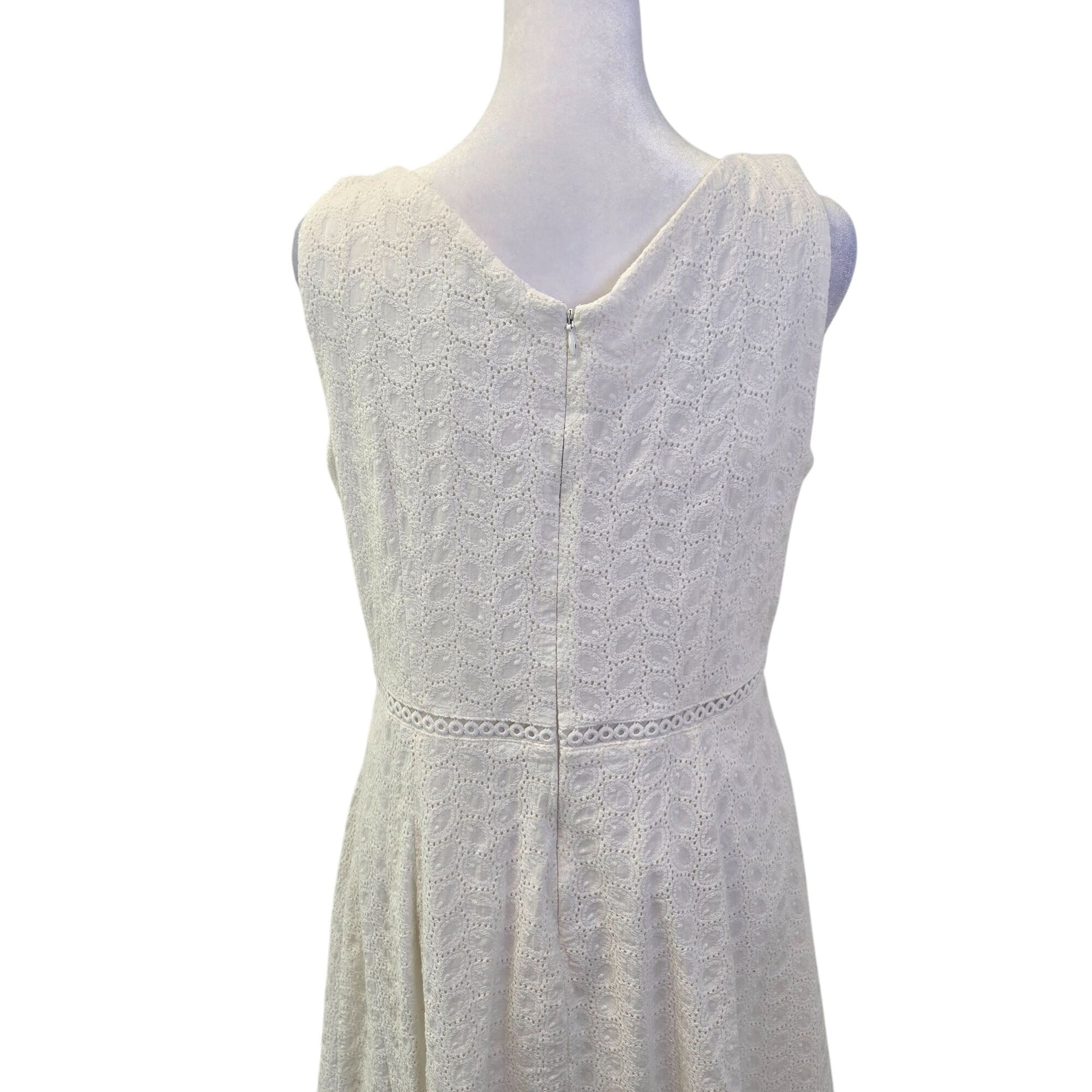 Adorable white eyelet overlay fit & flare dress that is sleeveless, has a back zipper closure and a v-neck design.