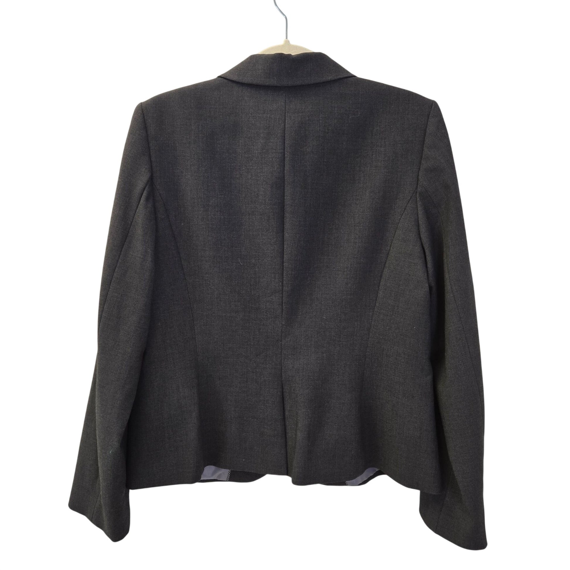Classic gray two button blazer jacket that has branded silver buttons and is fully lined. Front slit pockets and one venting slit at the back. Great career piece.