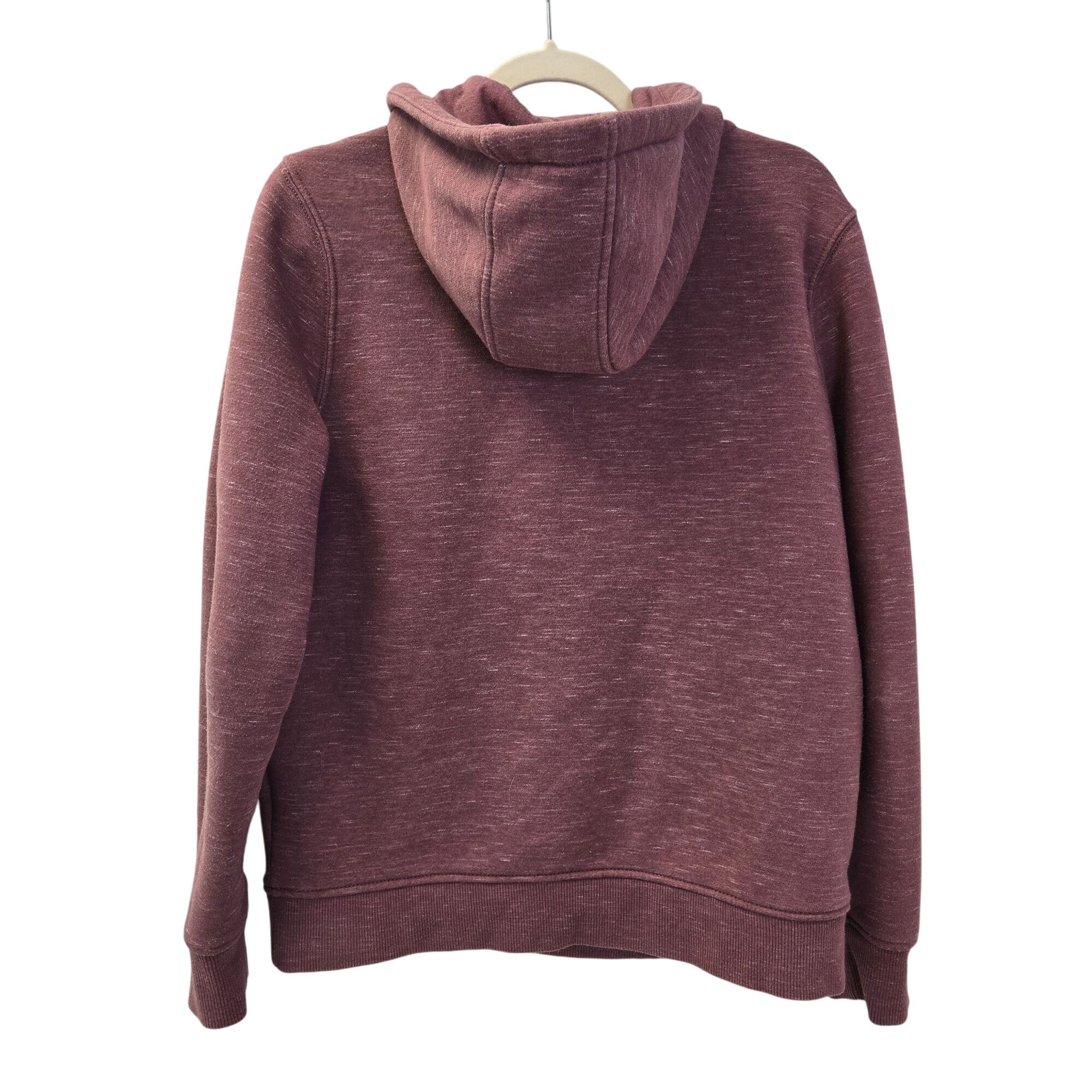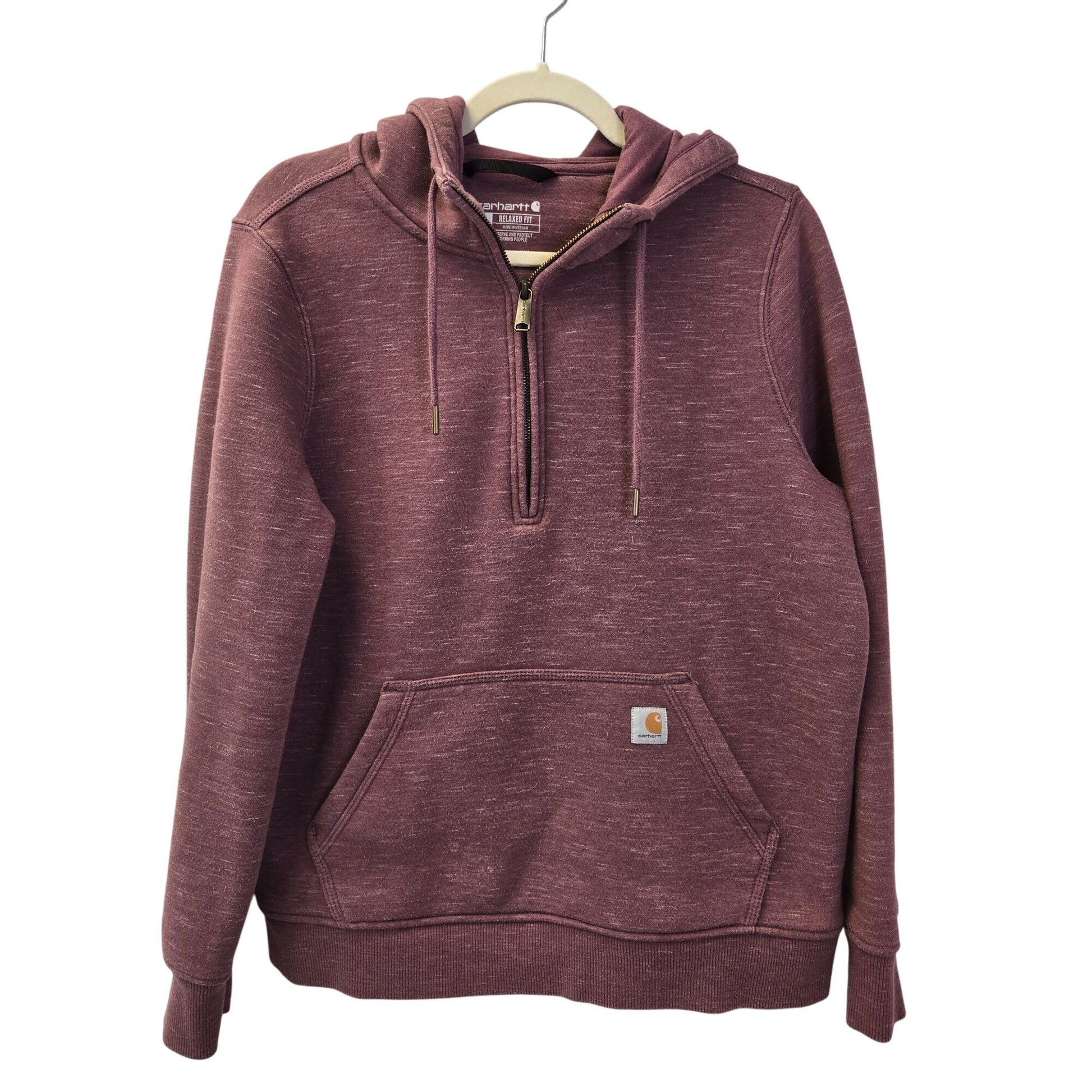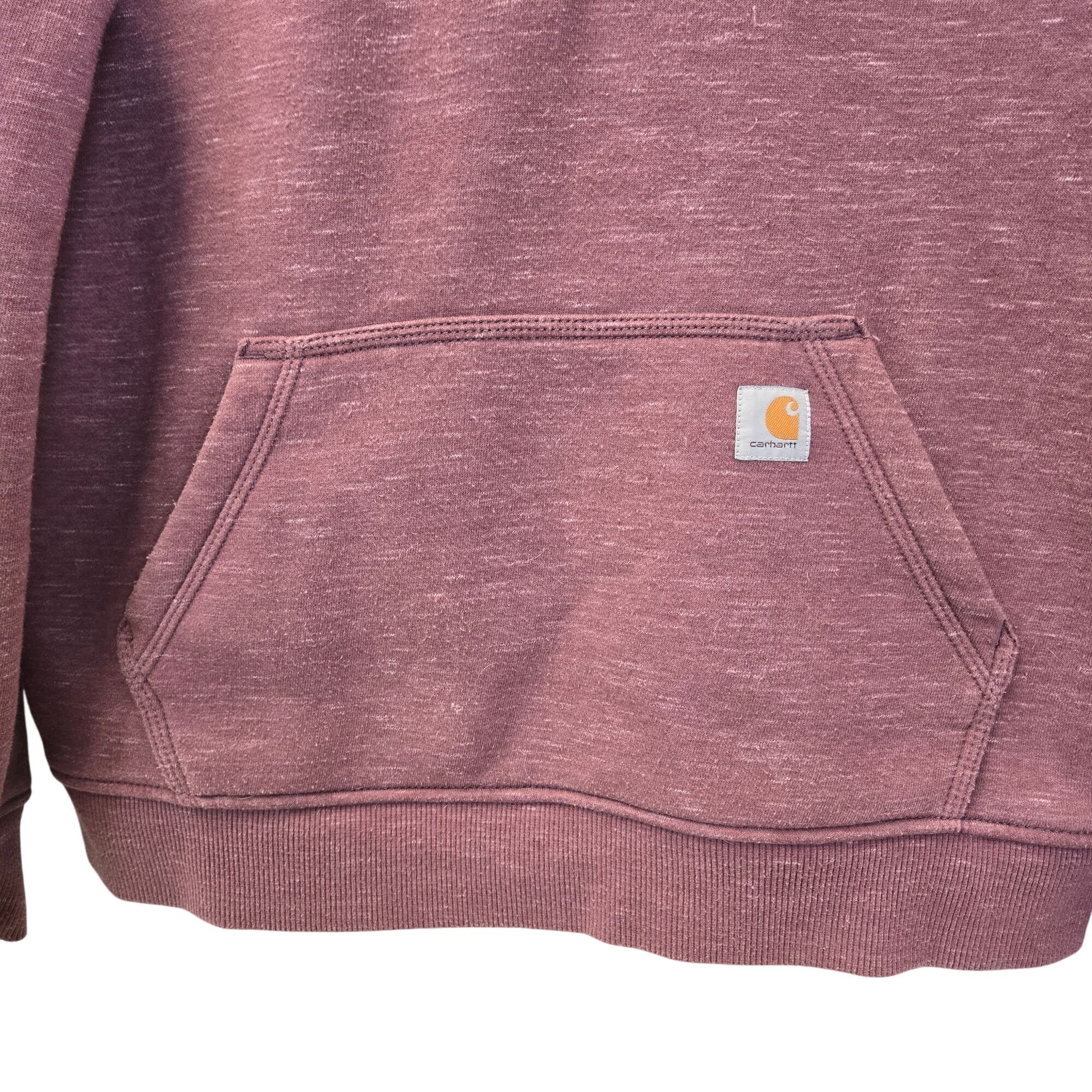 Classic Carhartt hoodie that has a drawstring closure and half-zip detail. Kangaroo pocket on the front. The color is like a purplish-mauve. This is in good condition with just some minor pilling.
