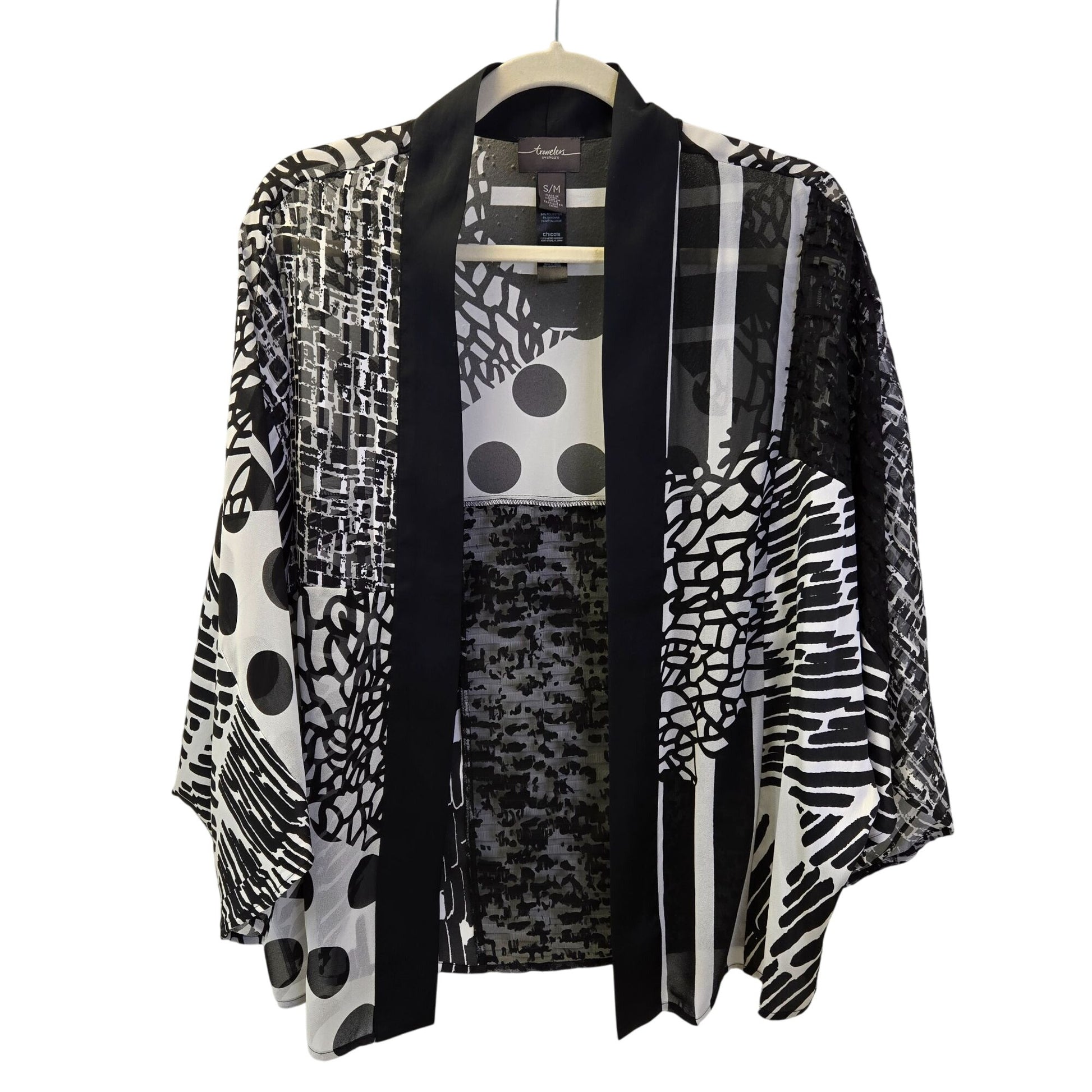 Adorable layering piece that can make a statement to any outfit. Light and flowy, mixed media and large dolman sleeves. Open design with no closures. Pair with a t-shirt or silky cami and with white trousers or jeans.