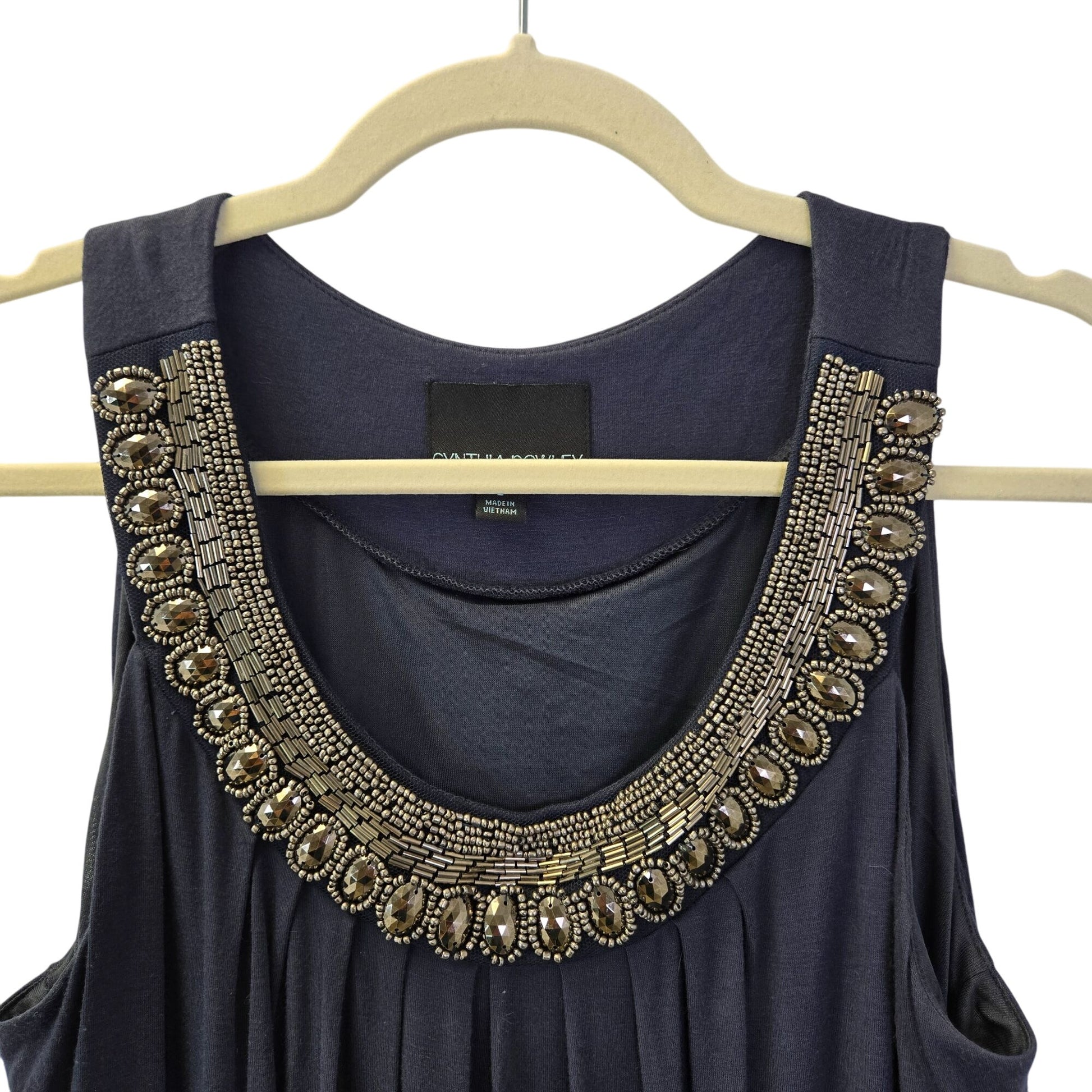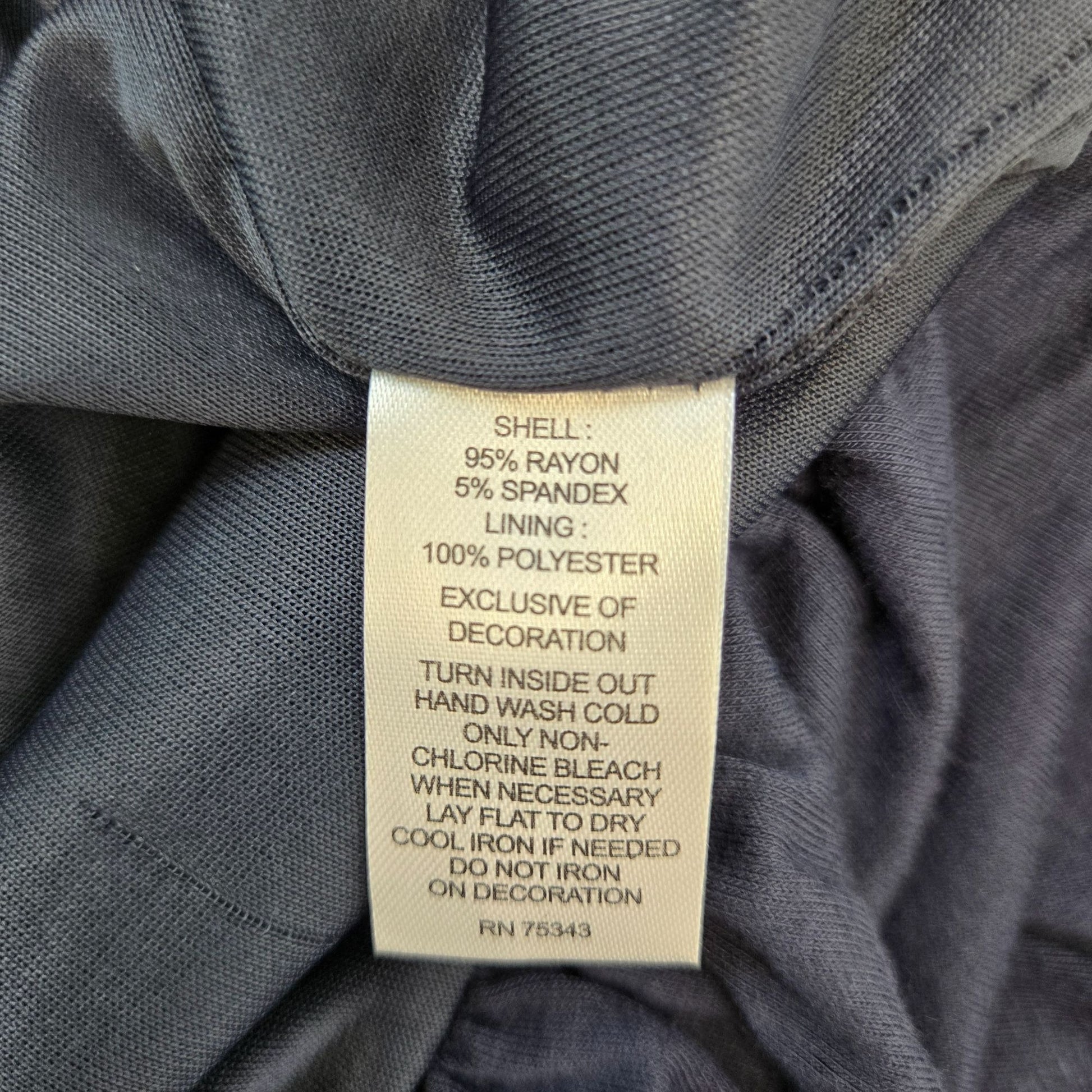 Really cute and flowy top that has a bubble-like hemline and beading all around the front of the neckline. All the beading appears to be intact. Pair with jeans for a casual look or trouser pants for work. There is some slight wash wear on this but still in good condition with a lot of life left in it. The color is like a steel grayish-blue.
