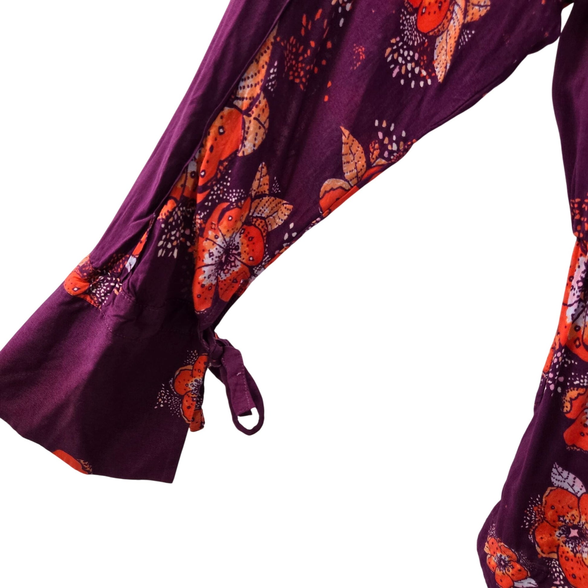 Adorable and bright tunic top that has a wrap feature at the bustline with a lining underneath. Elastic waistline gives a bit of a peplum feel and this has also been described as a mini dress but it would be micro-mini based on the measurements. Ties at the sleeves to finish off the Boho vibes.
