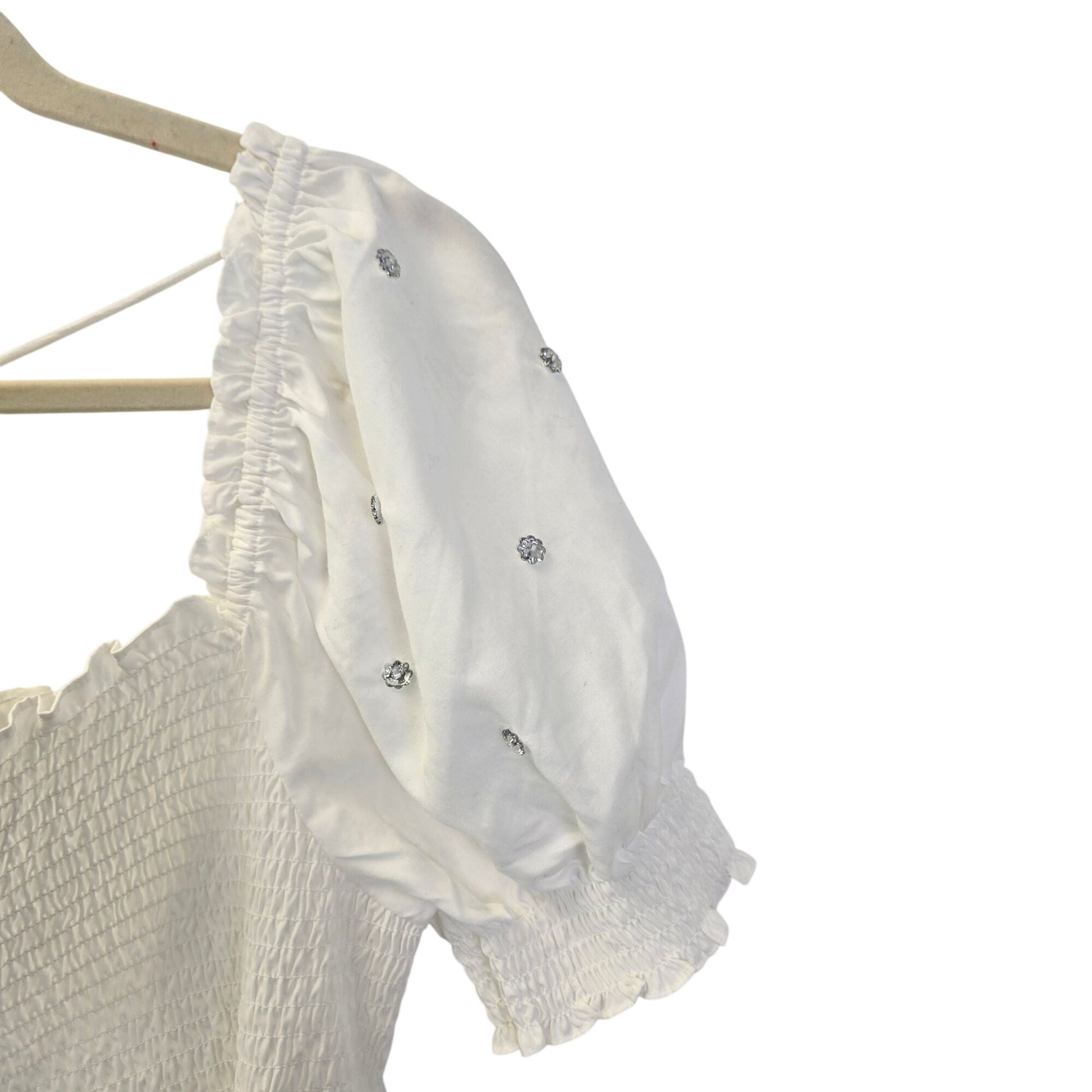 Hill House Home Jeweled Jammie Top, smocked, jewel detailing, puff sleeves, ties in back, ruffled.