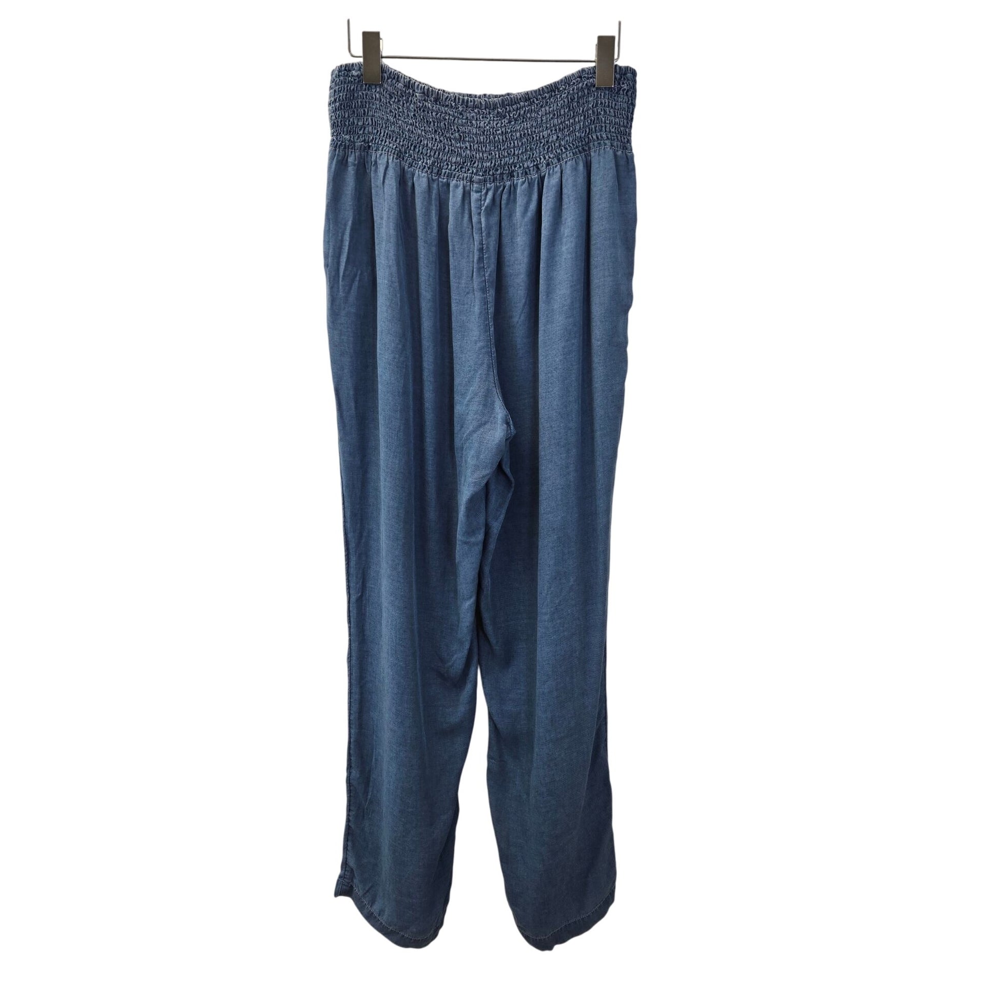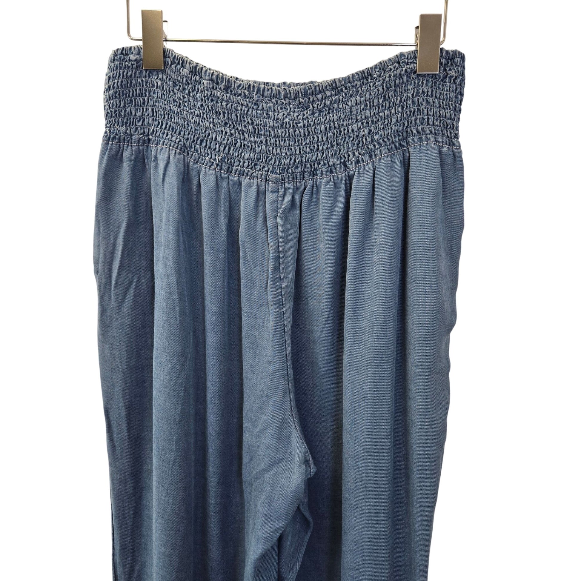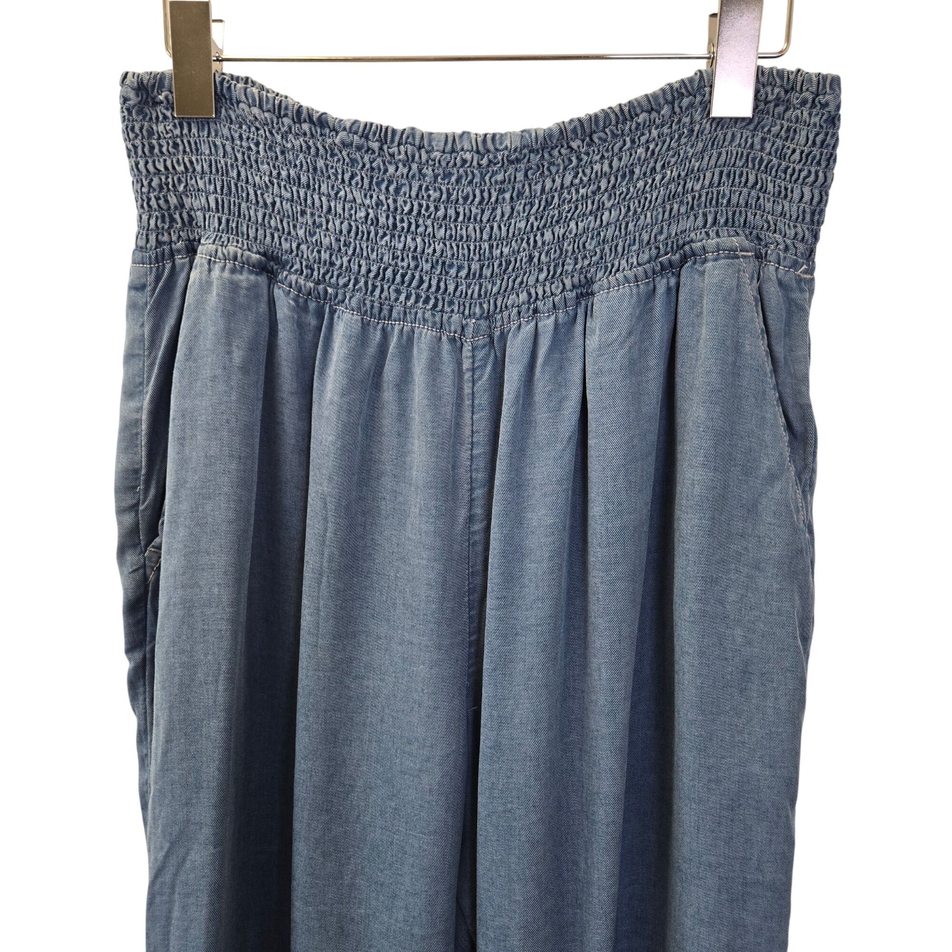 Light and flowy lyocell pants that look like denim. Pull on style with a stretchy smocked waistband and front side pockets. There is just some light wash wear on these, mainly near the hemline. Otherwise, these are still in good condition with a lot of life in them.