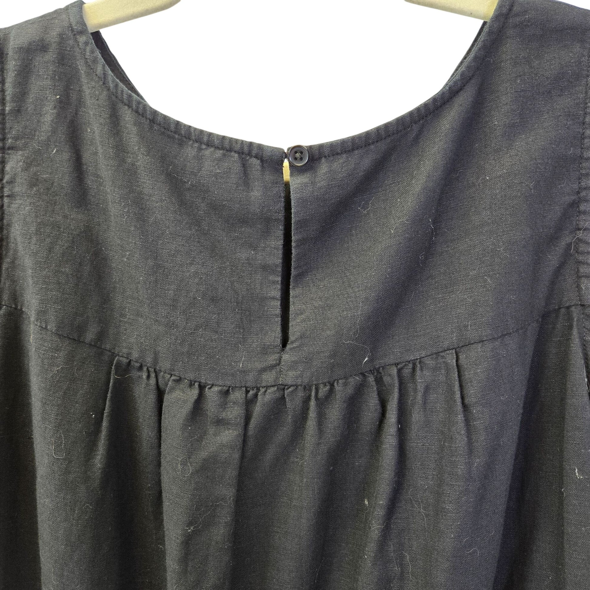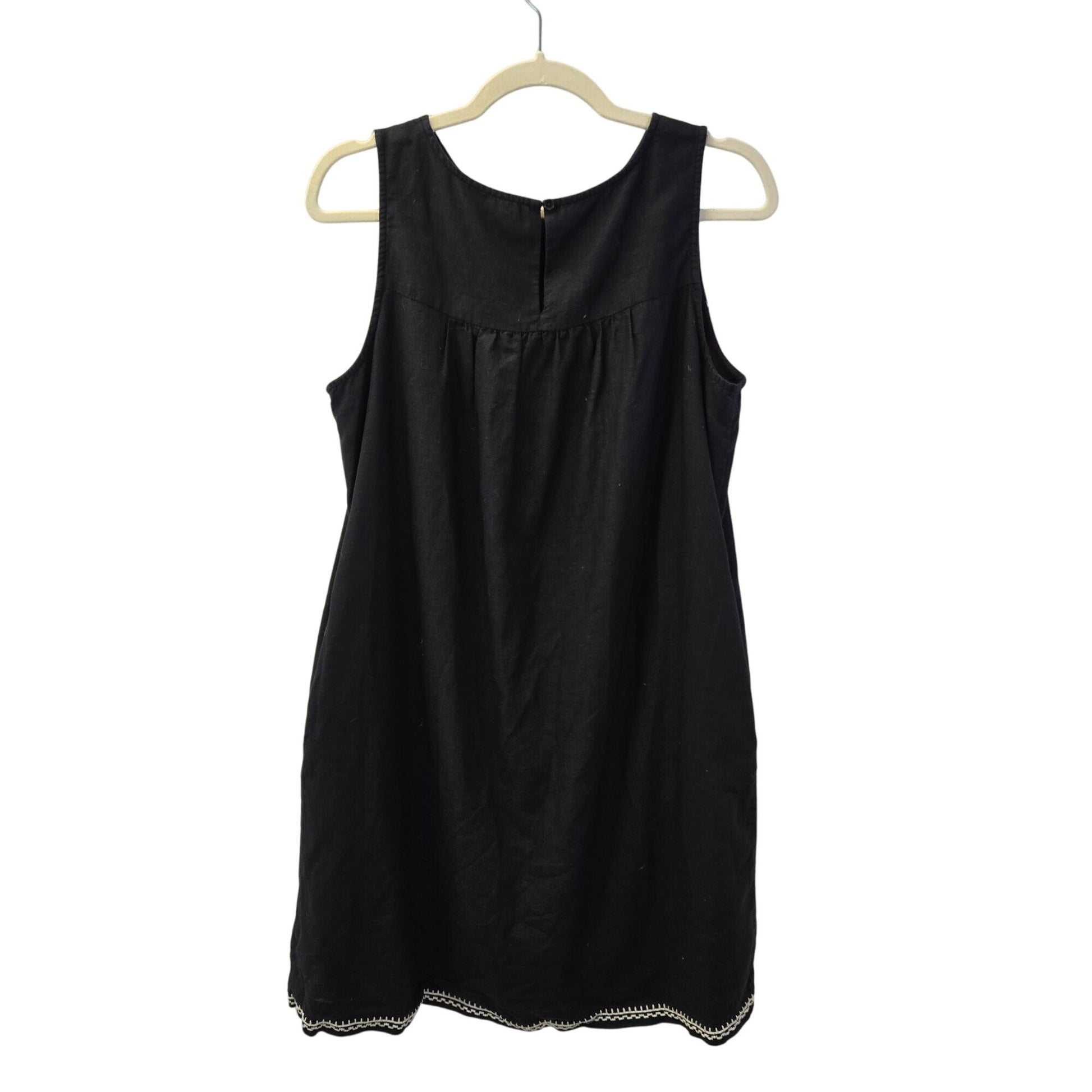 Adorable linen blend shift dress that has floral embroidery at the neckline and at the hemline. Back button closure and side pockets. There is some minor wash wear, especially at the neckline but otherwise this is still in good condition with a lot of life in it.