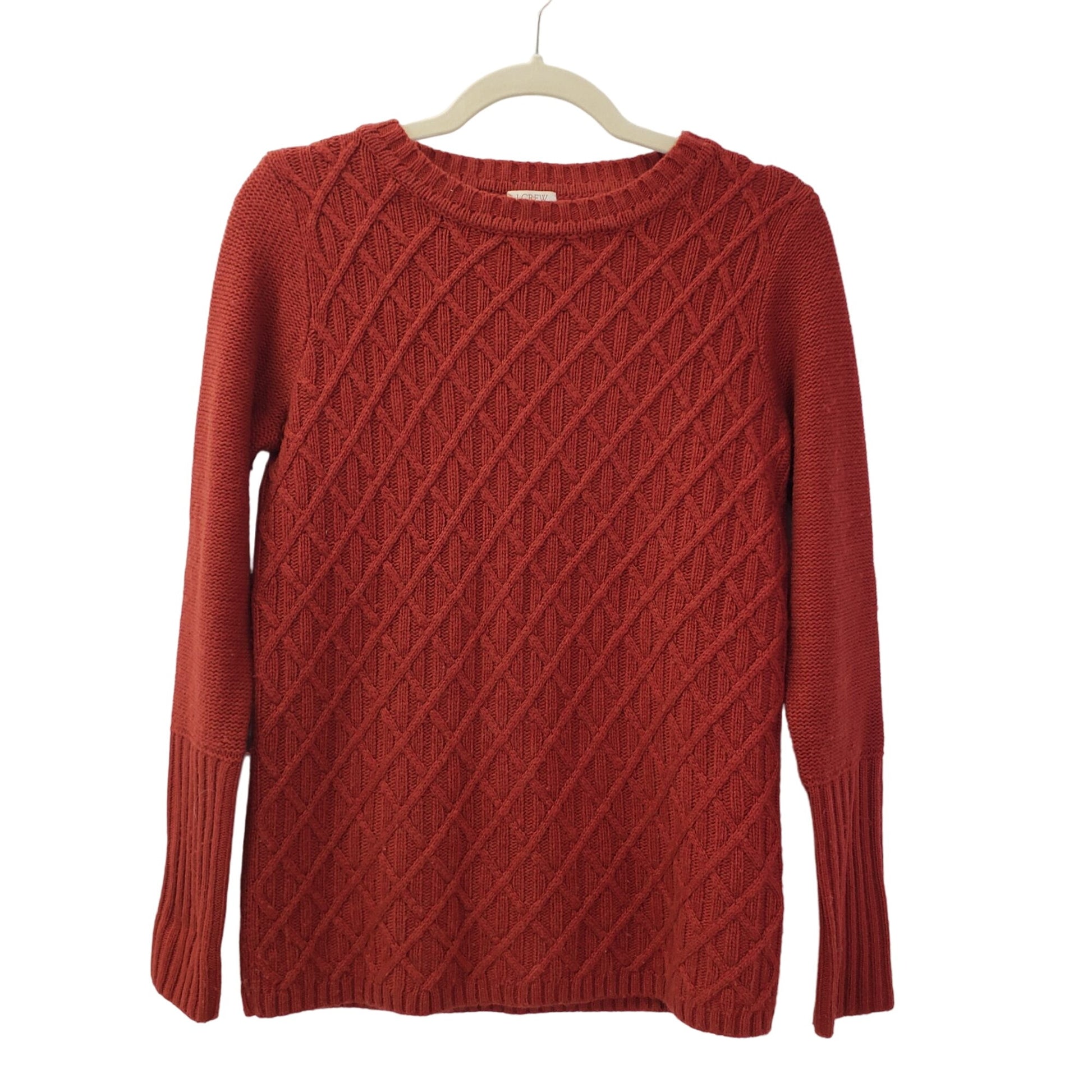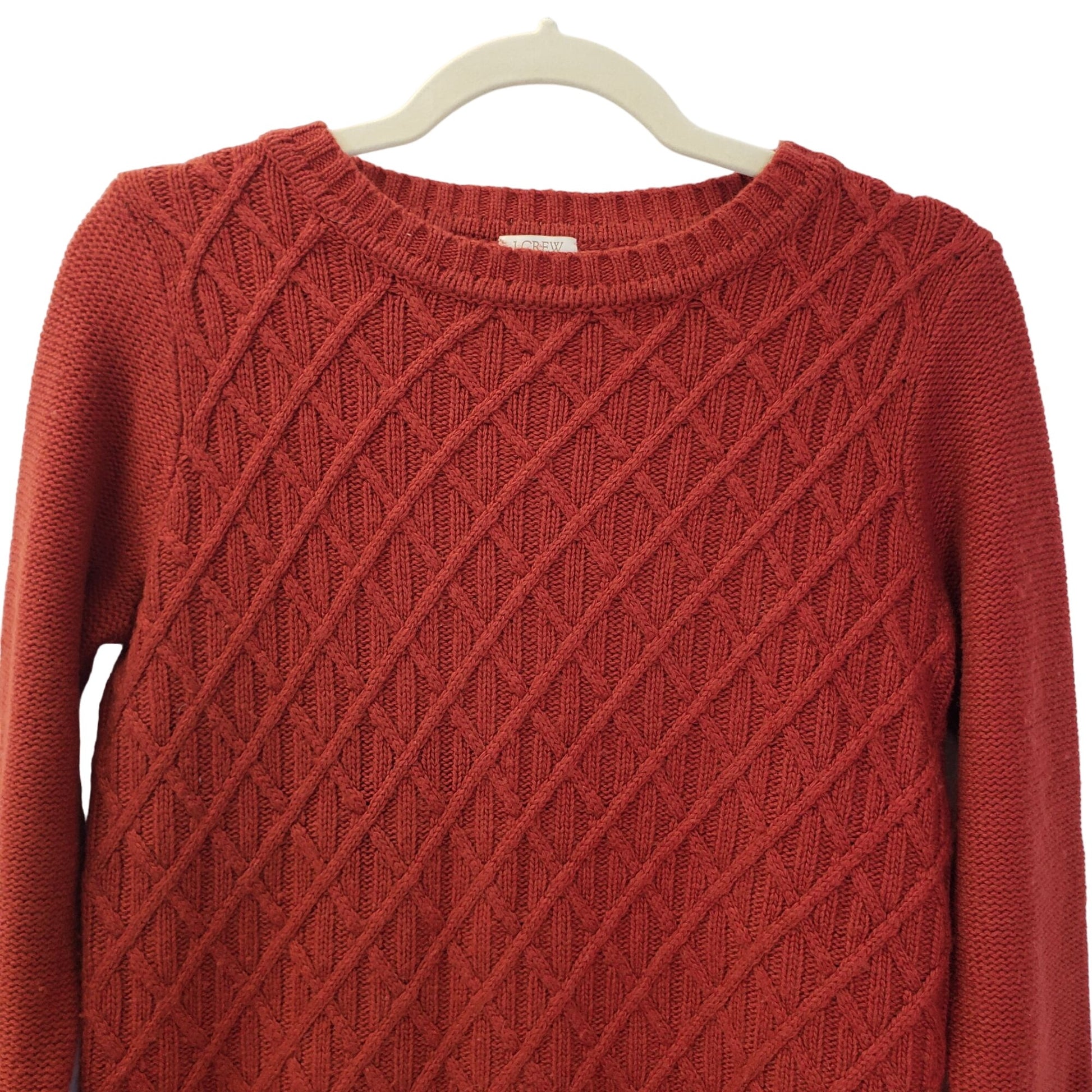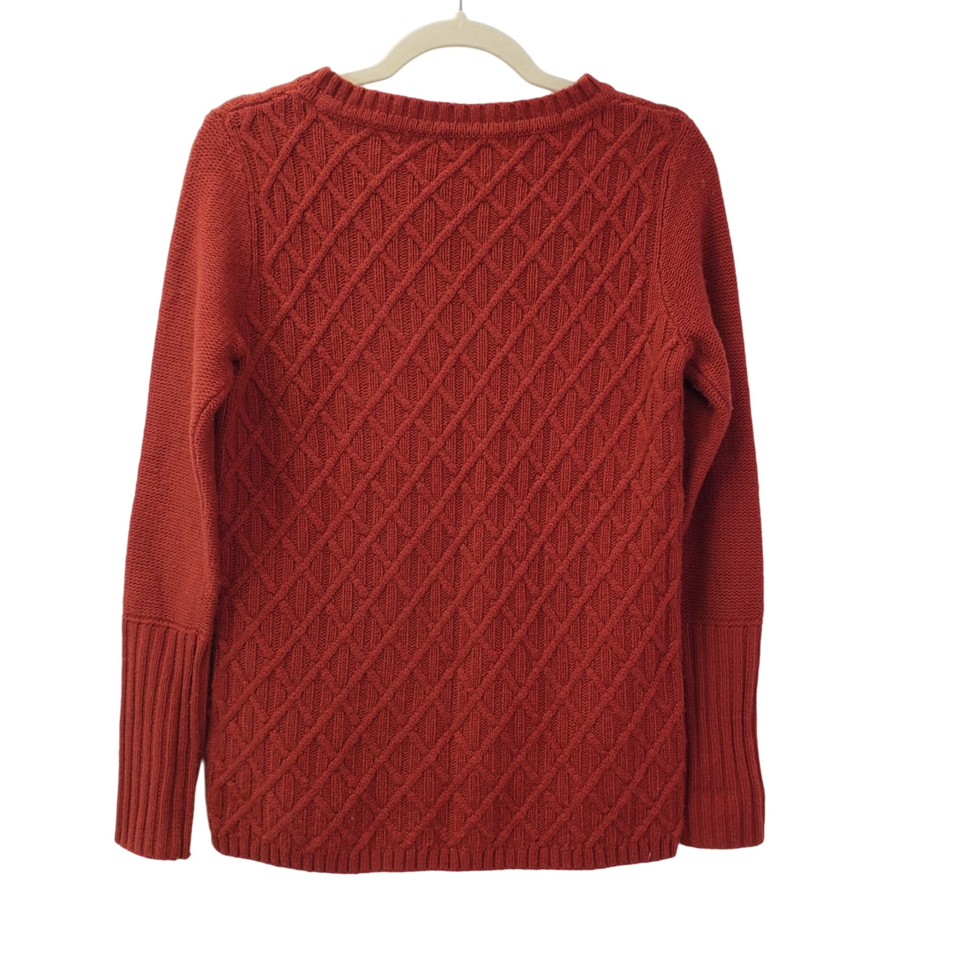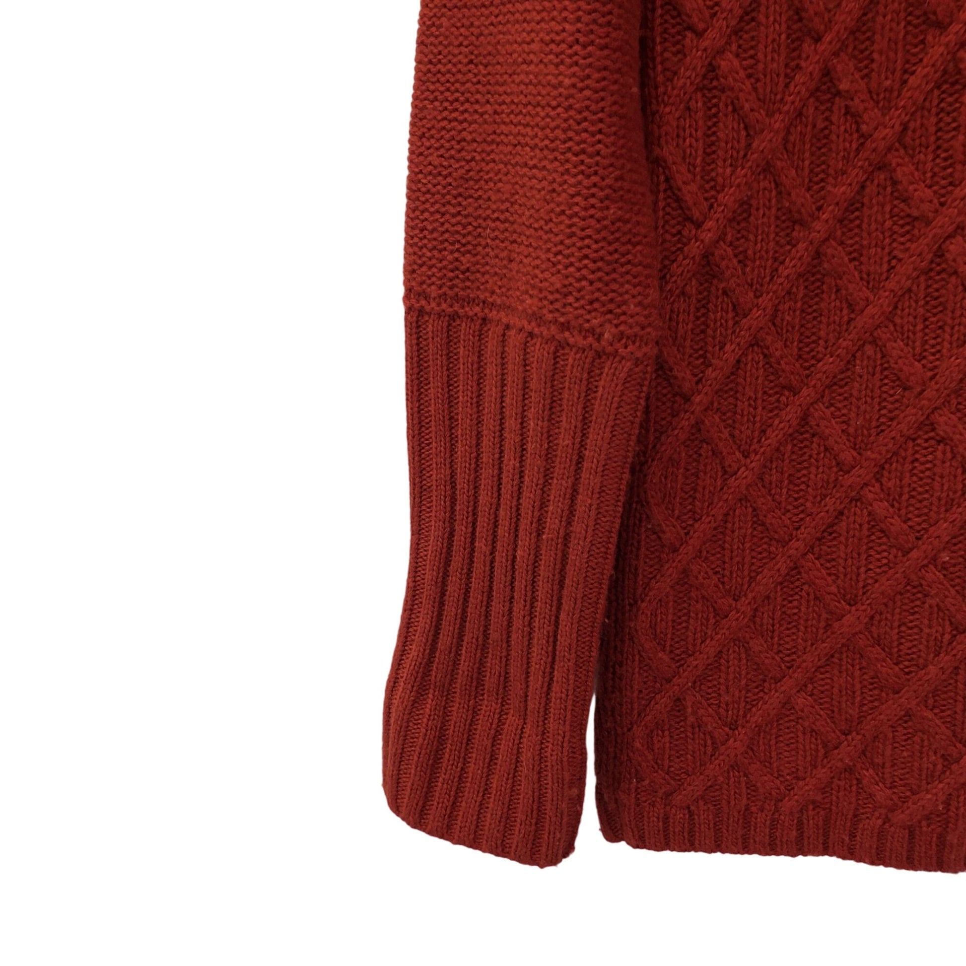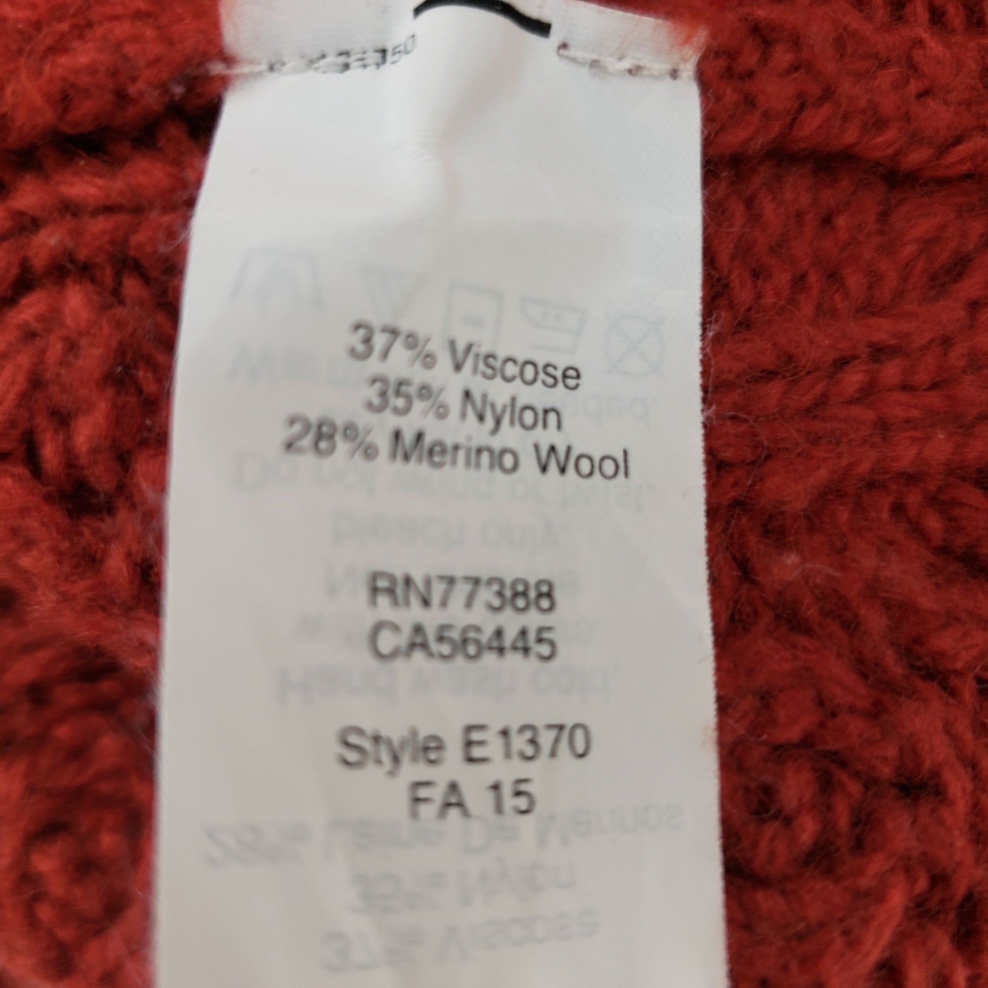 Soft wool blend sweater that has a cable knit design on the bodice and large arm cuffs. Great piece to pair with a button down shirt for work or a casual day. The color is like a deep burnt orange. There is some light pilling on this that could come off with a good sweater shaving.
