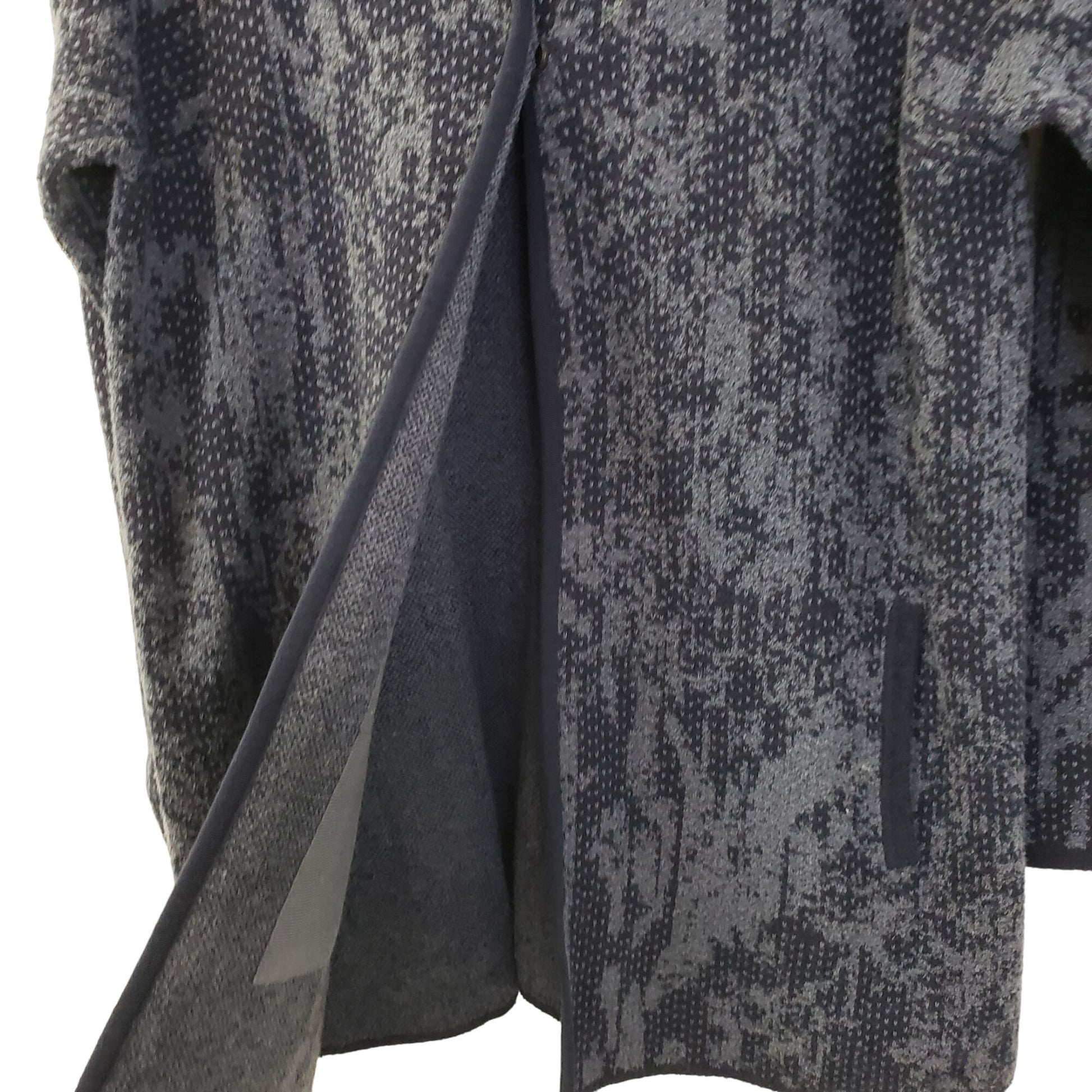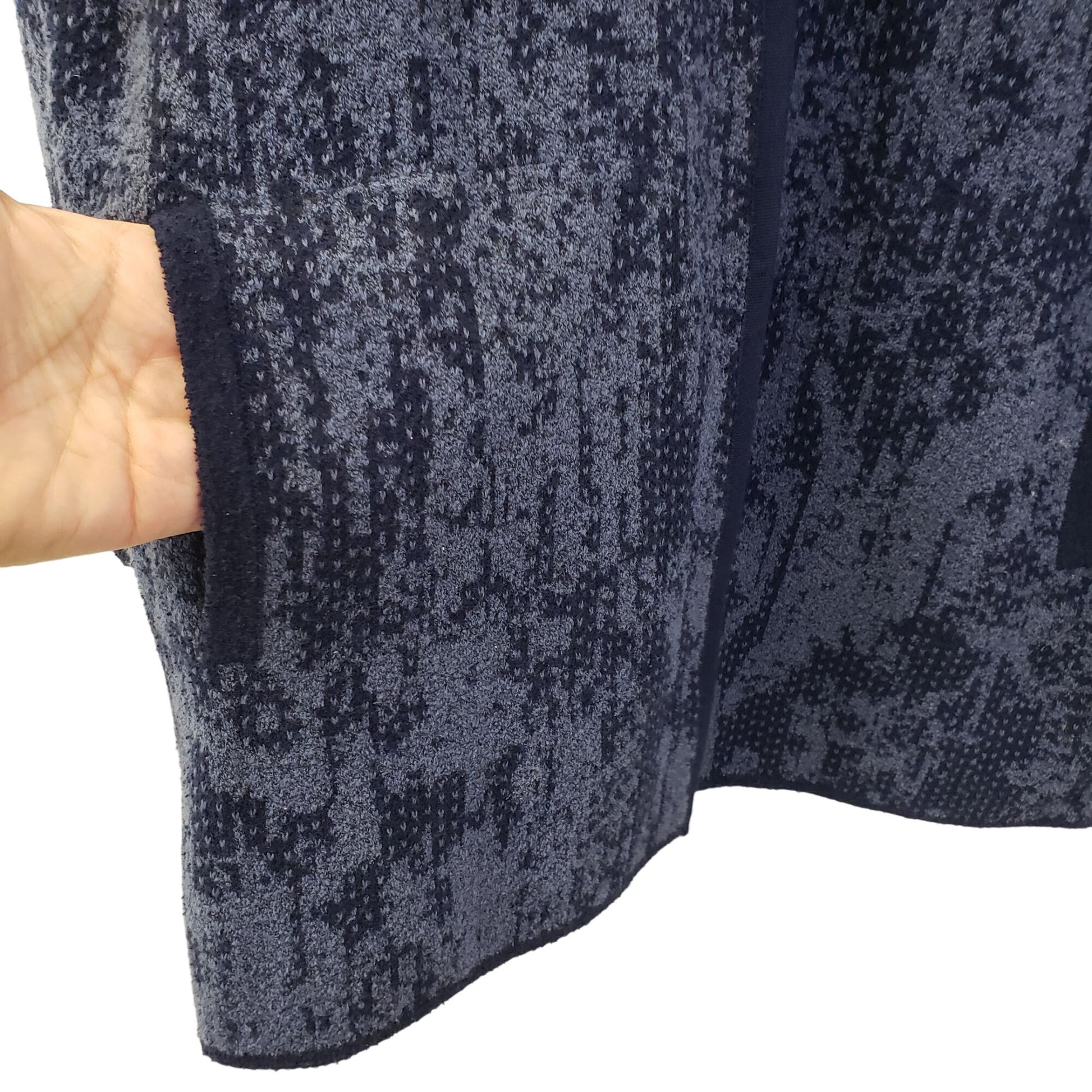 Really cute graphic pattern longline cardigan sweater that has a quarter snap closure at the collar and top and then the rest of the front is open. Side slit pockets. Great for layering for work or just lounging around the house.