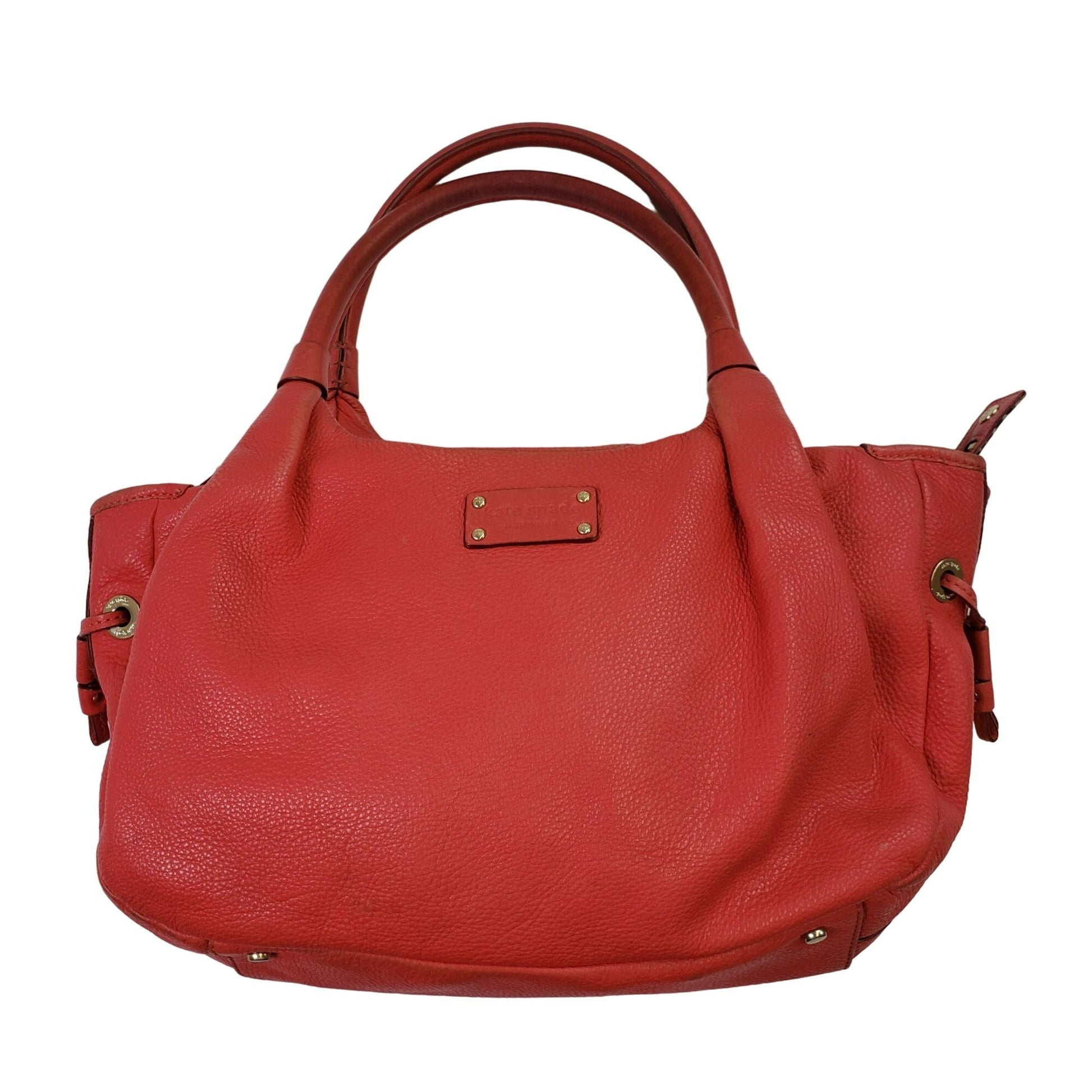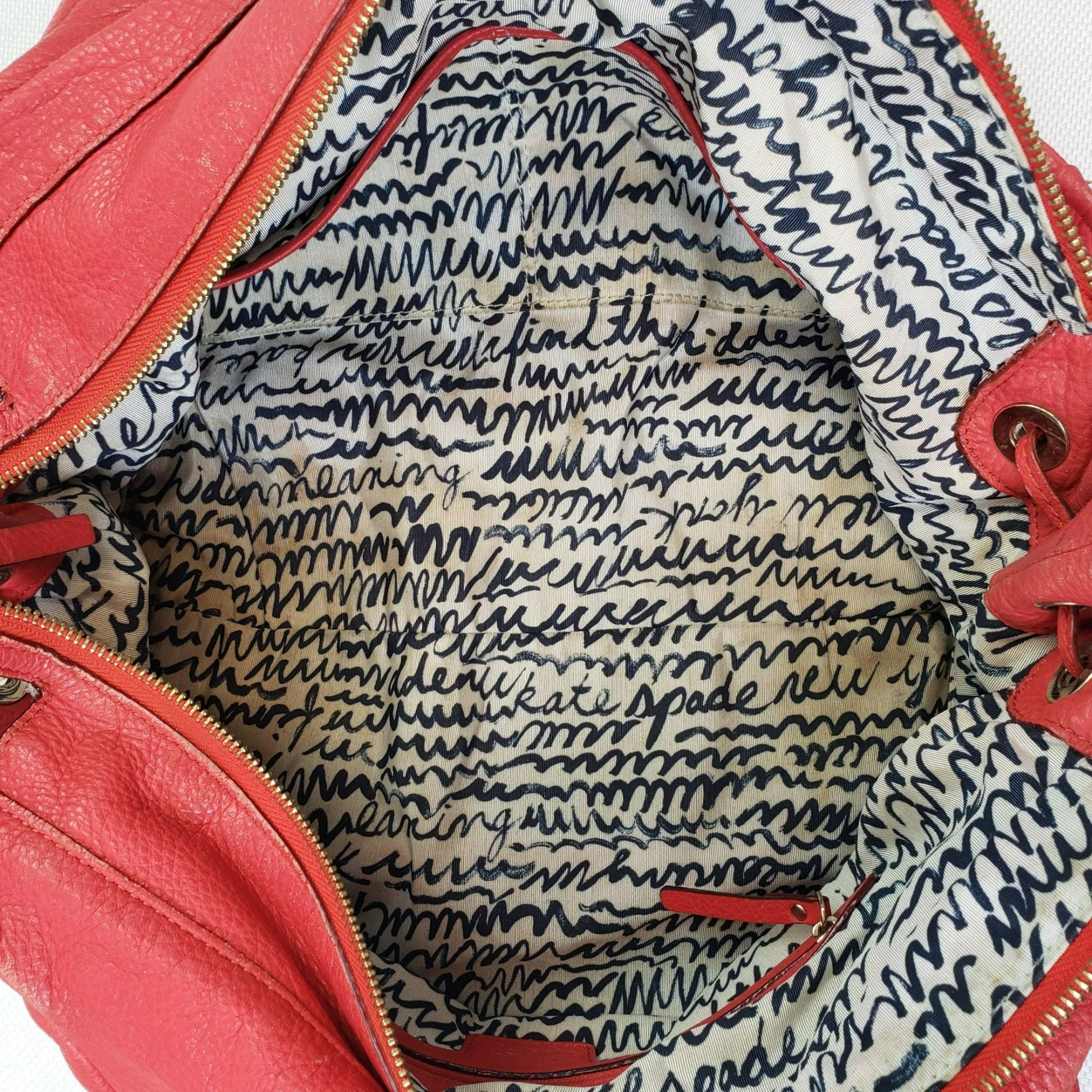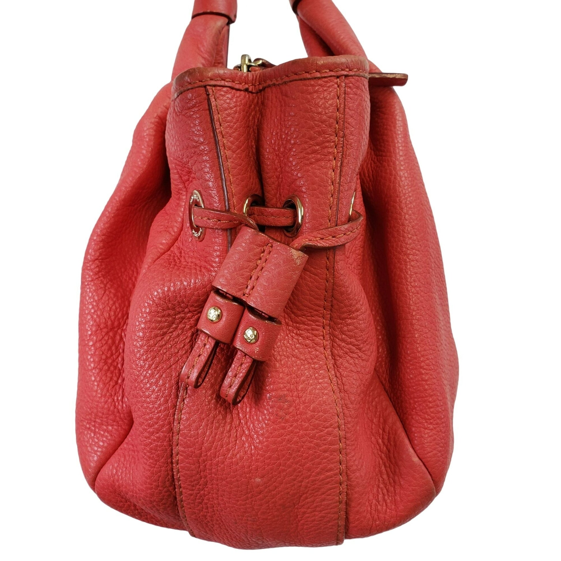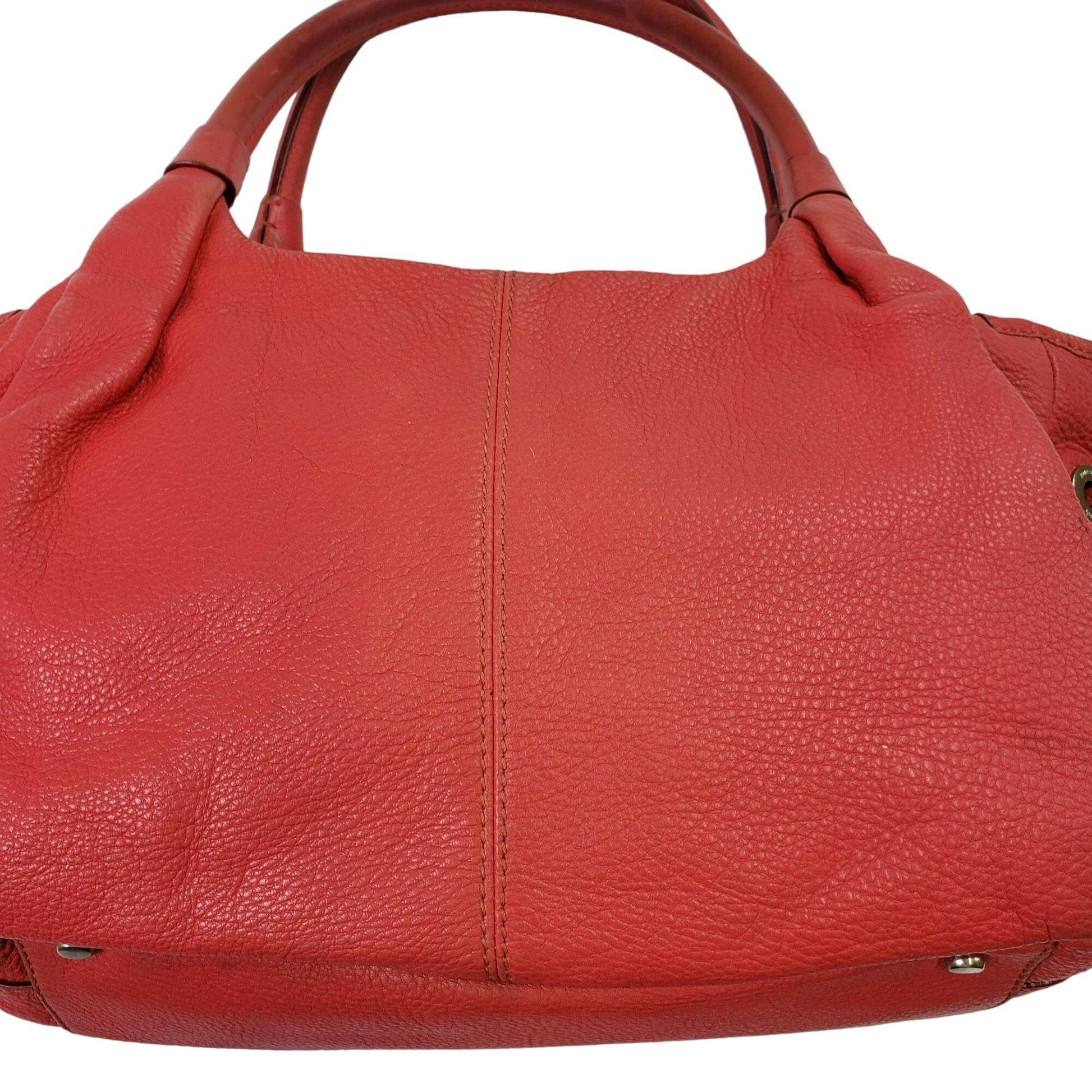 CONDITION NOTE: Please see all pics as there are several areas of wear and fading to the bag overall. This is more of a reddish-salmon color than a true red. The handles have some discoloration and the inside has some stains but it looks a lot better now that we tried to clean it the best we could.
