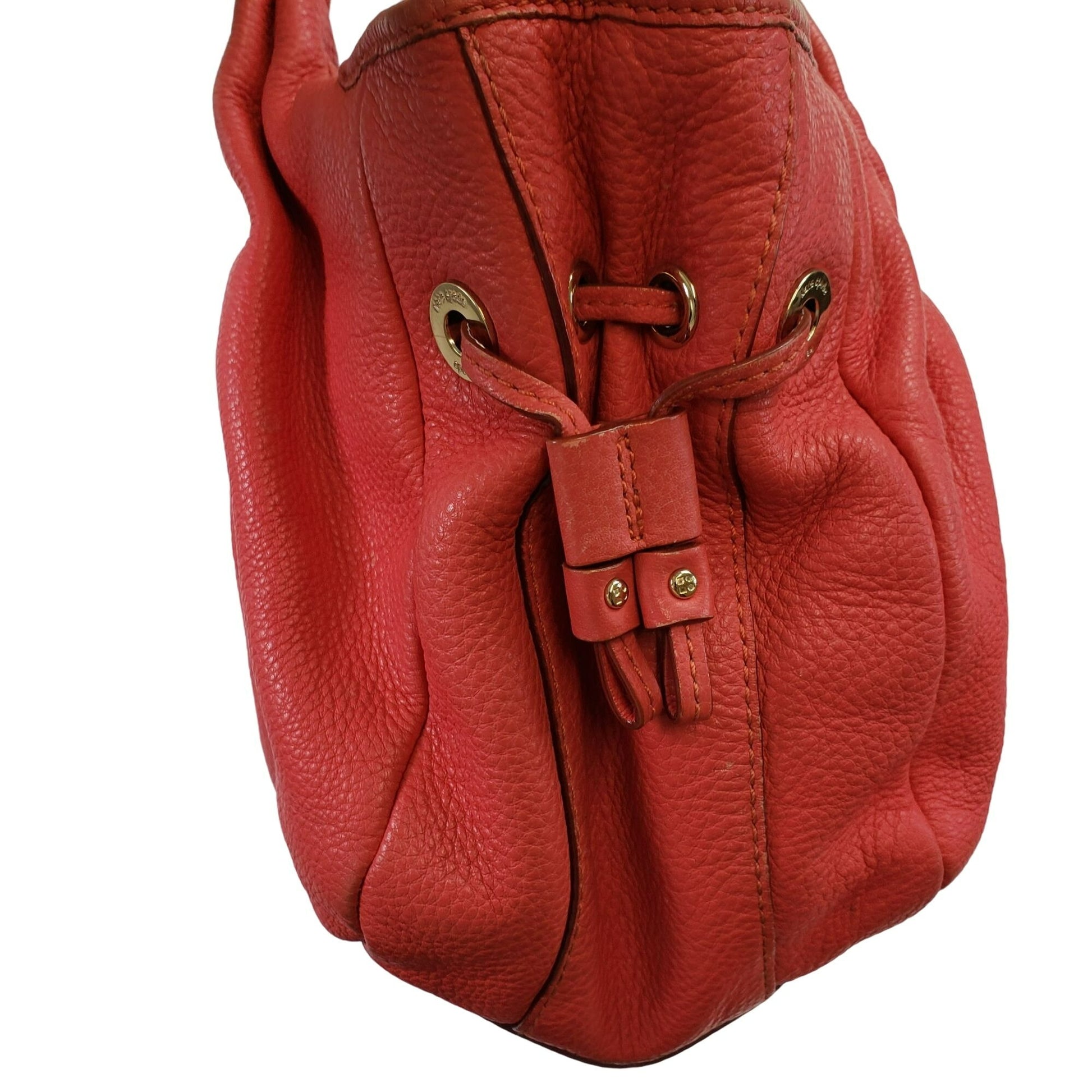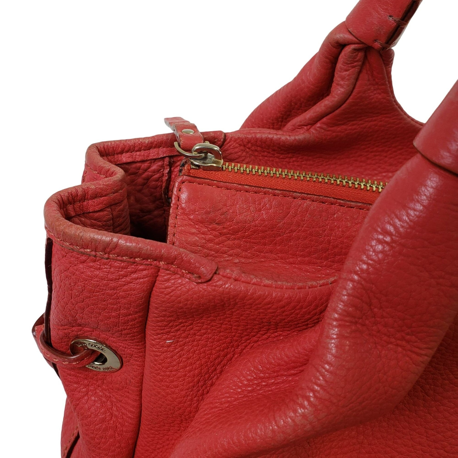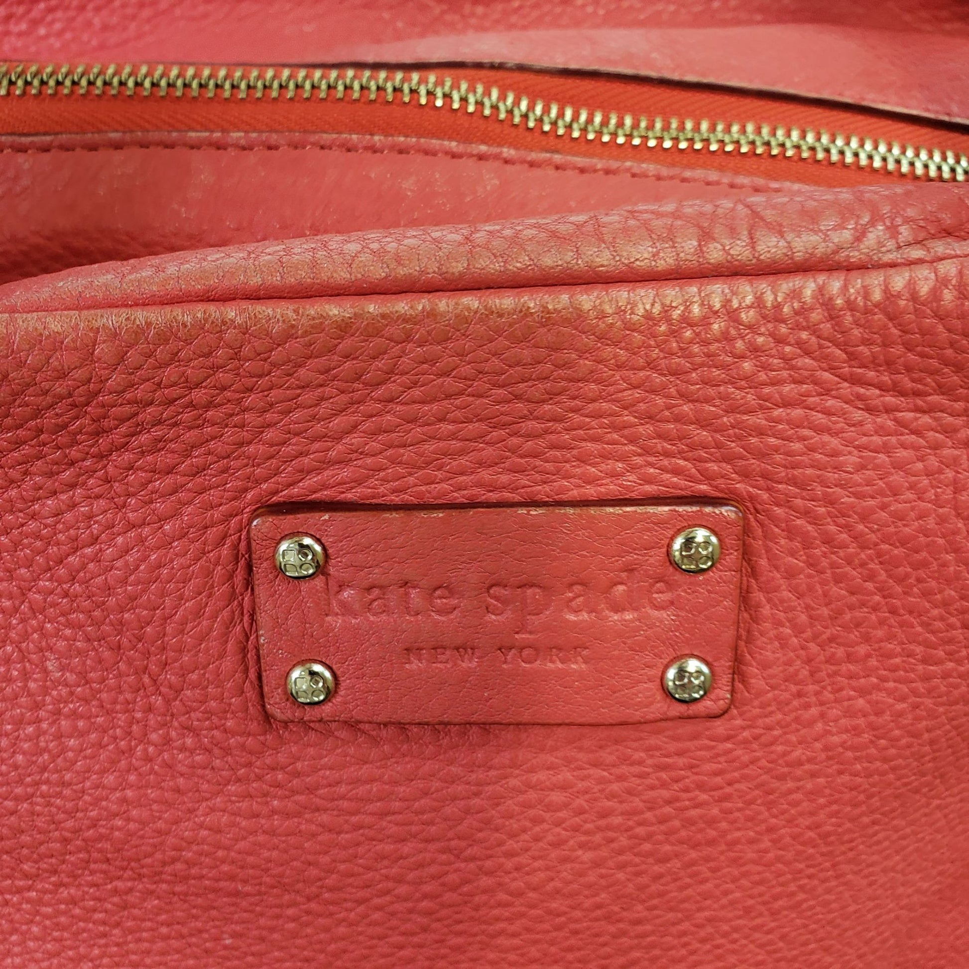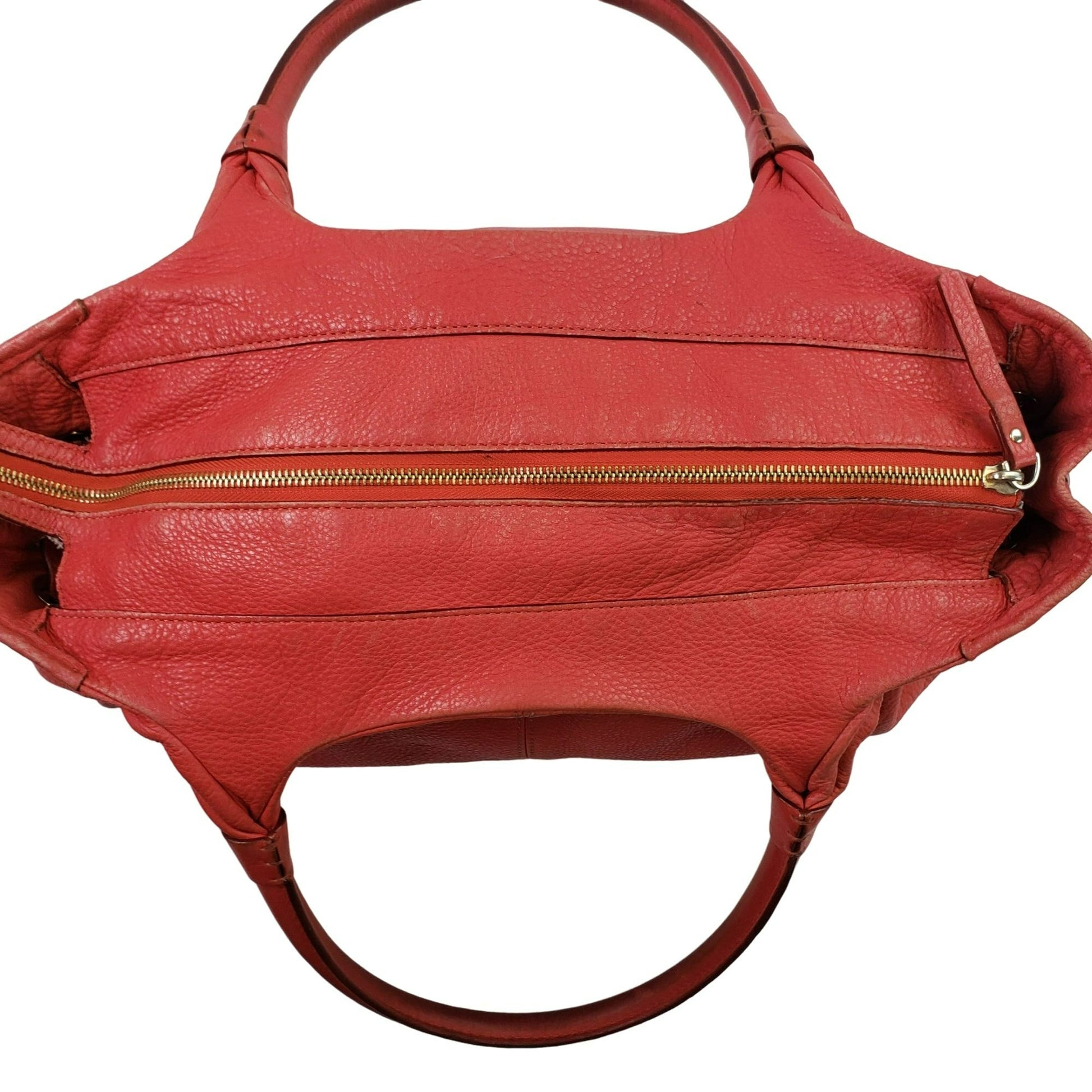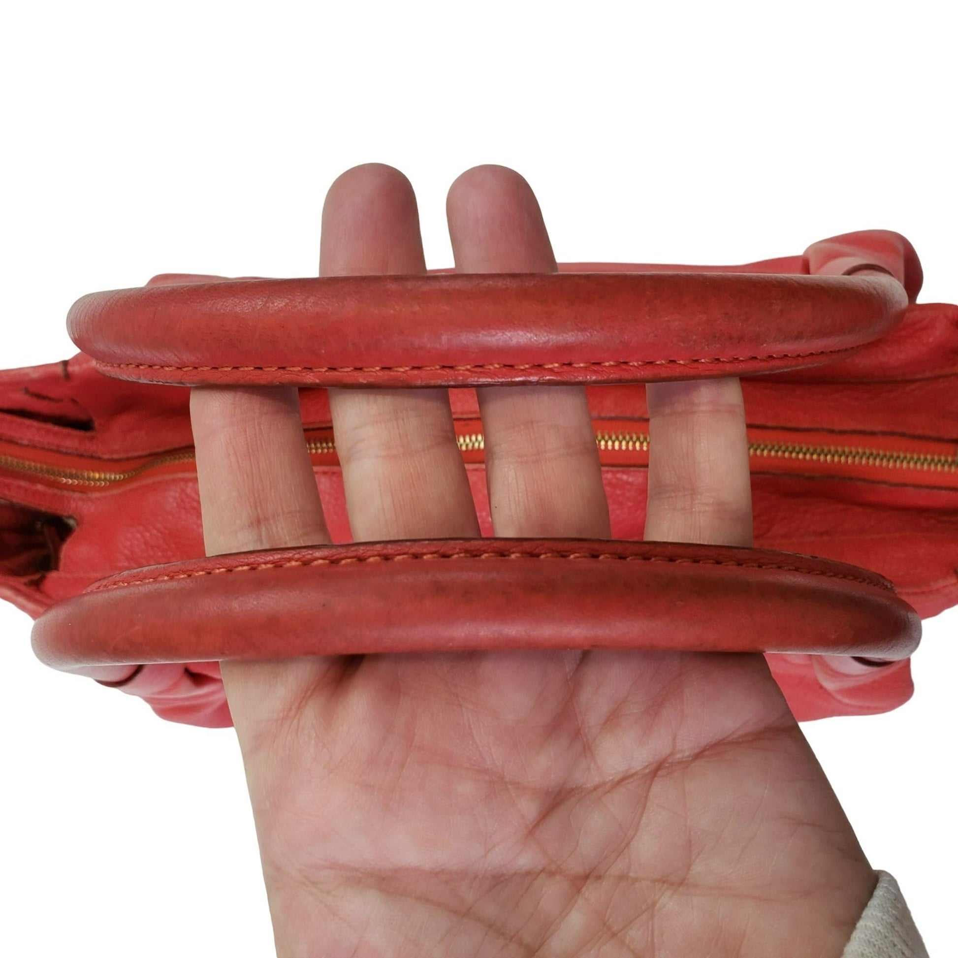 CONDITION NOTE: Please see all pics as there are several areas of wear and fading to the bag overall. This is more of a reddish-salmon color than a true red. The handles have some discoloration and the inside has some stains but it looks a lot better now that we tried to clean it the best we could.