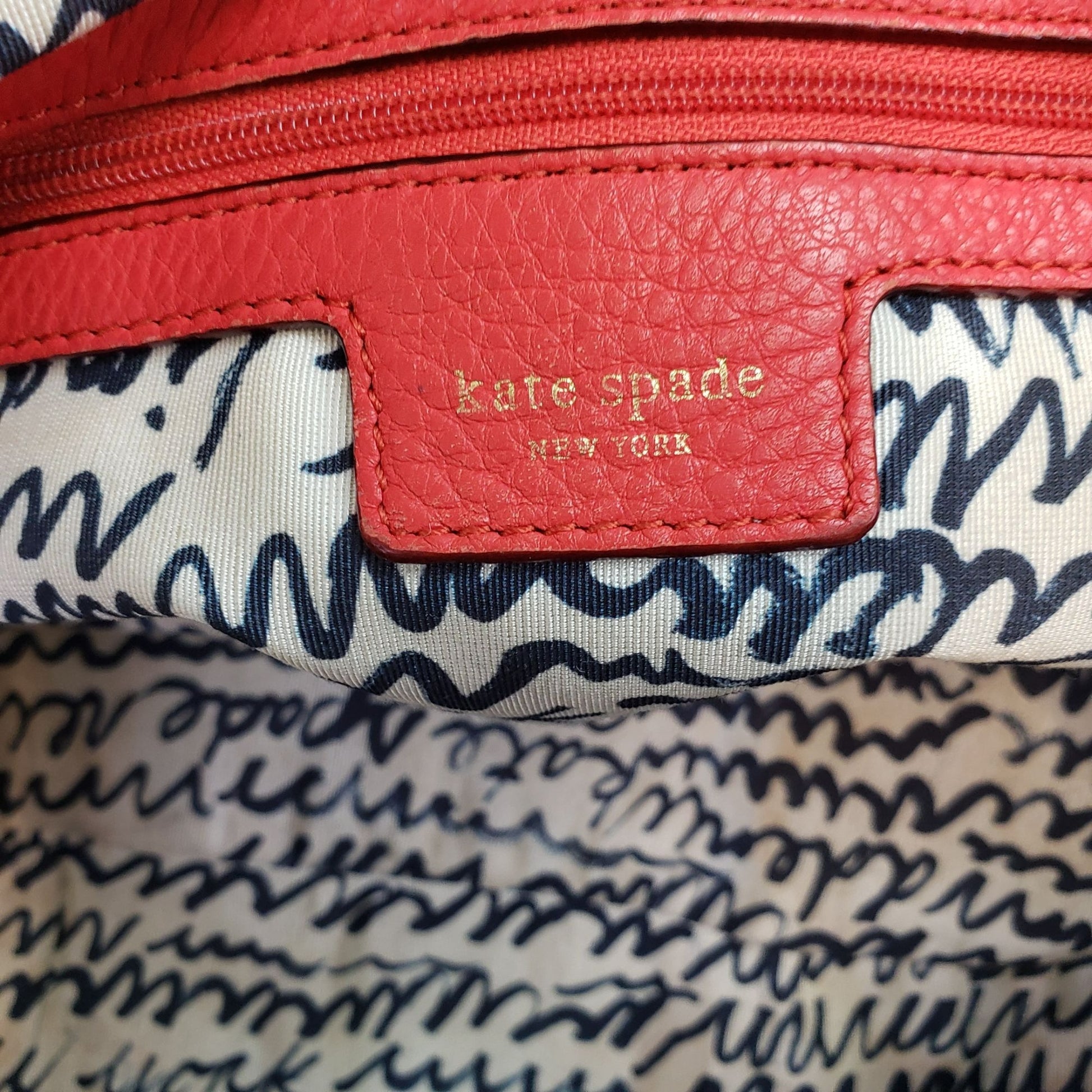 Soft pebble leather medium sized handbag that is classic Kate Spade quality. Top zip closure, side cinches with tassel and gold hardware. The inside has one zip pocket and two open pockets with logo graphic lining.
