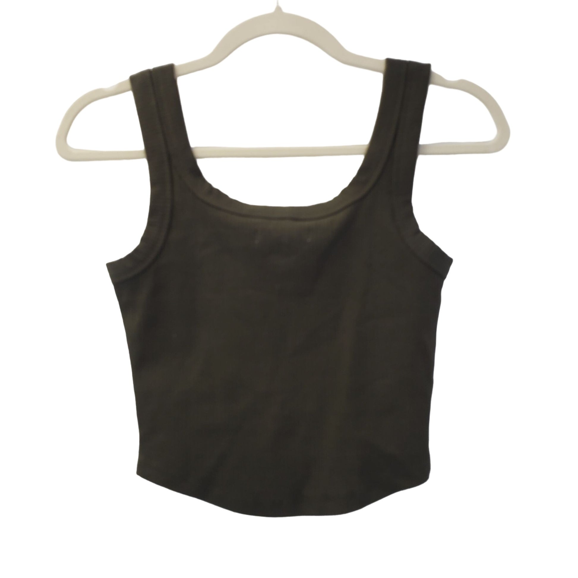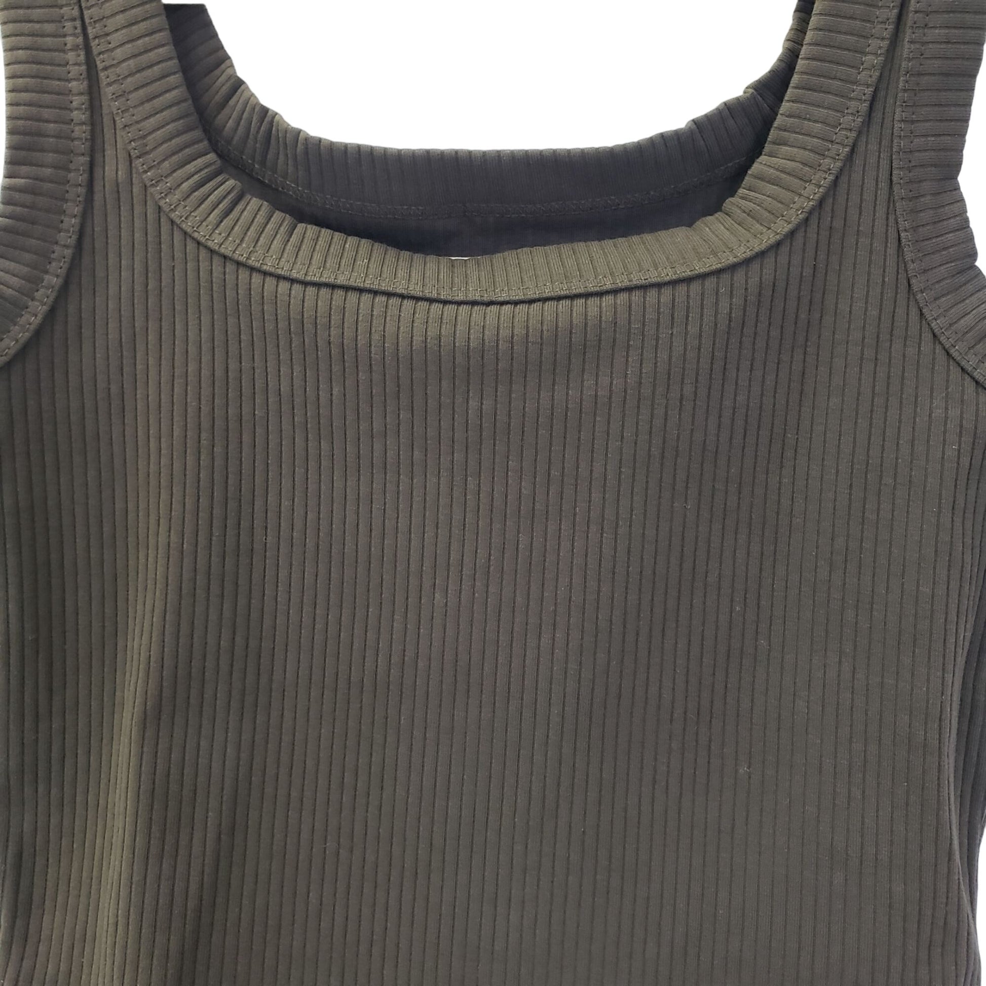 Adorable olive green ribbed crop tank top that is a great piece for the summer to attend a festival or take on vacation. Pair with jean shorts or some wide leg high rise trouser pants.