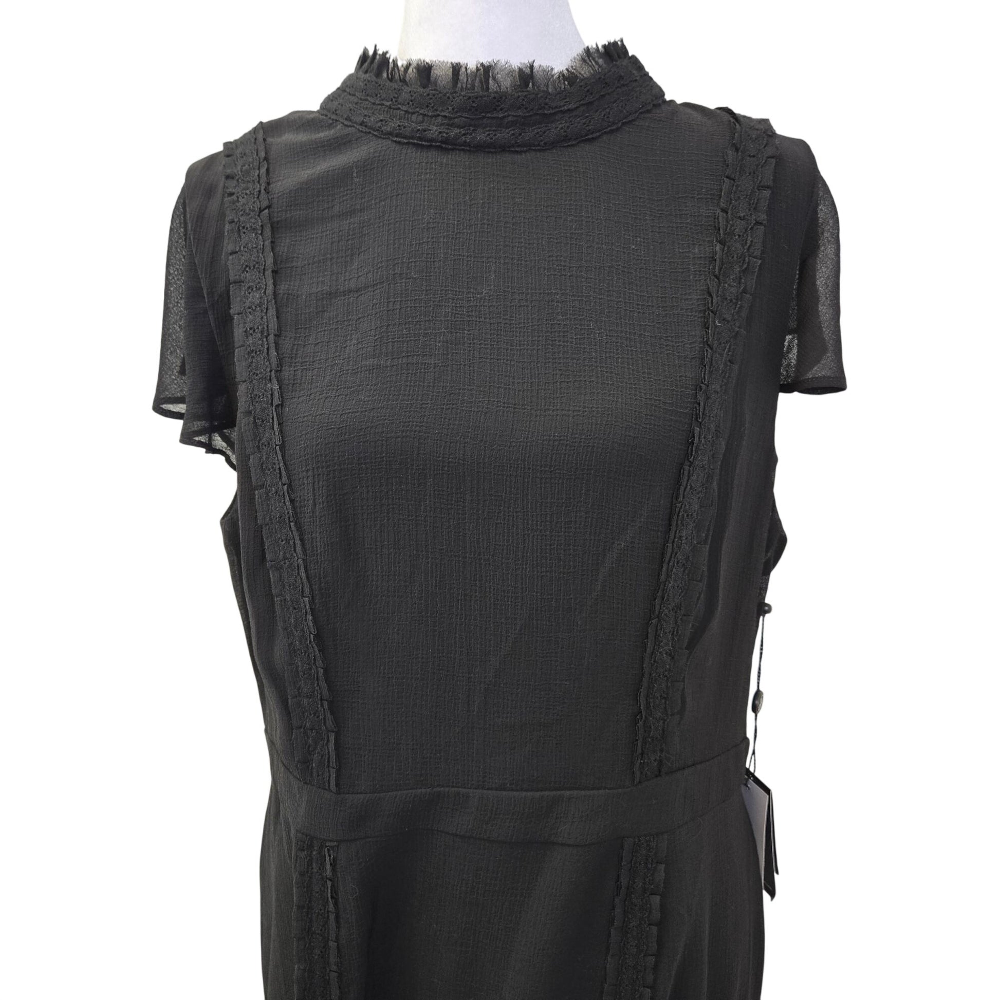 This short sleeve dress is designed with sheer chiffon fabric that is fully lined. Feminine fit and flare dress has a sophisticated mock neck collar, sheer flutter sleeves, and a ruffle hem with ruffled trim throughout