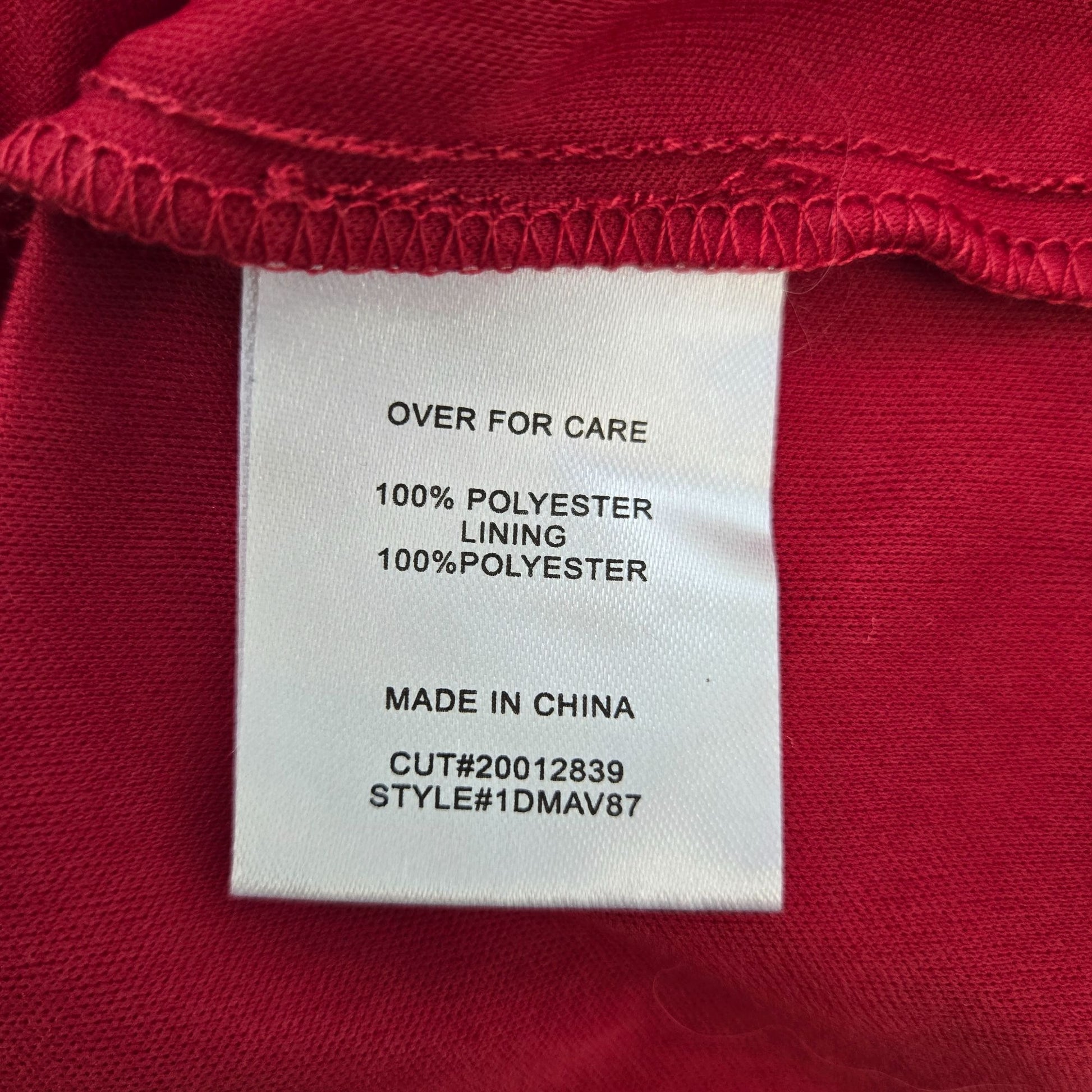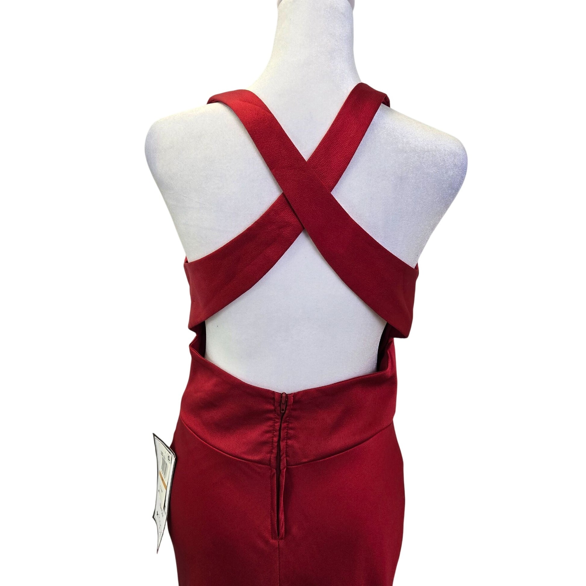 Gorgeous red dress that is definitely for a special occasion like prom, homecoming, bridesmaid dress, etc. Large rose applique design on the front. The back is open to the small of the back with a zipper closure. Criss-cross halter style straps.