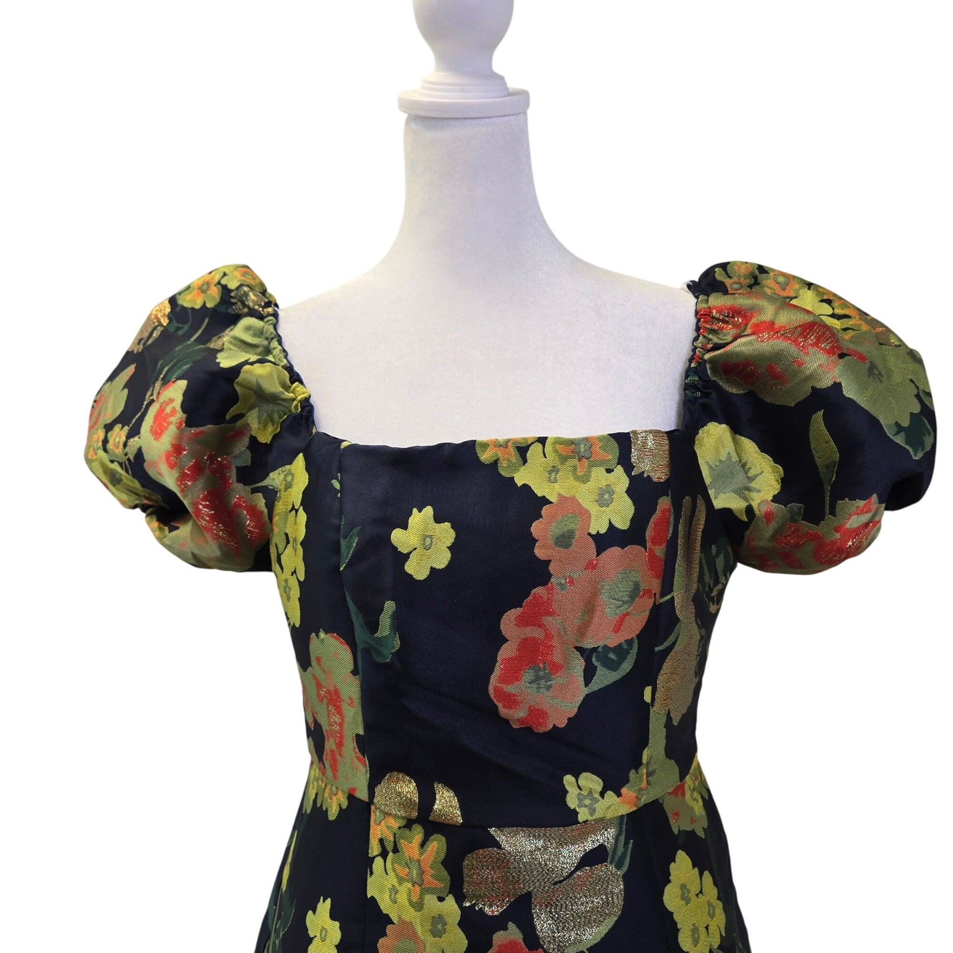 Gorgeous floral print mini dress that has gold metallic accents. Square neckline, puff shoulders and back zip closure.