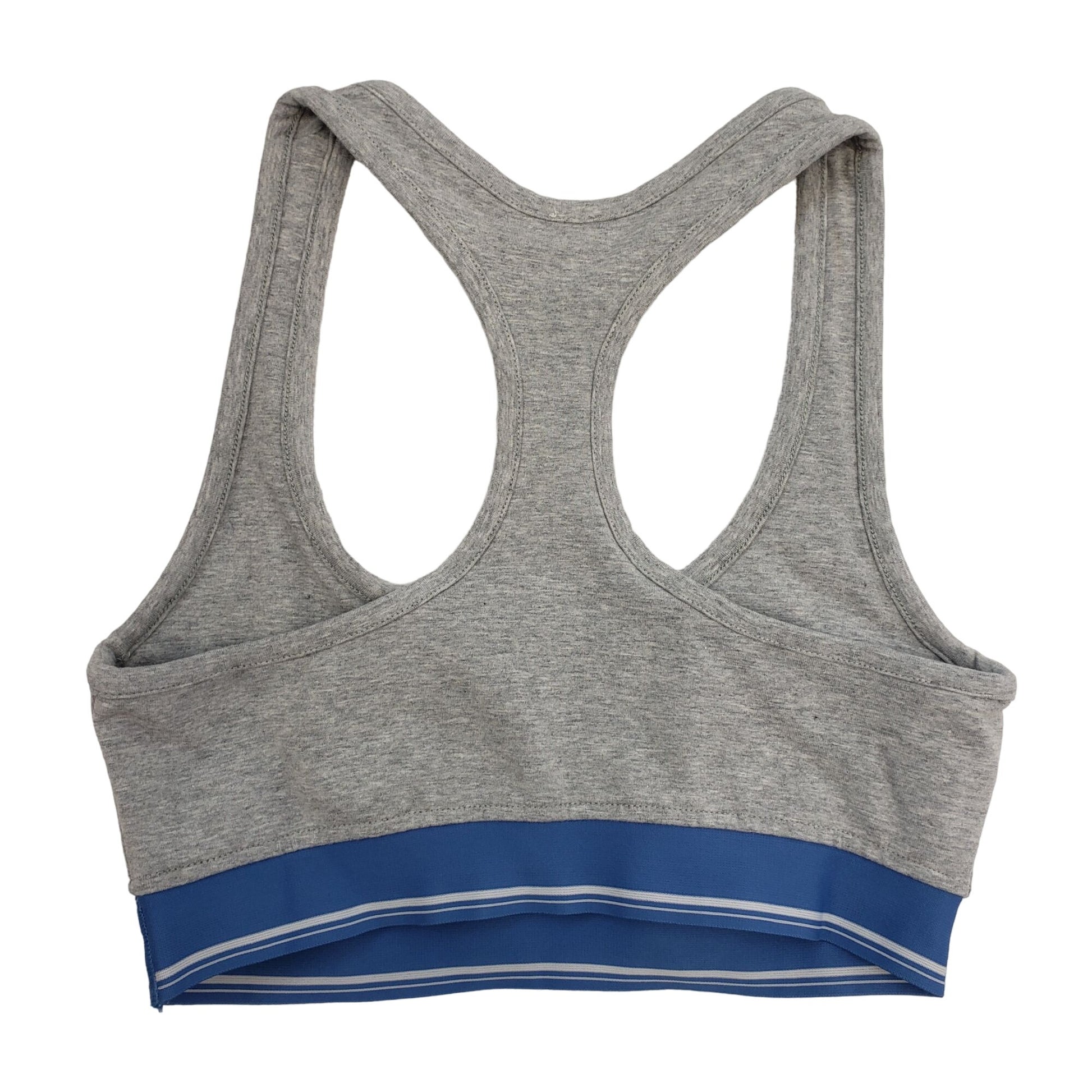 Adorable gray heather sports bra with a blue trim. Great for any active day walking, a yoga class or just wear under a button down shirt with some shorts.