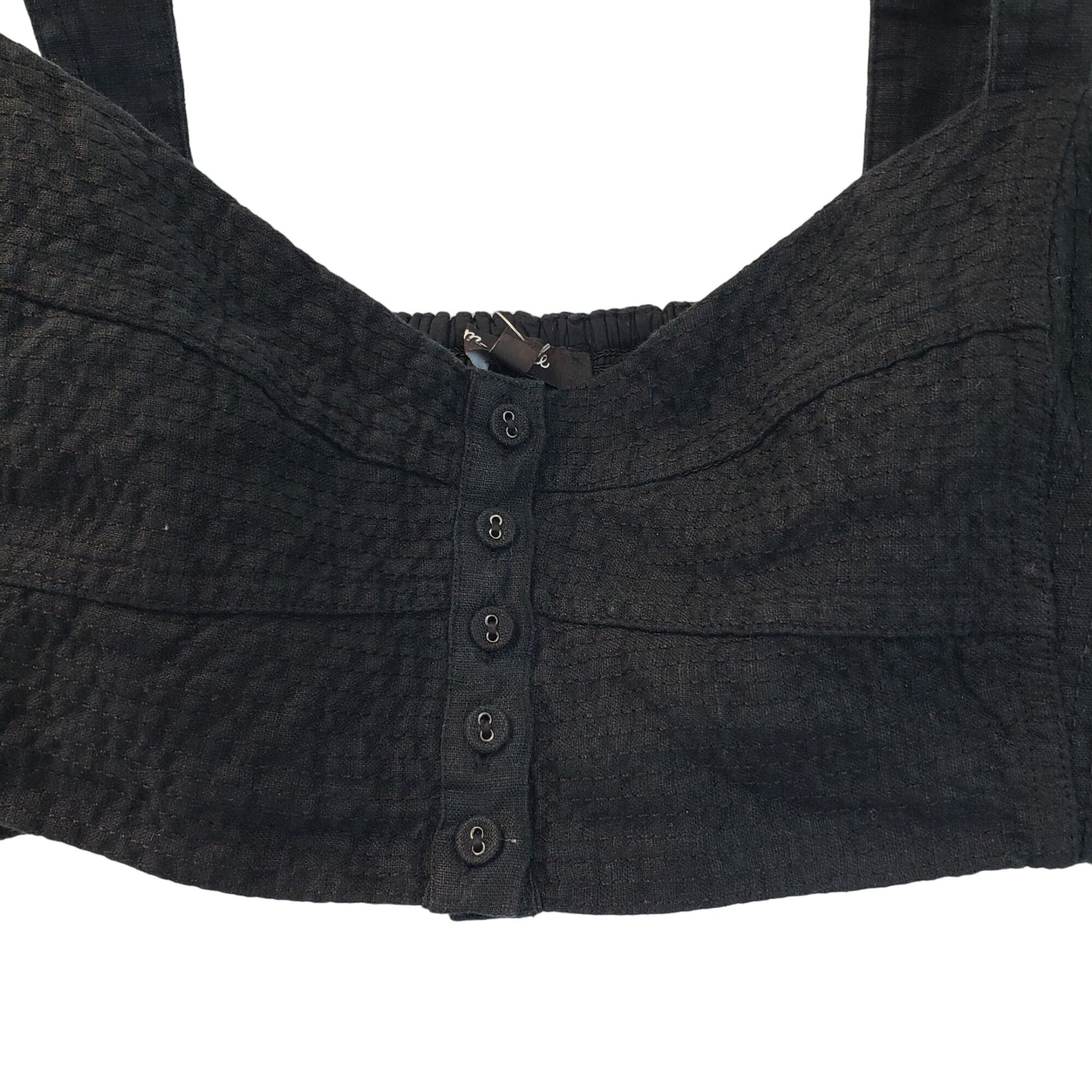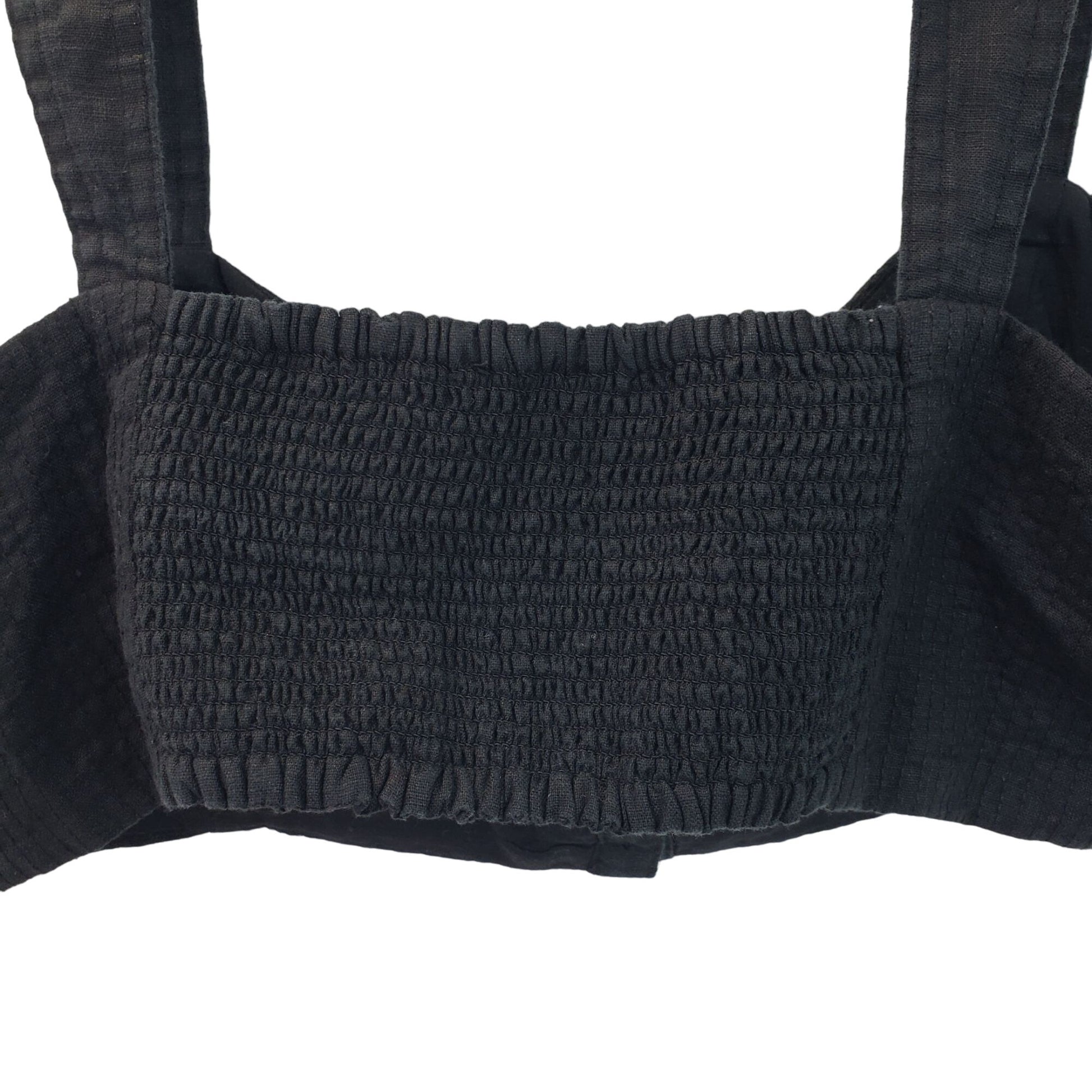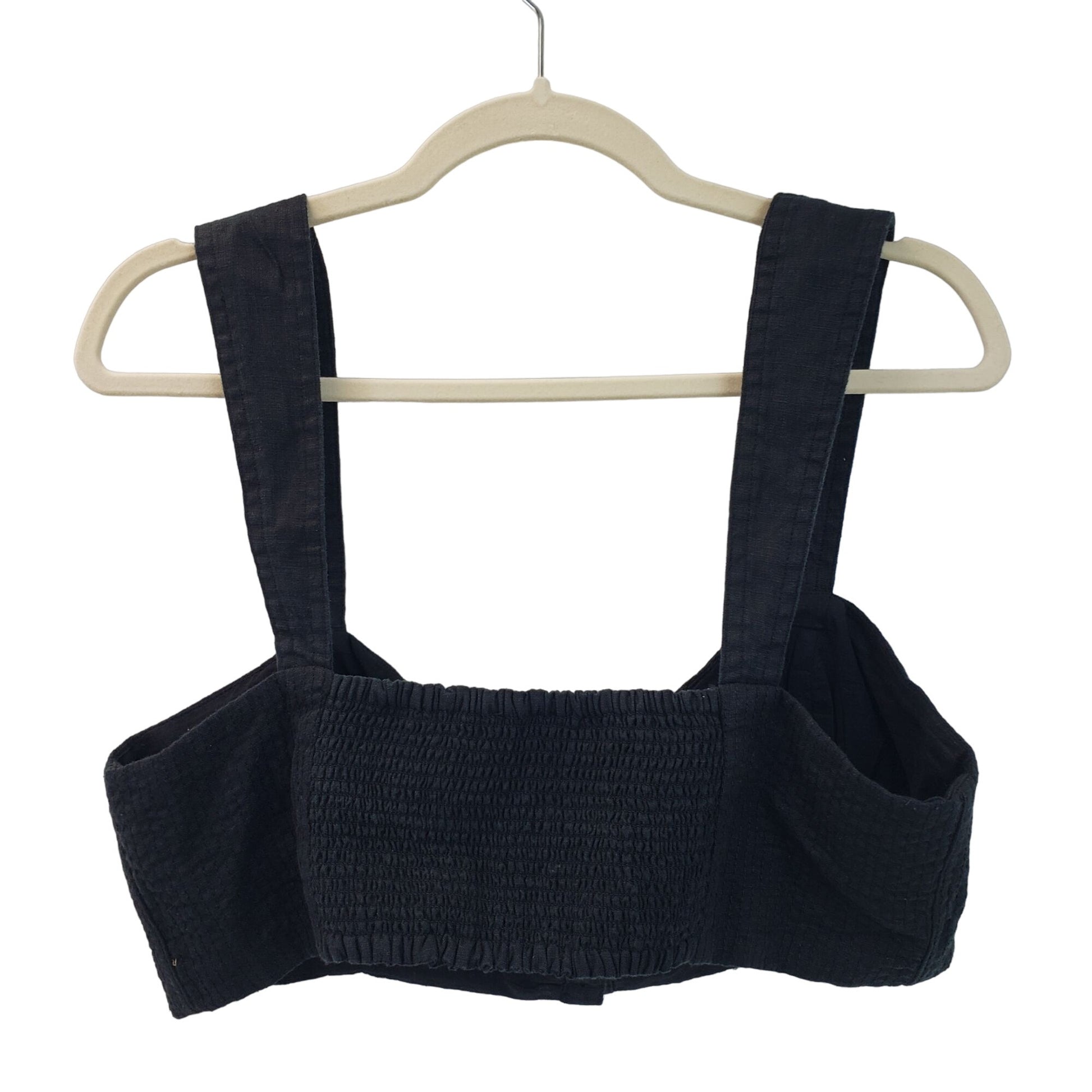 Adorable little crop top that is 100% linen and has smocking detail in the back. Extra wide straps and button detail down the front. This is also a little textured with some seaming detail on the front. Great to wear to a summer party or festival.