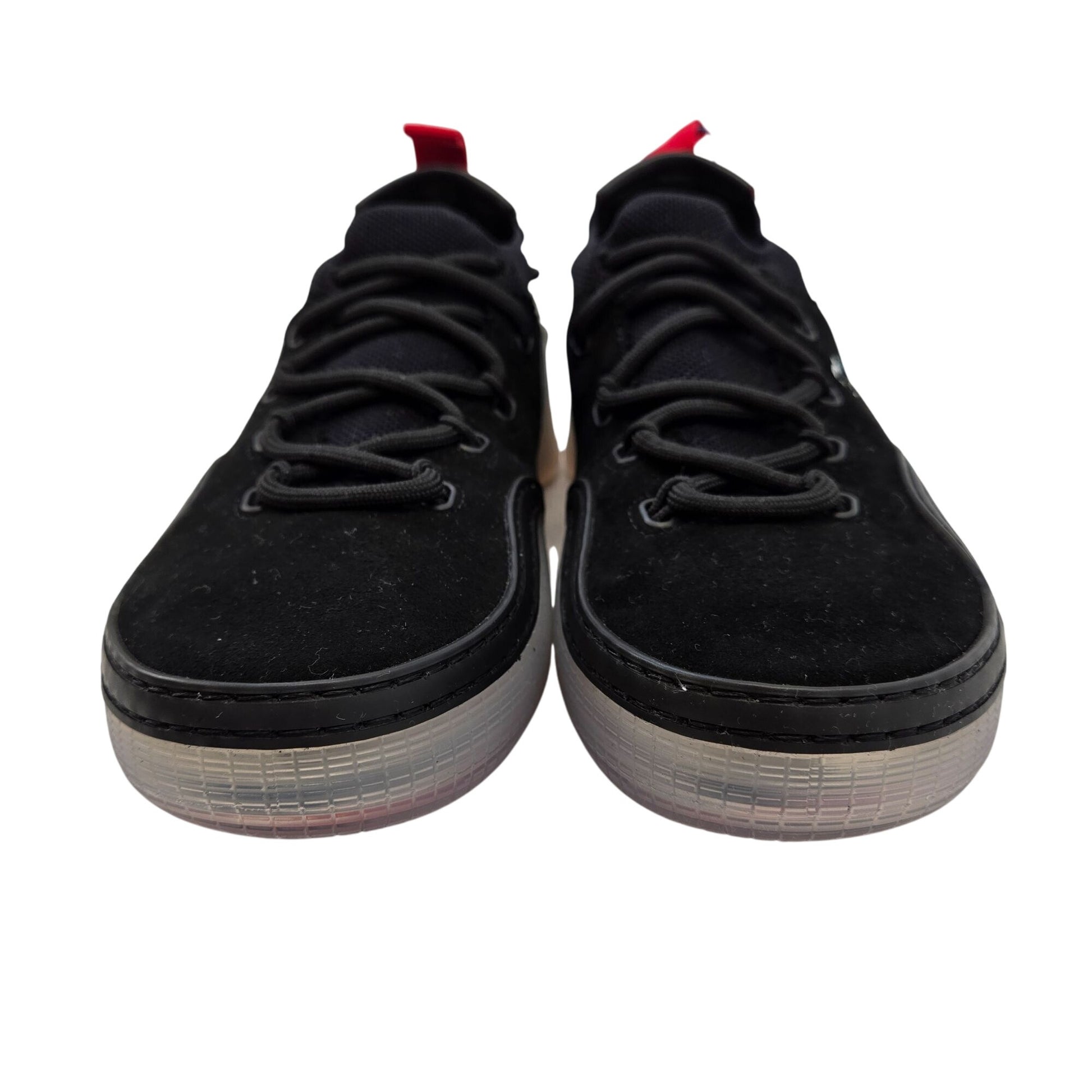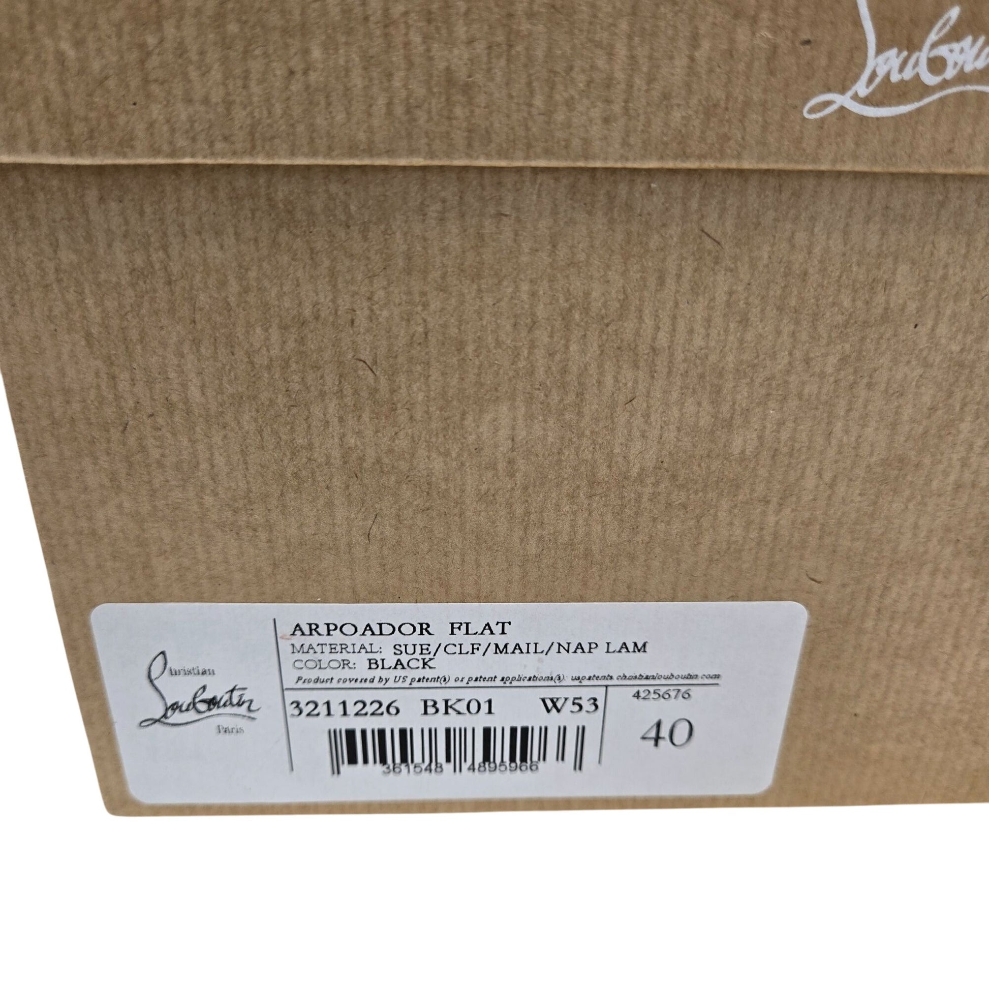 The Christian Louboutin Arpoador Flat in Black is a sporty, all-terrain slip-on sneaker crafted in Italy with a black suede and mesh upper, featuring transparent midsoles, spike accents at the heel, and signature red rubber outsoles. These comfortable, versatile sneakers are designed for elevated streetwear, city wear, and travel. These have been authenticated - see all pics.