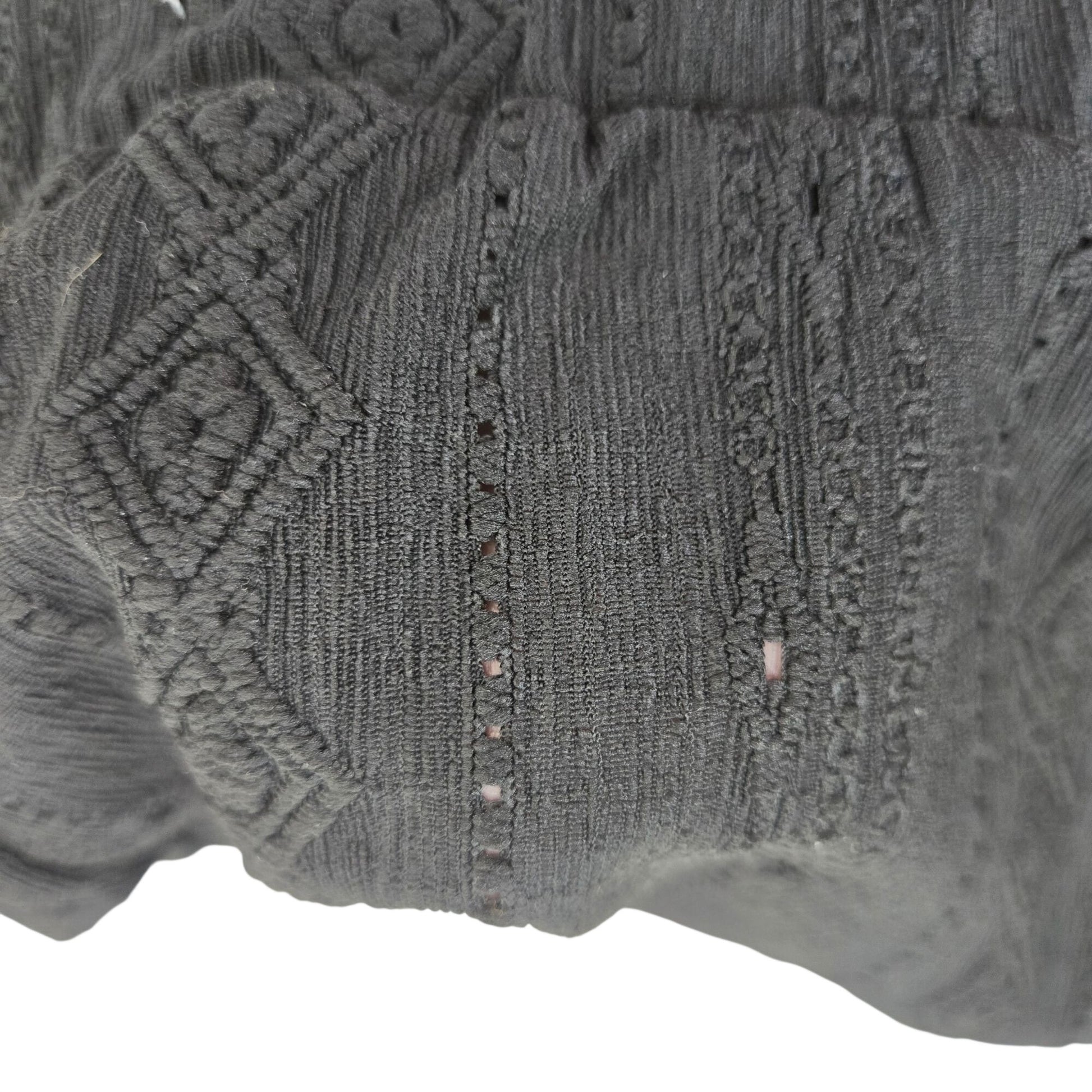 Really nice, light and flowy wide leg diamond embroidered pants that are a pull-on style with an elastic waistband. Small eyelet detail that creates some sheerness to the pants. See 2nd to last pic for details.