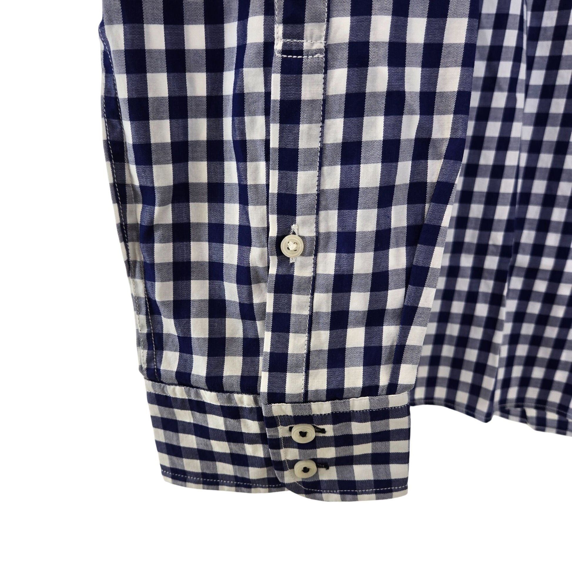 Classic cotton button down shirt that has a gingham print design and three button closure at the arm/wrist.