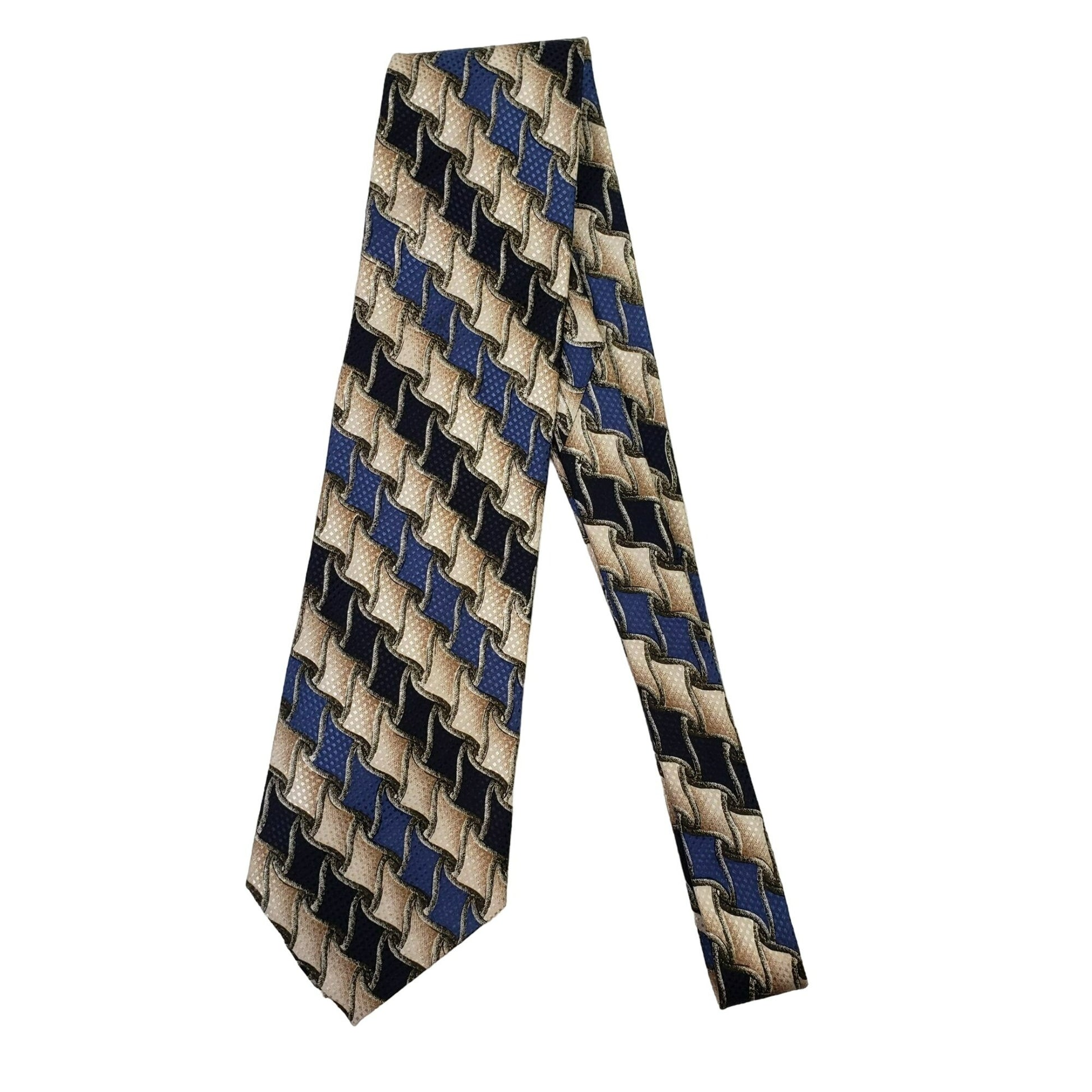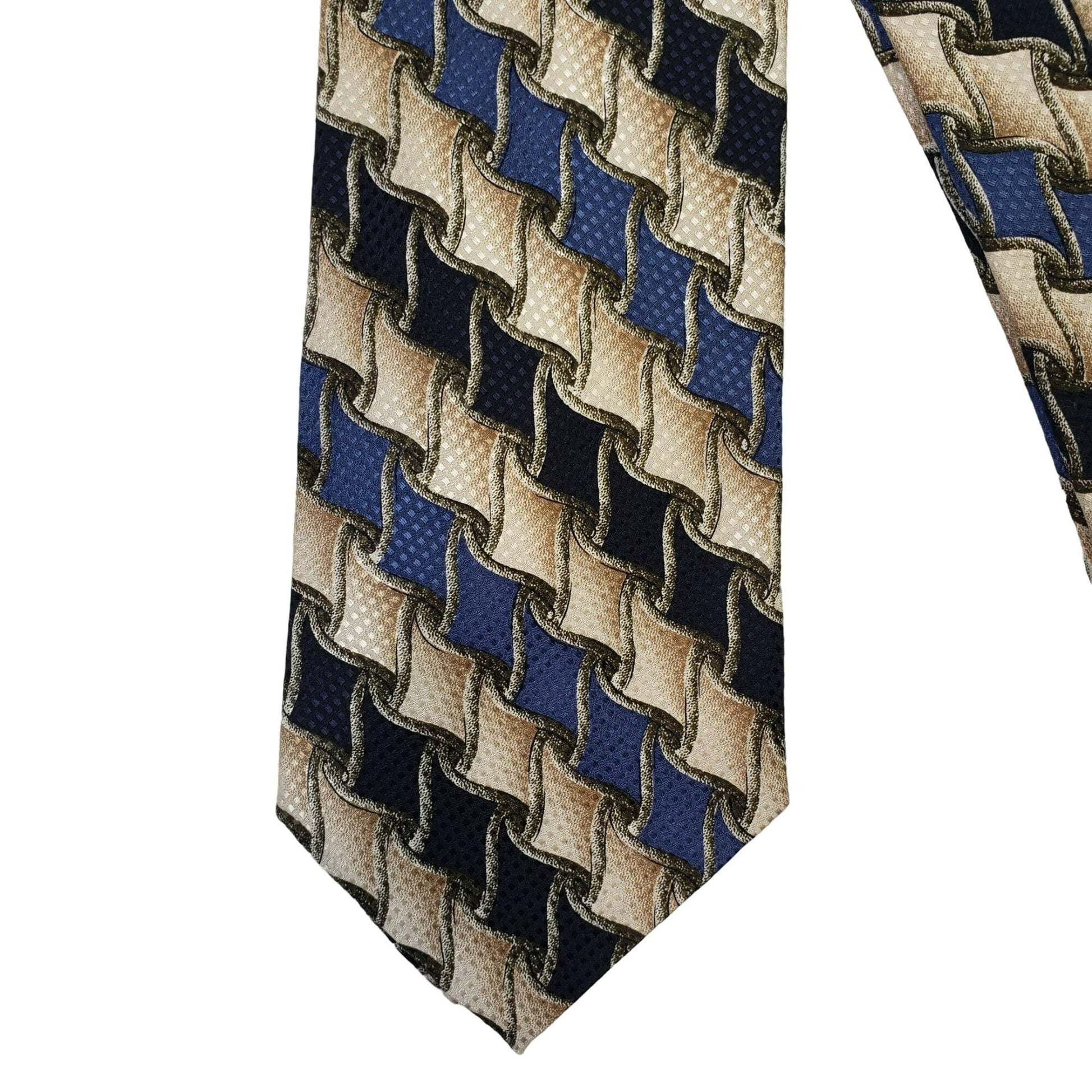 Really great 100% silk tie with a nice blue and tan pattern that looks almost like a chain link or a weave. Great for work or a more formal event.